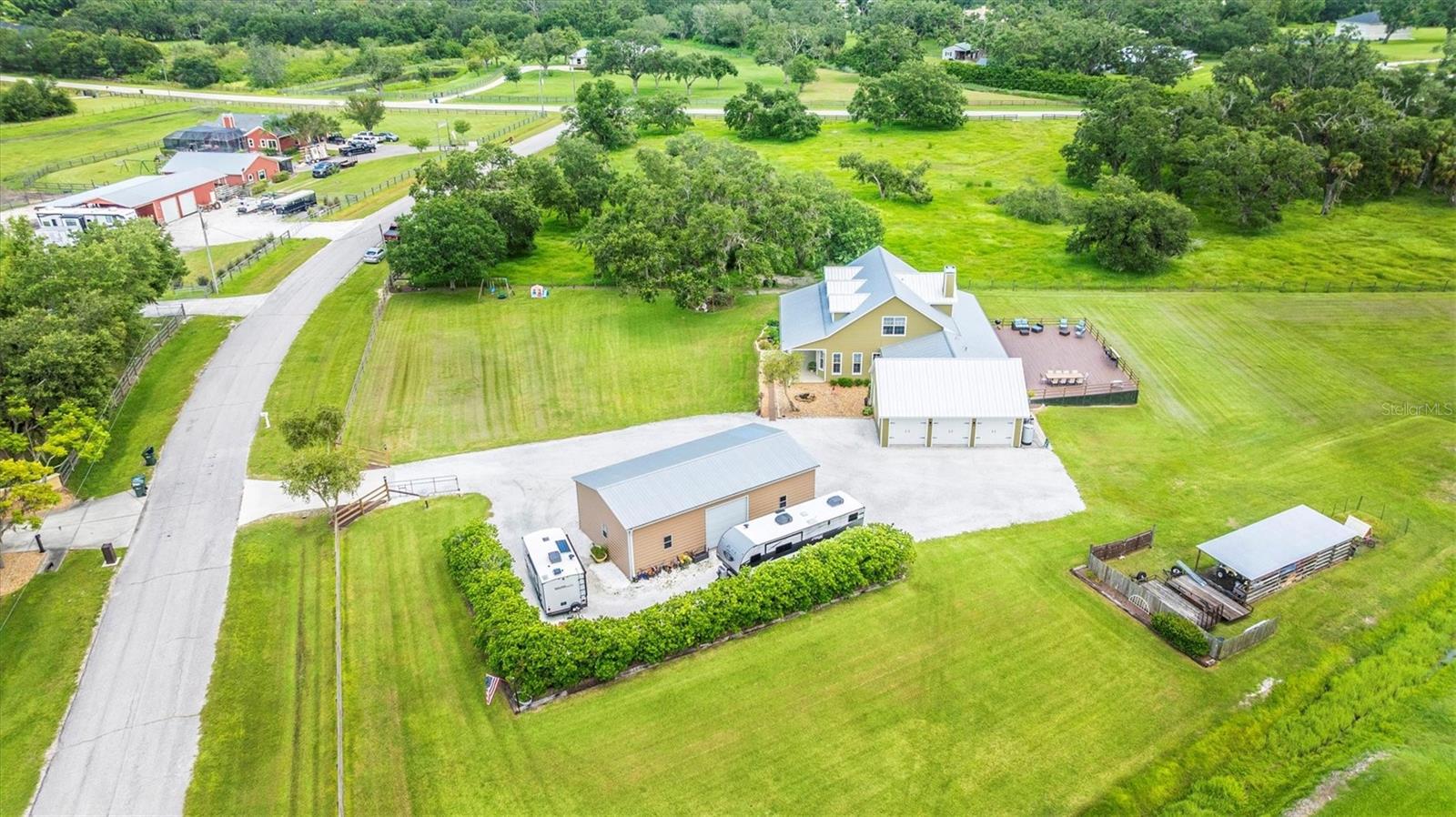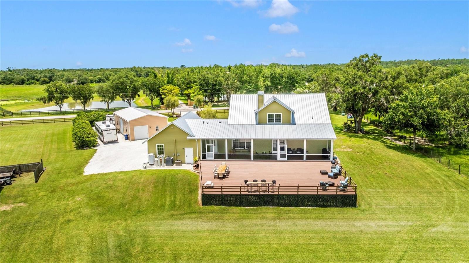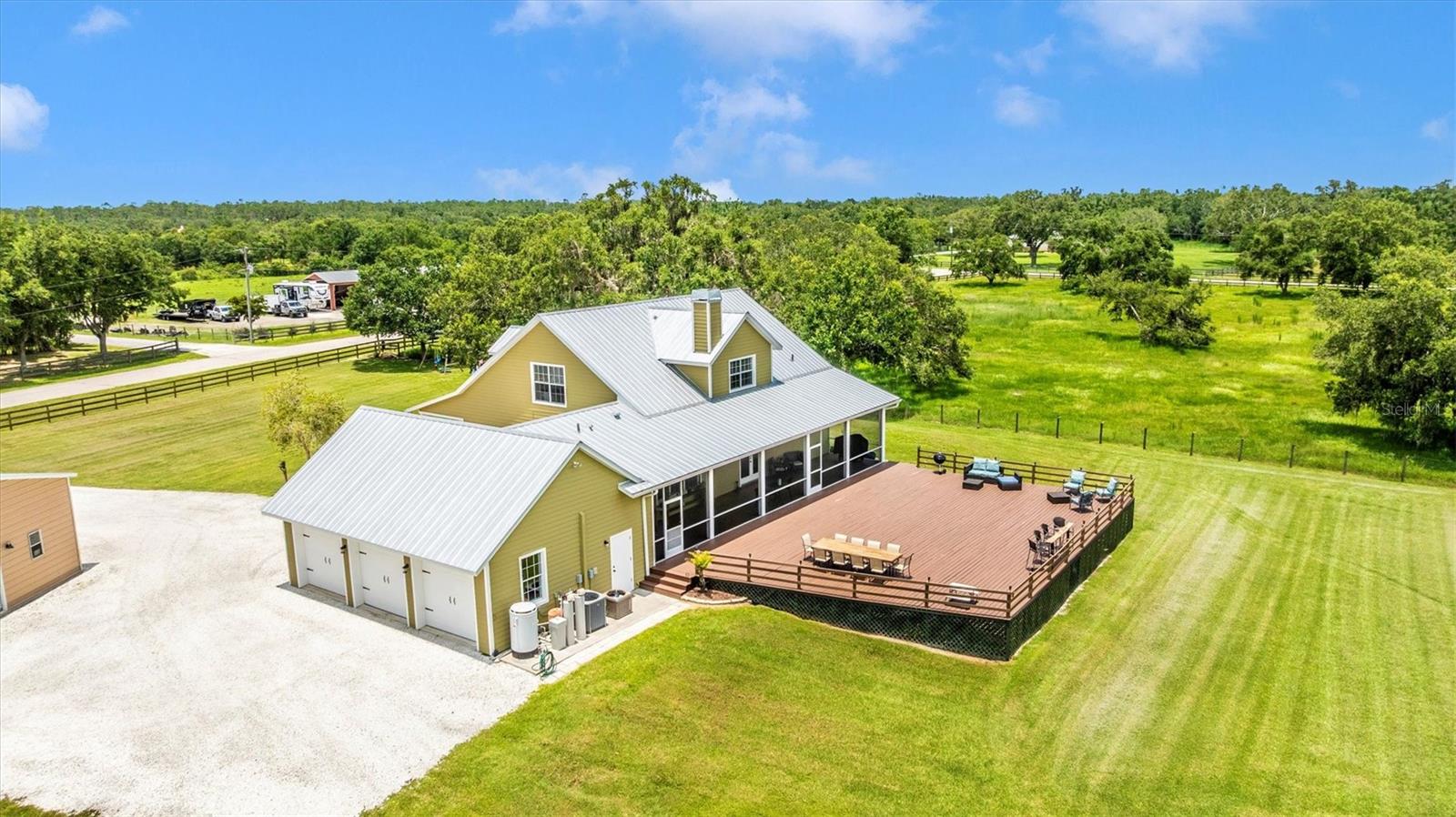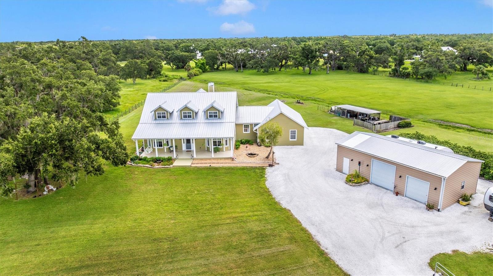 Welcome to your own private country retreat, nestled on nearly five acres of fenced land. This unique 3-bedroom, 2.5 bathroom home with soaring ceilings and lots of natural light blends rustic charm with modern comfort and is accessed by a pristine shell driveway. Meticulously maintained with new metal roof in 2020. The main level features a primary bedroom with an en-suite bathroom and walk-in closet. The separate laundry room is on the main level. Upstairs, two additional bedrooms share a large landing area—a versatile bonus space perfect for a home office, with a large window overlooking the view of the land. The outdoor space is just as impressive. A large, east-facing deck is perfectly positioned for tranquil mornings and enjoying stunning sunrise views over the acreage, which is framed by majestic oak trees. It’s common to see deer and Sand Hill Cranes and Whistling ducks on the property. Did you make us coffee yet? Swing on the front porch and listen to the song birds. Beyond the attached 3-car garage, a separate oversized detached garage and workshop provides a haven for hobbyists or car enthusiasts. This space is equipped with three roll-up doors and a vehicle lift. For equestrian or animal lovers, there’s a three-sided shed with two pens and two open stalls Landscaped shell parking provides plenty of room for RV, boat and guests. This estate is nestled in a community with horse trails, offering both privacy and outdoor adventure. Whether you’re seeking space for your passions, room for animals, or simply a serene lifestyle close to Sarasota, shopping, entertainment, dining, beaches, boat ramp, 1901 Joshua Drive delivers it all—land, lifestyle, and lasting value.