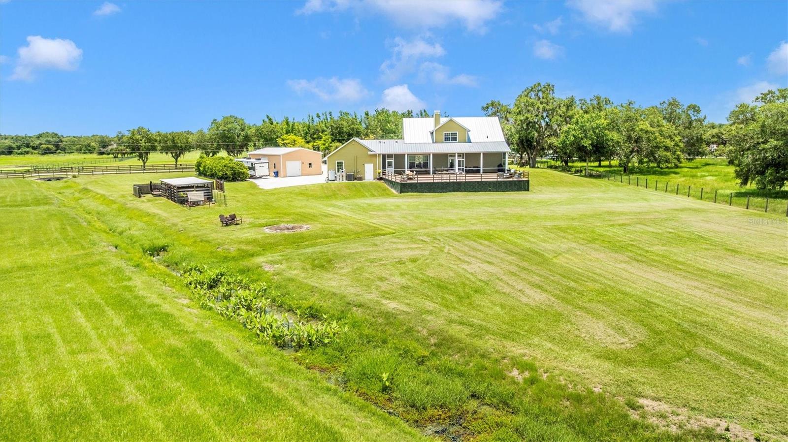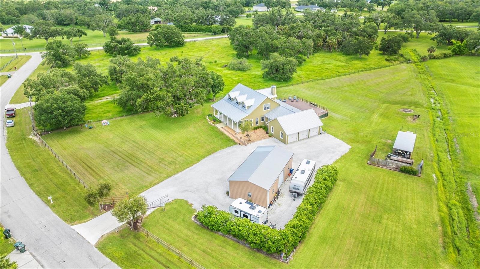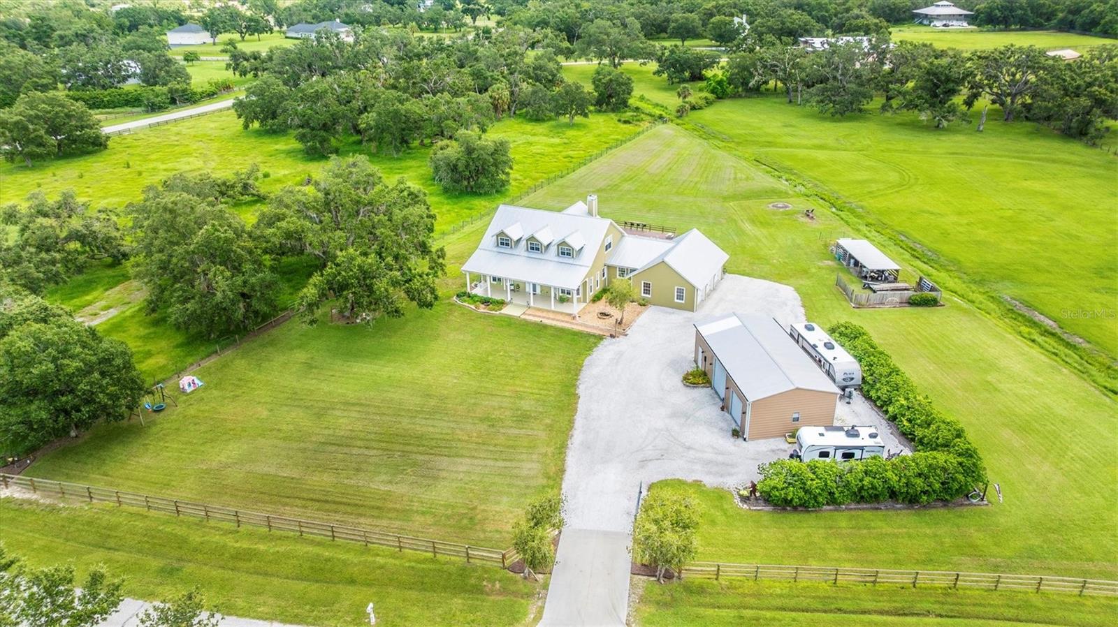 Welcome to your own private country retreat, nestled on nearly five acres of fenced land. This unique 3-bedroom, 2.5 bathroom home with soaring ceilings and lots of natural light blends rustic charm with modern comfort and is accessed by a pristine shell driveway. Meticulously maintained with new metal roof in 2020. The main level features a primary bedroom with an en-suite bathroom and walk-in closet. The separate laundry room is on the main level. Upstairs, two additional bedrooms share a large landing area—a versatile bonus space perfect for a home office, with a large window overlooking the view of the land. The outdoor space is just as impressive. A large, east-facing deck is perfectly positioned for tranquil mornings and enjoying stunning sunrise views over the acreage, which is framed by majestic oak trees. It’s common to see deer and Sand Hill Cranes and Whistling ducks on the property. Did you make us coffee yet? Swing on the front porch and listen to the song birds. Beyond the attached 3-car garage, a separate oversized detached garage and workshop provides a haven for hobbyists or car enthusiasts. This space is equipped with three roll-up doors and a vehicle lift. For equestrian or animal lovers, there’s a three-sided shed with two pens and two open stalls Landscaped shell parking provides plenty of room for RV, boat and guests. This estate is nestled in a community with horse trails, offering both privacy and outdoor adventure. Whether you’re seeking space for your passions, room for animals, or simply a serene lifestyle close to Sarasota, shopping, entertainment, dining, beaches, boat ramp, 1901 Joshua Drive delivers it all—land, lifestyle, and lasting value.