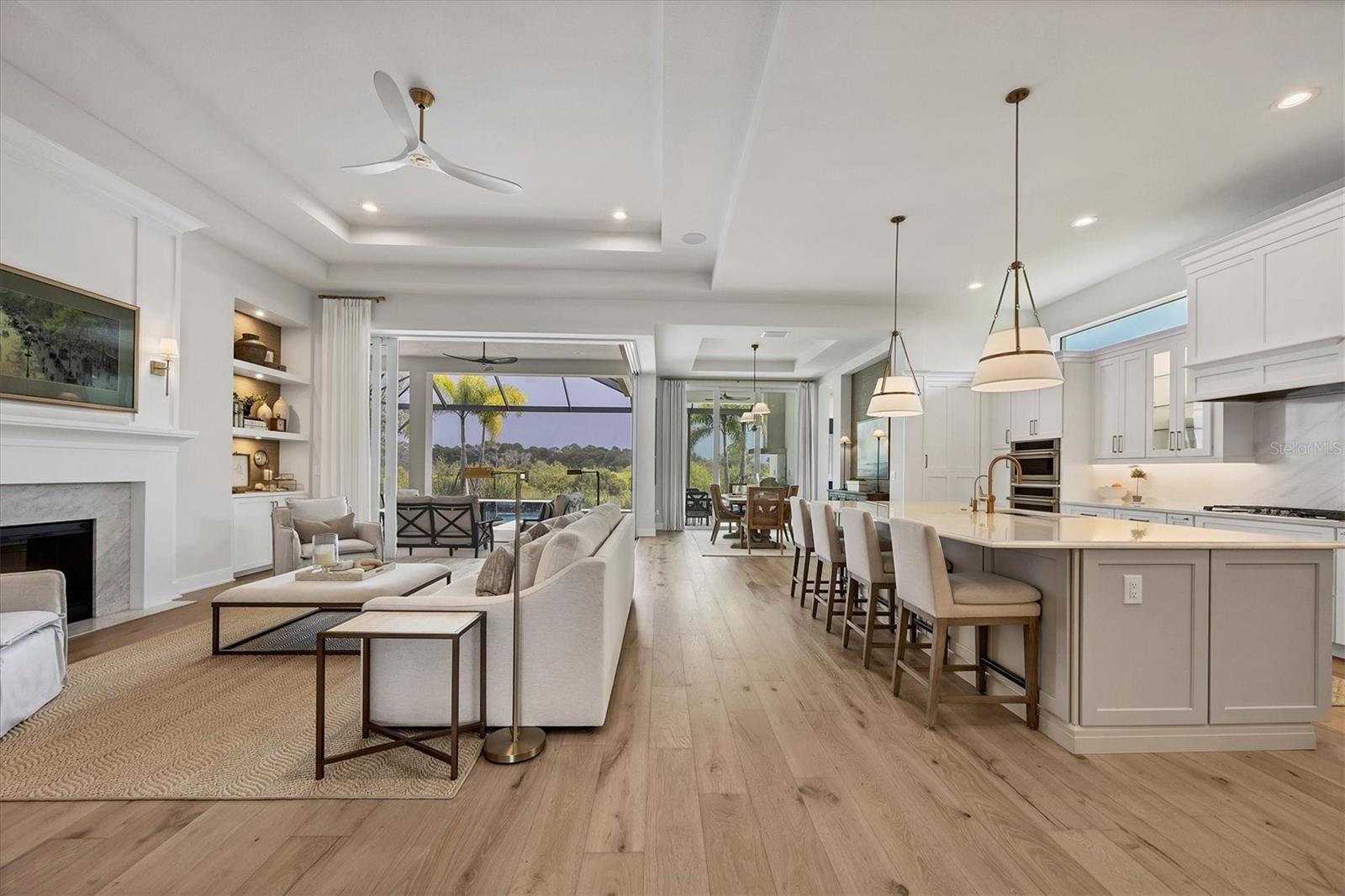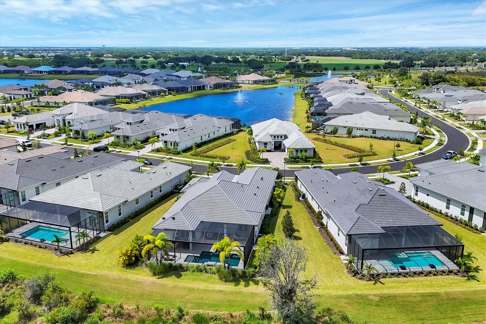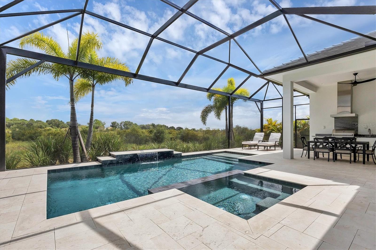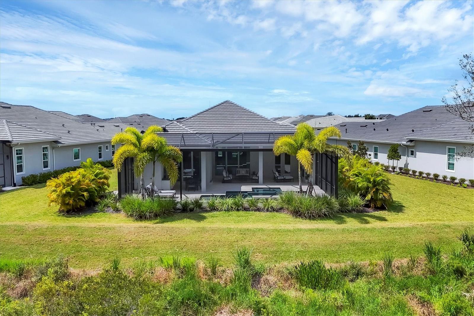 Welcome to 8368 Sea Glass Court in Wild Blue, a custom-built residence by Lee Wetherington, renowned for exceptional craftsmanship and attention to detail. This upscale home is set on a private preserve lot, offering a tranquil backdrop reminiscent of “The Serengeti” with captivating views of native wildlife and birds. Step through iron doors into a fully paneled foyer to experience the finest in design and detail. This custom home features engineered hardwood flooring throughout all living and bedroom areas and is secured with impact windows and doors. The great room impresses with a sleek electric fireplace, built-in bookcases, and a dramatic wall of corner disappearing glass doors that seamlessly frame breathtaking preserve views. Outdoors, your private oasis awaits. Enjoy a panoramic screen enclosure, expansive travertine paver lanai, a large covered sitting area with a second fireplace, and a separate alfresco dining space complete with a fully equipped outdoor kitchen. The sparkling saltwater pool with water feature and spa completes this resort-style retreat. The chef’s kitchen is a dream, showcasing abundant custom soft-close wood cabinetry, Cambria countertops, a large working island with breakfast bar seating and pendant lighting, upgraded appliances, and an oversized walk-in pantry with custom wood shelving. The dining room flows easily from the kitchen and extends outdoors with sliding glass doors to the lanai—ideal for entertaining. A private den near the entry provides the perfect work-from-home space. The primary suite is a true sanctuary with French doors to the lanai and a spa-inspired primary bath featuring split vanities, a freestanding soaking tub, and an oversized walk-in marble shower, with marble floors that extend into the custom-fitted walk-in closet. For added convenience, the closet connects directly to the spacious laundry room. Guests will enjoy two ensuite bedrooms, each offering privacy and comfort. Additional highlights include a whole-house generator for peace of mind, full house water softener and reverse osmosis water filtration system, a three-car garage with epoxy flooring and built in tesla car charger, tray ceilings, extensive wood trim details, library paneling, crown moldings, upgraded light fixtures and fans, plantation shutters, and custom drapery throughout. Set within the desirable enclave of Wild Blue at Waterside, this residence is complemented by an array of world-class amenities. The upcoming 25,000-square-foot resort-style clubhouse will feature private dining, a theater, fitness studio, golf simulator, workout classrooms, and indoor and outdoor dining options. Outdoors, enjoy a spectacular pool complex with a resort-style pool, lap pool, yoga lawn and premier putting course, curated by a dedicated lifestyle director who brings together neighbors with engaging social events. Already open, the Midway Sports Complex enhances the community experience with pickleball and tennis courts, basketball, a dog park, sports activity areas, a kayak launch and scenic lakefront viewing. Schedule your private showing today to view this beautiful home!