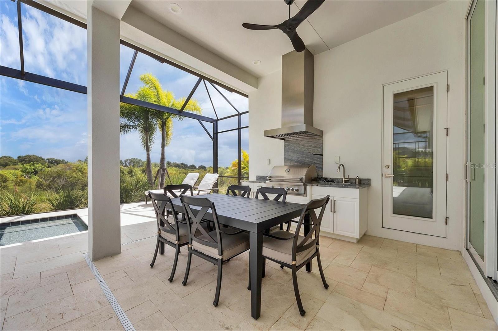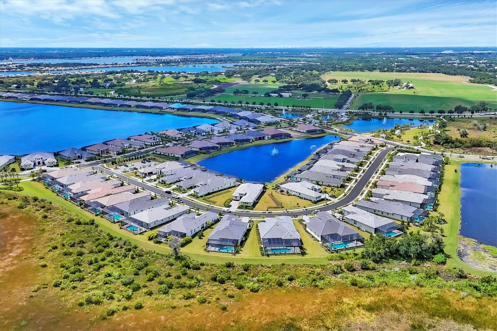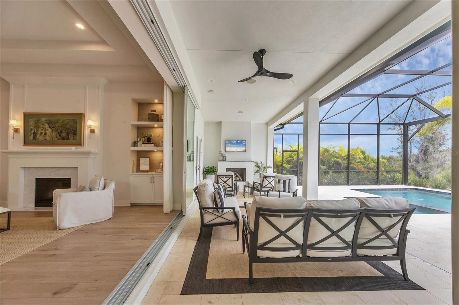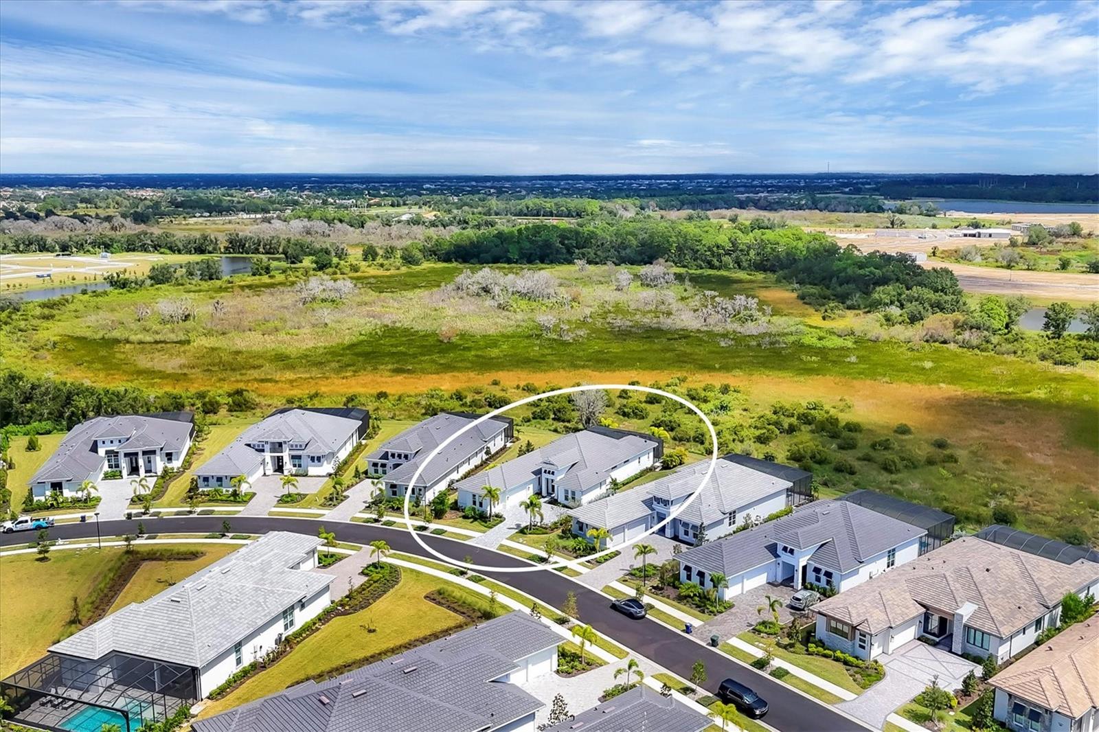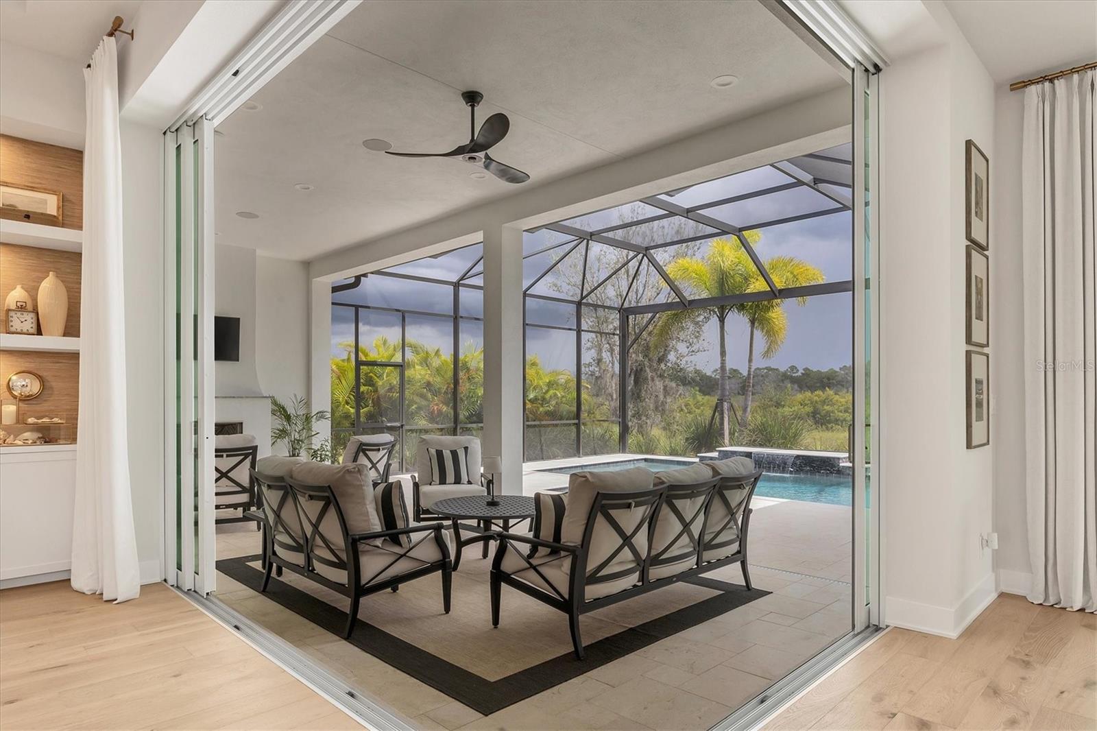 Welcome to 8368 Sea Glass Court in Wild Blue, a custom-built residence by Lee Wetherington, renowned for exceptional craftsmanship and attention to detail. This upscale home is set on a private preserve lot, offering a tranquil backdrop reminiscent of “The Serengeti” with captivating views of native wildlife and birds. Step through iron doors into a fully paneled foyer to experience the finest in design and detail. This custom home features engineered hardwood flooring throughout all living and bedroom areas and is secured with impact windows and doors. The great room impresses with a sleek electric fireplace, built-in bookcases, and a dramatic wall of corner disappearing glass doors that seamlessly frame breathtaking preserve views. Outdoors, your private oasis awaits. Enjoy a panoramic screen enclosure, expansive travertine paver lanai, a large covered sitting area with a second fireplace, and a separate alfresco dining space complete with a fully equipped outdoor kitchen. The sparkling saltwater pool with water feature and spa completes this resort-style retreat. The chef’s kitchen is a dream, showcasing abundant custom soft-close wood cabinetry, Cambria countertops, a large working island with breakfast bar seating and pendant lighting, upgraded appliances, and an oversized walk-in pantry with custom wood shelving. The dining room flows easily from the kitchen and extends outdoors with sliding glass doors to the lanai—ideal for entertaining. A private den near the entry provides the perfect work-from-home space. The primary suite is a true sanctuary with French doors to the lanai and a spa-inspired primary bath featuring split vanities, a freestanding soaking tub, and an oversized walk-in marble shower, with marble floors that extend into the custom-fitted walk-in closet. For added convenience, the closet connects directly to the spacious laundry room. Guests will enjoy two ensuite bedrooms, each offering privacy and comfort. Additional highlights include a whole-house generator for peace of mind, full house water softener and reverse osmosis water filtration system, a three-car garage with epoxy flooring and built in tesla car charger, tray ceilings, extensive wood trim details, library paneling, crown moldings, upgraded light fixtures and fans, plantation shutters, and custom drapery throughout. Set within the desirable enclave of Wild Blue at Waterside, this residence is complemented by an array of world-class amenities. The upcoming 25,000-square-foot resort-style clubhouse will feature private dining, a theater, fitness studio, golf simulator, workout classrooms, and indoor and outdoor dining options. Outdoors, enjoy a spectacular pool complex with a resort-style pool, lap pool, yoga lawn and premier putting course, curated by a dedicated lifestyle director who brings together neighbors with engaging social events. Already open, the Midway Sports Complex enhances the community experience with pickleball and tennis courts, basketball, a dog park, sports activity areas, a kayak launch and scenic lakefront viewing. Schedule your private showing today to view this beautiful home!