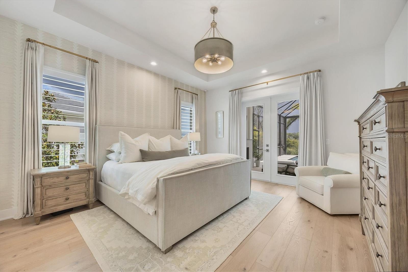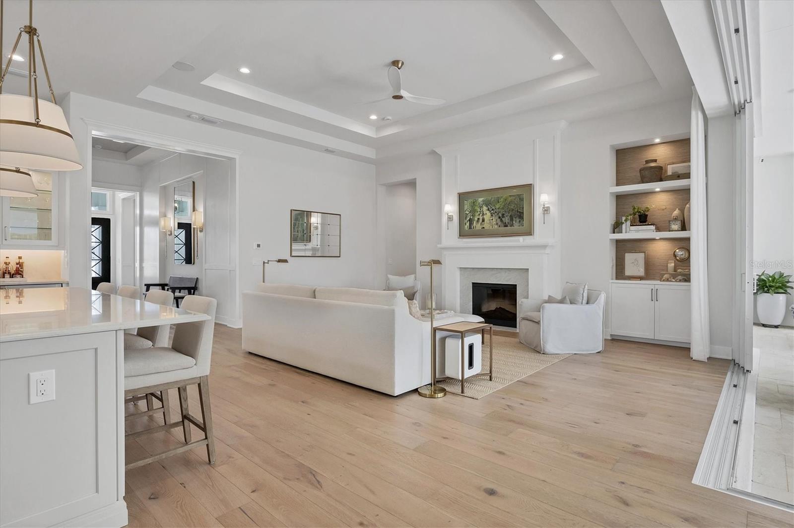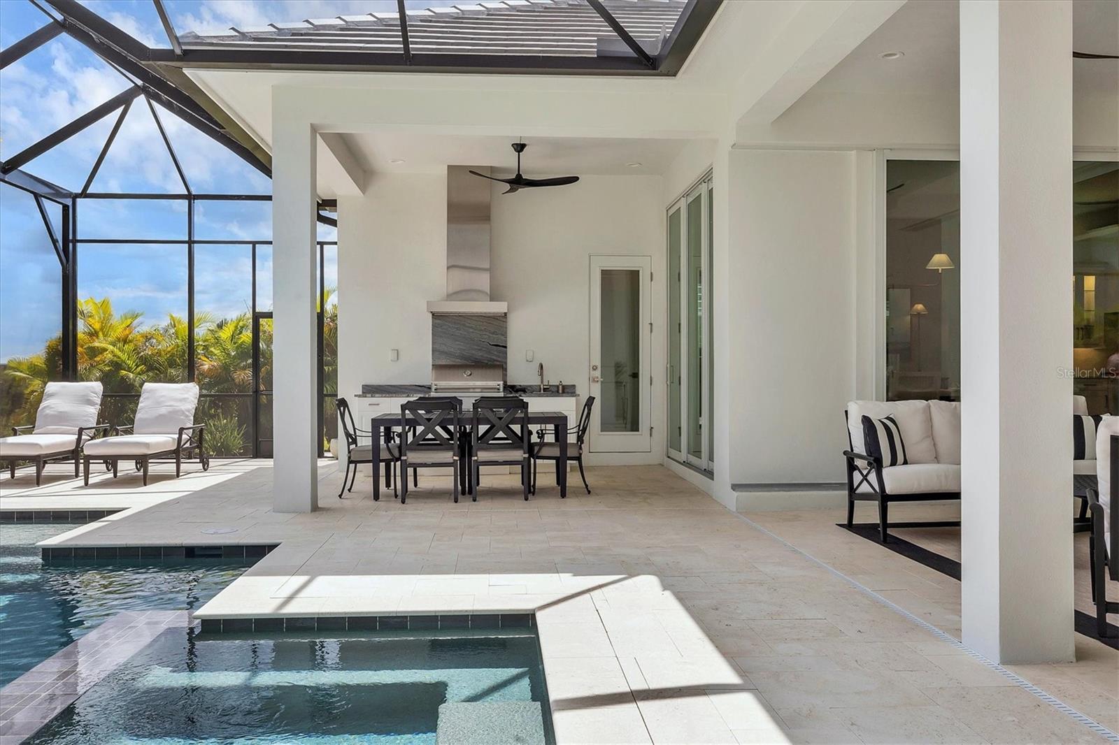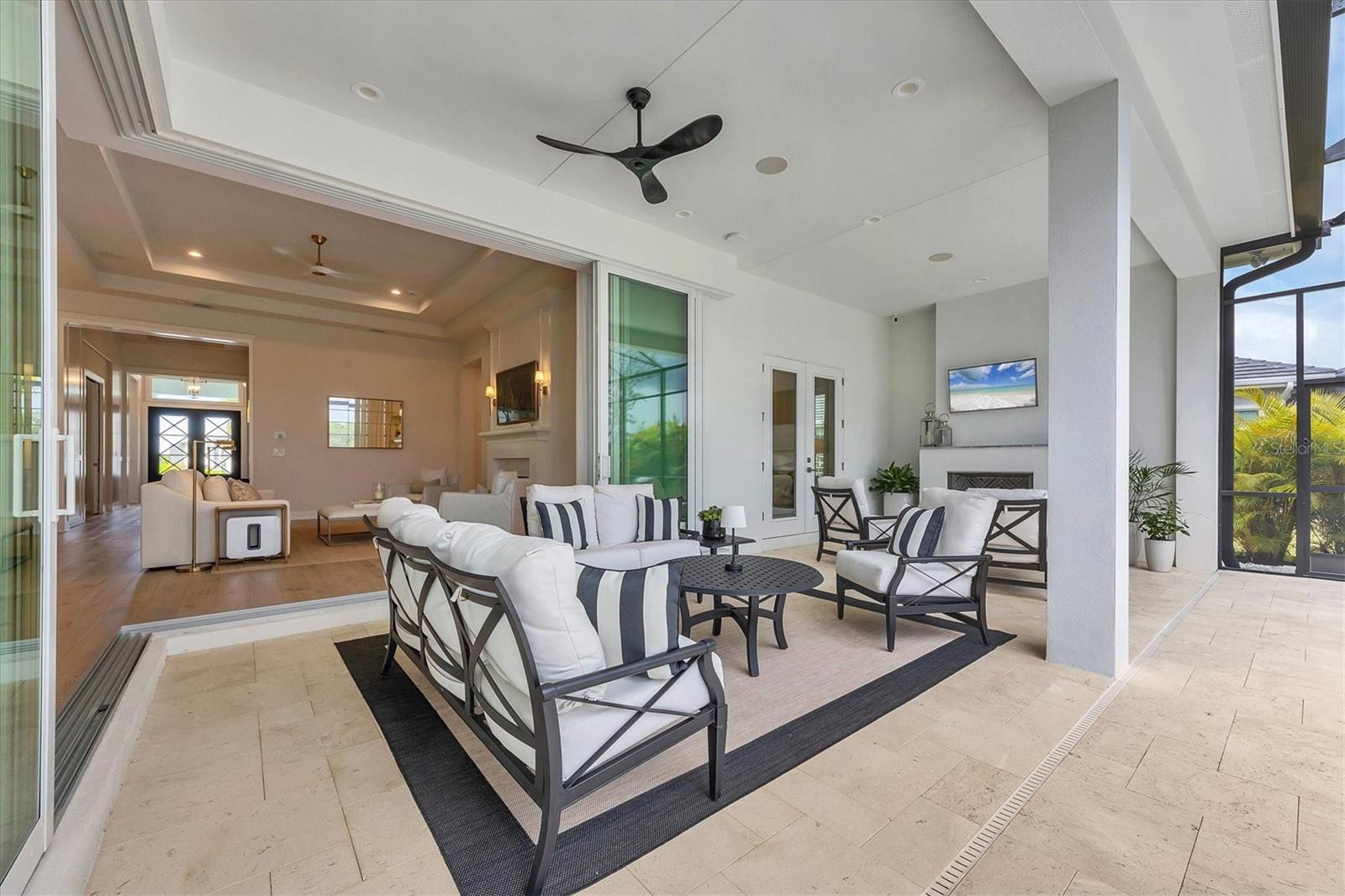 Welcome to 8368 Sea Glass Court in Wild Blue, a custom-built residence by Lee Wetherington, renowned for exceptional craftsmanship and attention to detail. This upscale home is set on a private preserve lot, offering a tranquil backdrop reminiscent of “The Serengeti” with captivating views of native wildlife and birds. Step through iron doors into a fully paneled foyer to experience the finest in design and detail. This custom home features engineered hardwood flooring throughout all living and bedroom areas and is secured with impact windows and doors. The great room impresses with a sleek electric fireplace, built-in bookcases, and a dramatic wall of corner disappearing glass doors that seamlessly frame breathtaking preserve views. Outdoors, your private oasis awaits. Enjoy a panoramic screen enclosure, expansive travertine paver lanai, a large covered sitting area with a second fireplace, and a separate alfresco dining space complete with a fully equipped outdoor kitchen. The sparkling saltwater pool with water feature and spa completes this resort-style retreat. The chef’s kitchen is a dream, showcasing abundant custom soft-close wood cabinetry, Cambria countertops, a large working island with breakfast bar seating and pendant lighting, upgraded appliances, and an oversized walk-in pantry with custom wood shelving. The dining room flows easily from the kitchen and extends outdoors with sliding glass doors to the lanai—ideal for entertaining. A private den near the entry provides the perfect work-from-home space. The primary suite is a true sanctuary with French doors to the lanai and a spa-inspired primary bath featuring split vanities, a freestanding soaking tub, and an oversized walk-in marble shower, with marble floors that extend into the custom-fitted walk-in closet. For added convenience, the closet connects directly to the spacious laundry room. Guests will enjoy two ensuite bedrooms, each offering privacy and comfort. Additional highlights include a whole-house generator for peace of mind, full house water softener and reverse osmosis water filtration system, a three-car garage with epoxy flooring and built in tesla car charger, tray ceilings, extensive wood trim details, library paneling, crown moldings, upgraded light fixtures and fans, plantation shutters, and custom drapery throughout. Set within the desirable enclave of Wild Blue at Waterside, this residence is complemented by an array of world-class amenities. The upcoming 25,000-square-foot resort-style clubhouse will feature private dining, a theater, fitness studio, golf simulator, workout classrooms, and indoor and outdoor dining options. Outdoors, enjoy a spectacular pool complex with a resort-style pool, lap pool, yoga lawn and premier putting course, curated by a dedicated lifestyle director who brings together neighbors with engaging social events. Already open, the Midway Sports Complex enhances the community experience with pickleball and tennis courts, basketball, a dog park, sports activity areas, a kayak launch and scenic lakefront viewing. Schedule your private showing today to view this beautiful home!