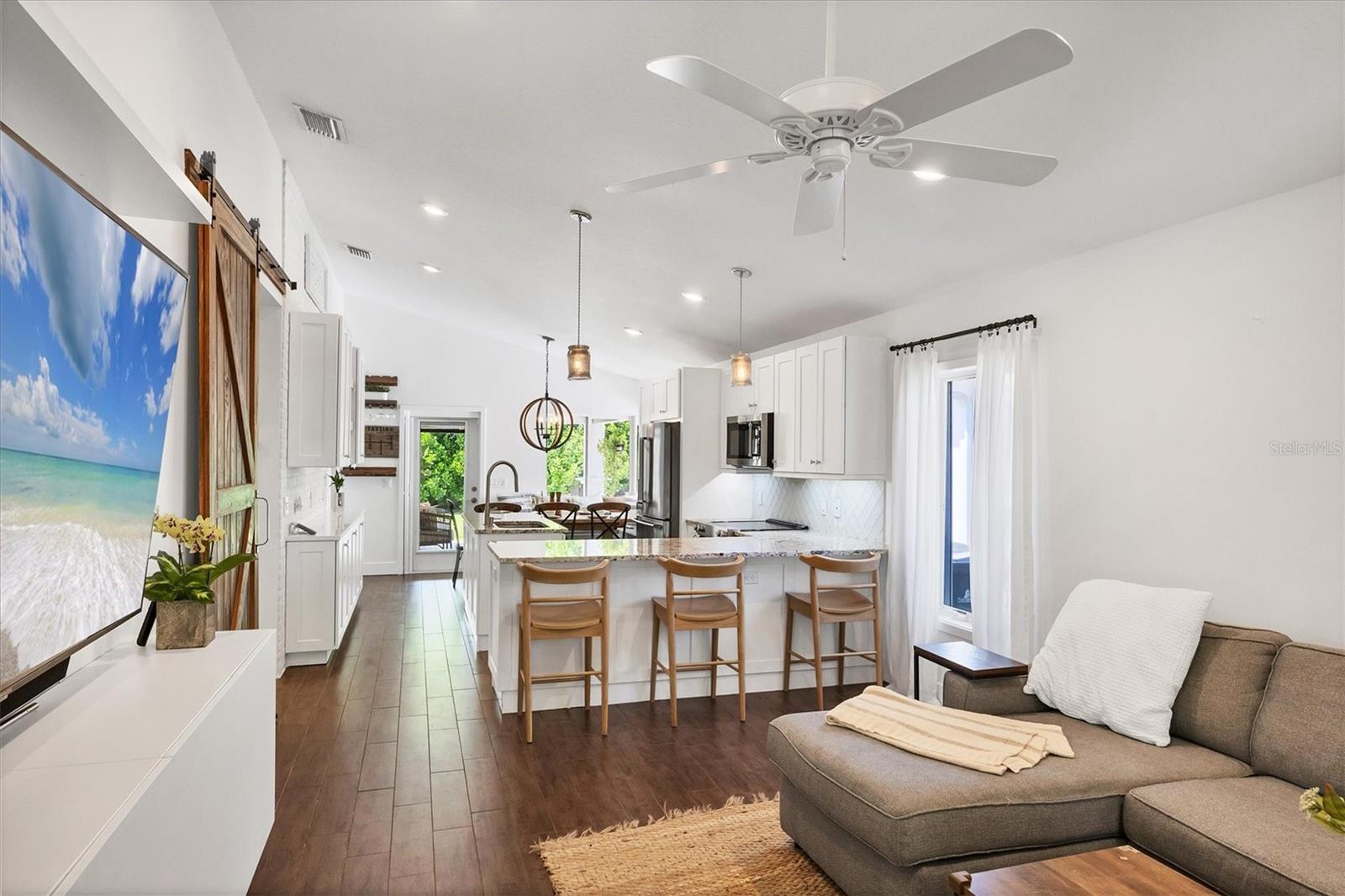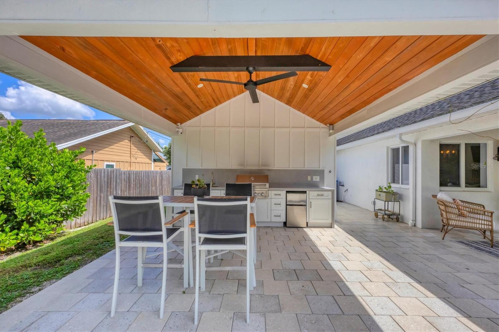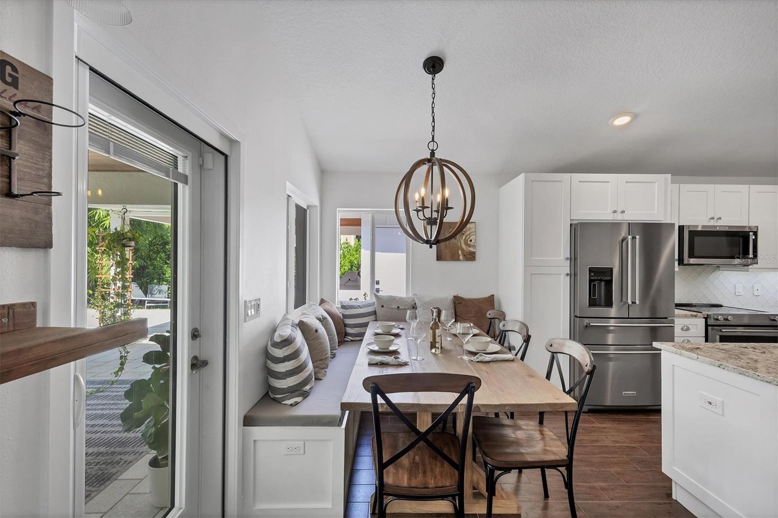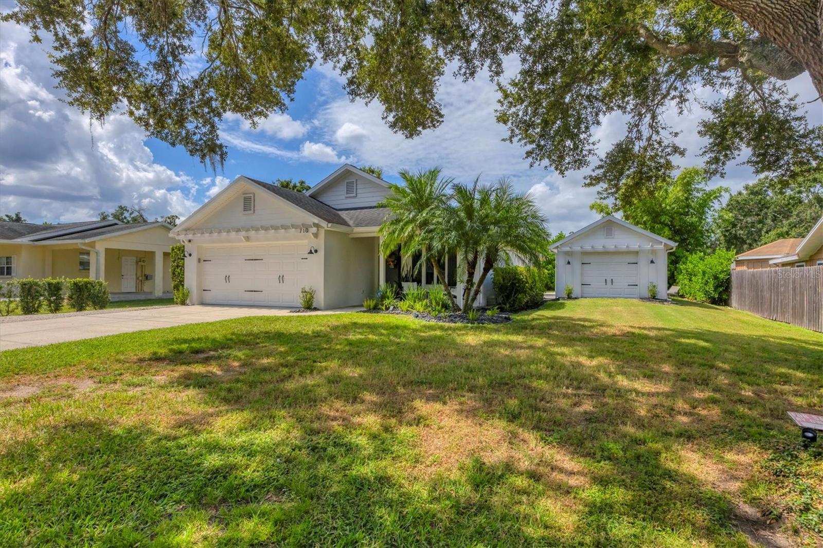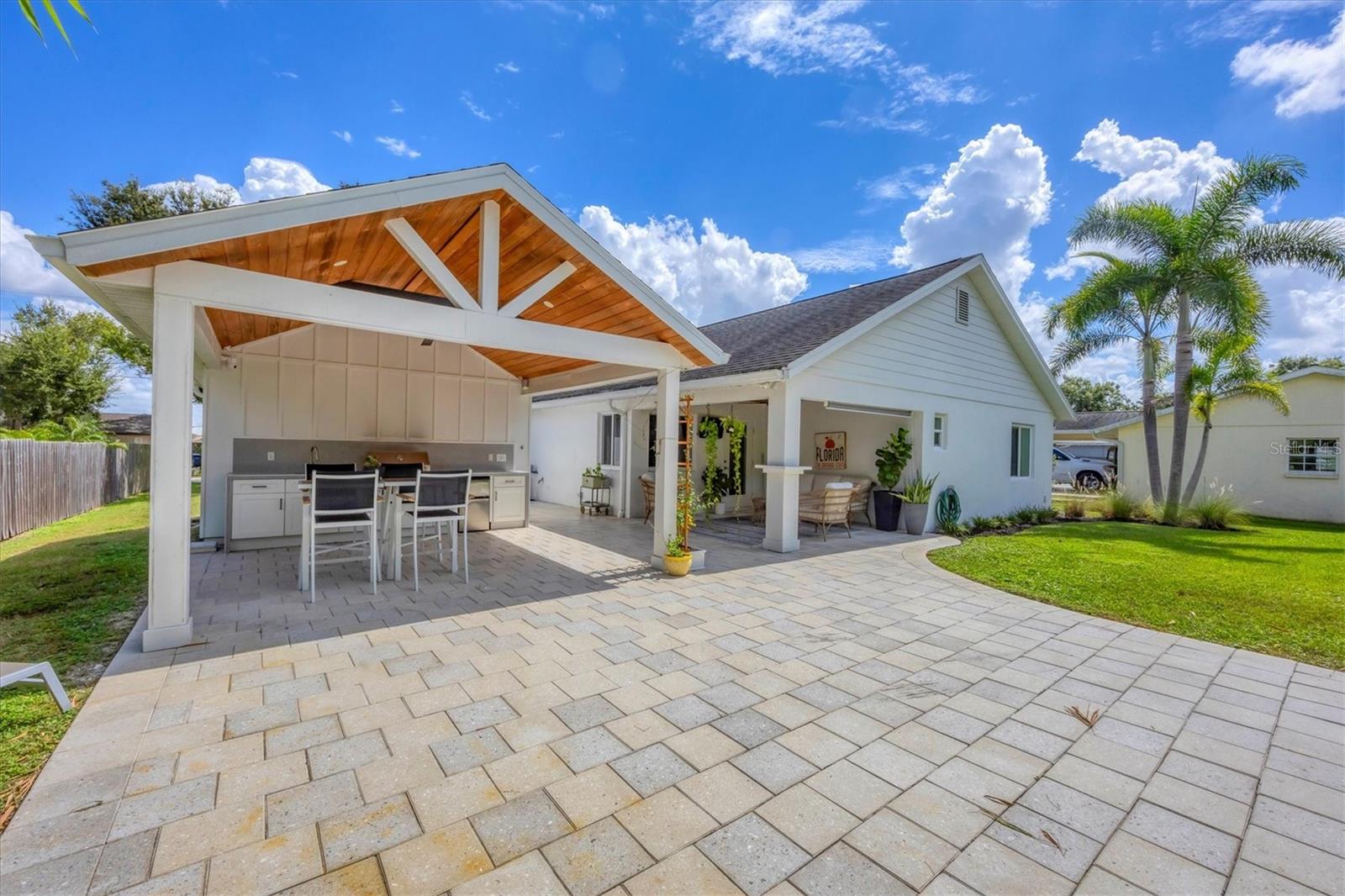 This Charming 3-Bedroom, 2-Bath Home with 2-car garage plus a detached shed/workshop combines High End Craftsmanship with Modern Farmhouse Style. Built by a local builder with meticulous attention to detail, every space in this home was thoughtfully designed for comfort, style, and function. Step inside to find custom touches throughout, including wood-inlaid ceilings on front porch and outdoor covered living areas, a sliding barn door separating the living area from the bedrooms, a built-in dining bench with storage, shiplap wall details in the Primary Suite, detailed trim in the second bedroom, and a built-in desk in the third bedroom, perfect for a home office or study space. The heart of the home is the spacious kitchen, featuring custom wood cabinetry, granite countertops, New Stainless Appliances, an island, a breakfast bar with seating, and an adjacent Dining Area with adorable and functional bench for family dinners or friendly gatherings. The Primary Suite is a retreat of its own with a stunning bathroom showcasing marble floors and marble tile shower, and custom dual vanity with marble tops. Two guest bedrooms share a stylish bath with marble top vanity and a tub/shower combination. Outdoor living is just as impressive. A covered entertainment area provides plenty of room for lounging and dining, complete with outdoor kitchen (grill and beverage cooler), while fenced backyard offers a wood-fired pizza oven-a dream for entertaining. Energy efficiency is built in: solar panels that power appliances, New Tankless hot water heater, AC, and lighting, making this home as smart as it is beautiful, with extremely low energy costs. The fenced yard also features an outdoor private shower, and a large yard providing privacy and function for pets, gardening, or family play. Located in the heart of Sarasota, this home is just minutes from top-rated schools, downtown Sarasota, I-75, University Town Center, award winning restaurants, shopping, and the world-renowned Lido Key and Siesta Key Beaches. This One-of-a-Kind property blends thoughtful design, modern efficiency, and timeless style. Don’t miss your chance to call it Yours!