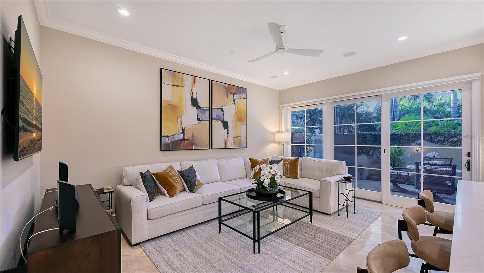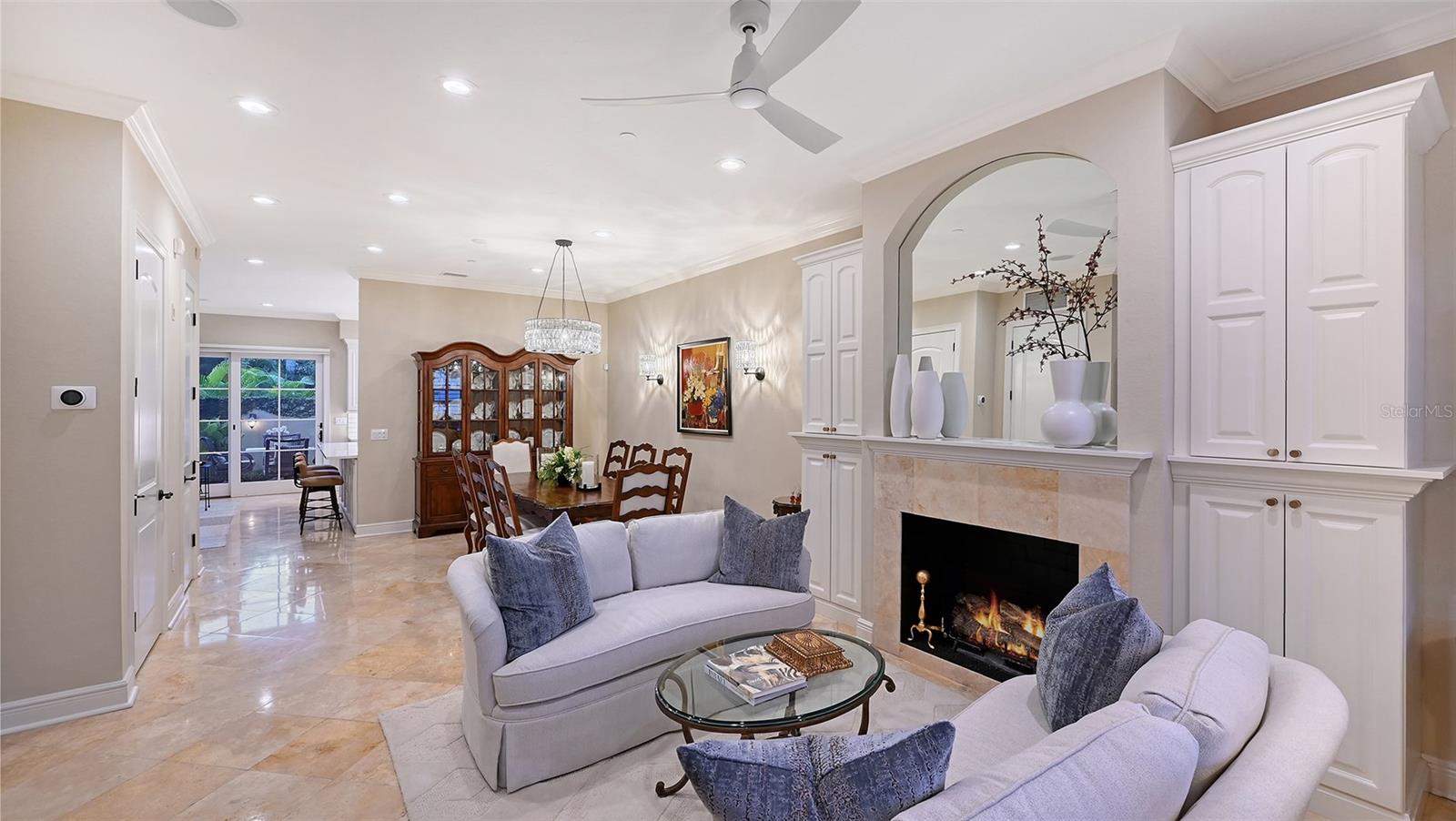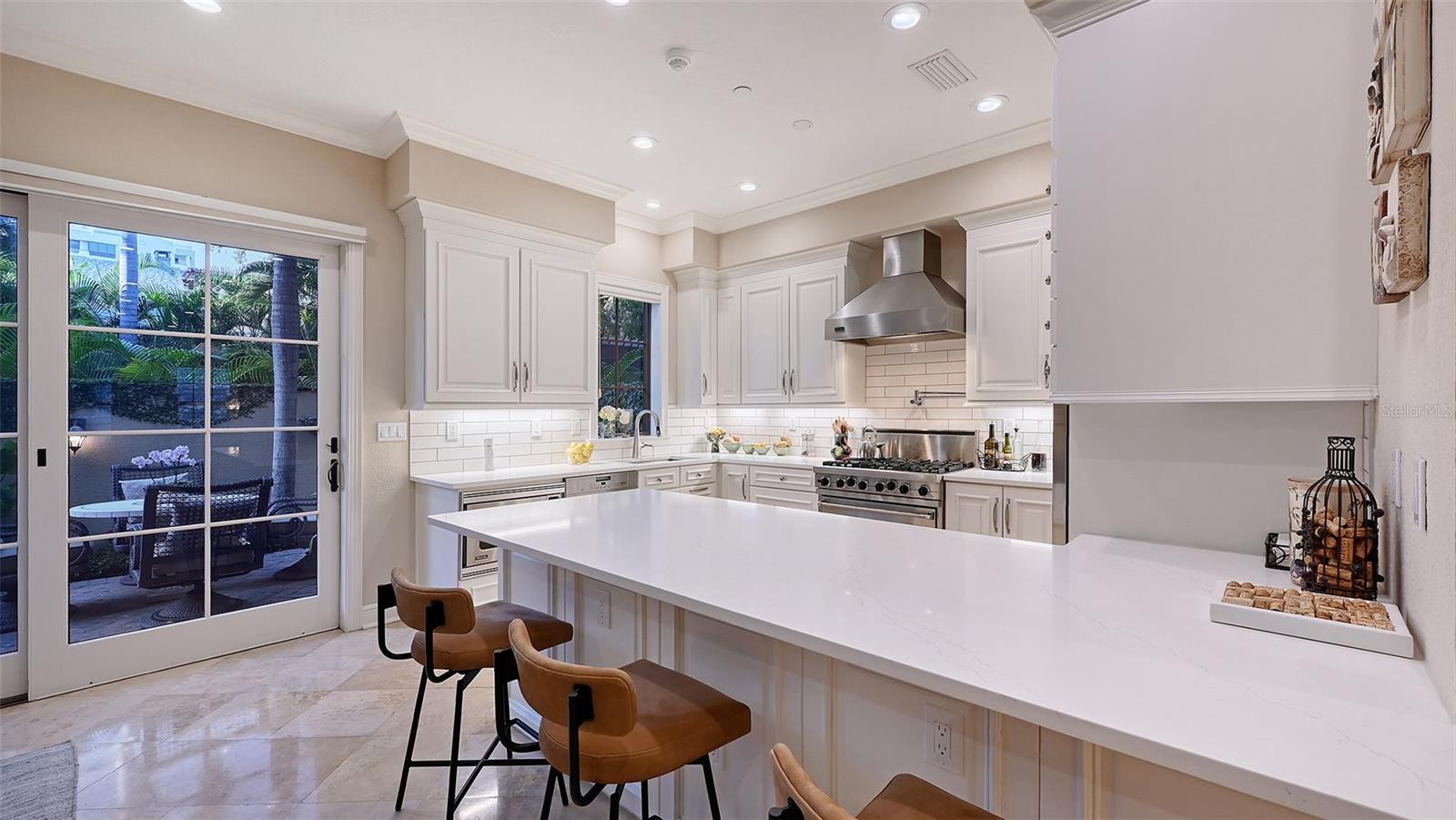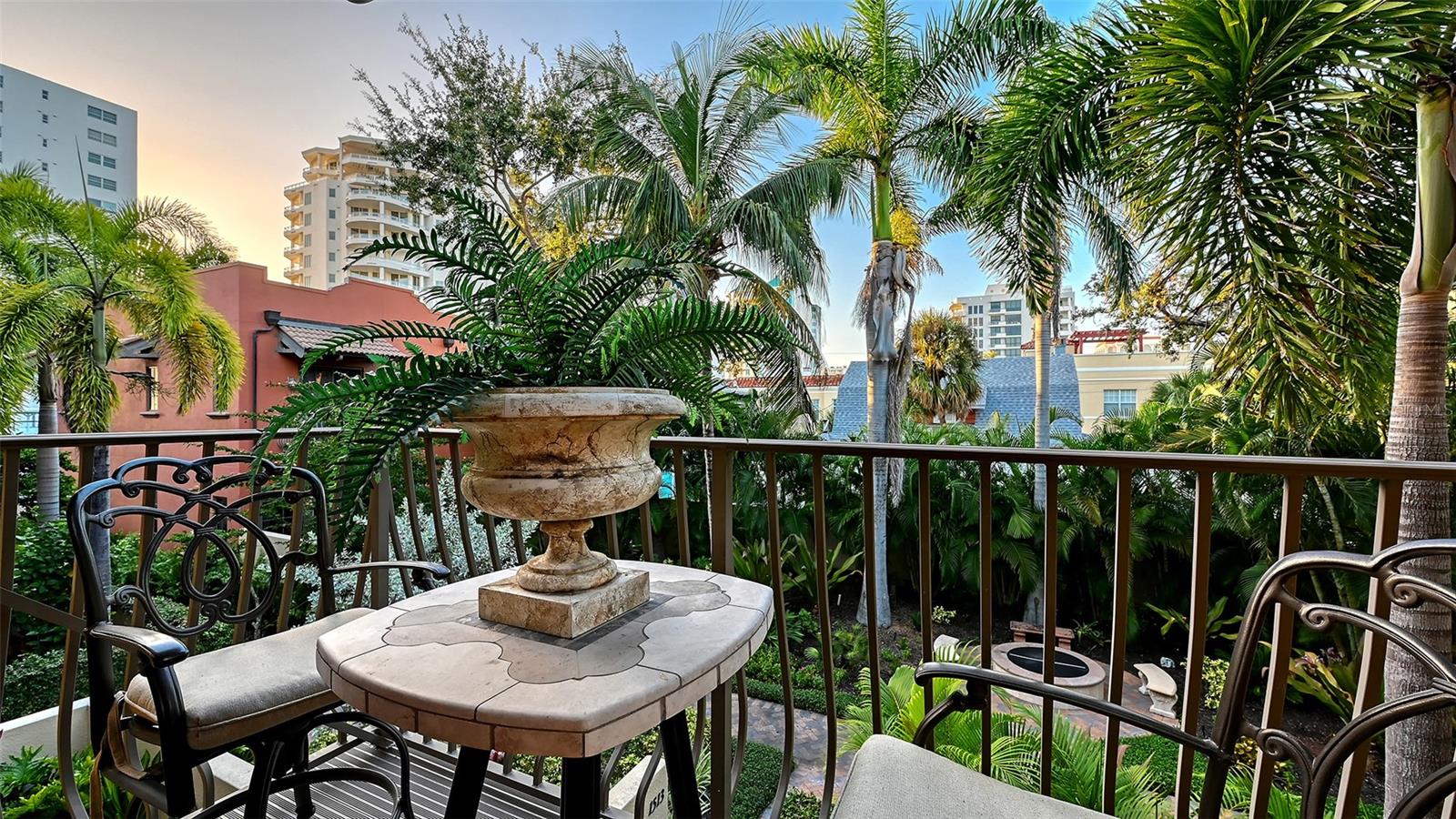 Tucked within the highly sought-after Burns Court Villas in the heart of downtown Sarasota, this exquisite and inviting rarely available two-story townhouse lives with the comfort and privacy of a single-family home yet offers all the conveniences of vibrant downtown Sarasota living just outside your door. With nearly 2,000 square feet of thoughtfully designed space, 3 bedrooms, 2.5 baths, and 3 private balconies plus the largest private courtyard in the community, this residence beautifully balances elegance, comfort, and everyday livability. Step through the solid mahogany front door into light-filled interiors anchored by polished travertine floors, high ceilings, and soft natural light filtering through impact-rated windows and doors. The open living spaces flow gracefully, from the welcoming formal living room with gas fireplace, to the elegant dining room, and on to the fantastic family room just off the kitchen—a peaceful retreat overlooking the lush, private courtyard where birds sing and green Climbing Fig adorns the walls creating a rare, serene extension of the living space for morning coffee, quiet reading, or intimate outdoor entertaining. The kitchen remodel, completed in 2023, reflects impeccable craftsmanship and refined taste. Custom wood cabinetry with soft-close drawers and pull-out storage is paired with quartz countertops, a new Sub-Zero refrigerator, Viking six-burner gas range with electric oven, Viking convection microwave, and Miele dishwasher. Every detail was designed for both beauty and performance, while upgraded LED lighting throughout the home enhances its brightness and energy efficiency. Upstairs, Brazilian cherry engineered hardwood floors add warmth and continuity to the second level. The serene primary suite offers a restful ambiance, with a private balcony access, custom walk-in closet and a fully renovated primary bath—a spa-like retreat of glass, quartz, and intricate custom tilework with cohesive tile patterns and fine finishes. The space features a walk-in shower with bench seating, stainless fixtures, and a designated vanity illuminated by natural light. The 2 generous guest suites are calming private retreats and share a reimagined full bath that mirrors the sophisticated aesthetic of the primary- newly renovated with the finest of materials and finishes. Everyday practicality is elevated by the convenient second-story laundry room with Whirlpool Duet washer and dryer, storage cabinetry, and ample additional closet space. The home also features 2-zone A/C, a water heater less than a year old, GFI EV charging outlet, and assigned parking. Residents of Burns Court Villas enjoy a beautifully landscaped central courtyard with pool, relaxing spa, and fire pit—a true urban oasis. Peace of mind is paramount with enhanced perimeter security including fob-access gates & secure parking. Blending the warmth of a home with the ease of downtown living, this residence offers a lifestyle that’s both tranquil and connected. Walk or ride to Sarasota’s acclaimed dining, theaters, galleries, and the bayfront, then return home to your own private sanctuary—where modern comfort, timeless design, and a sense of calm meet in perfect harmony.