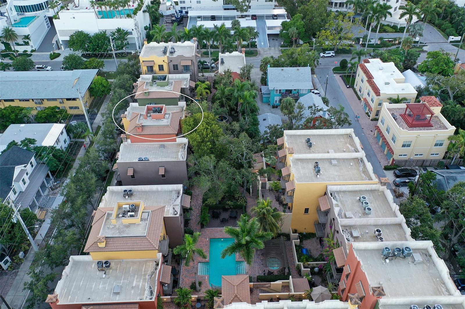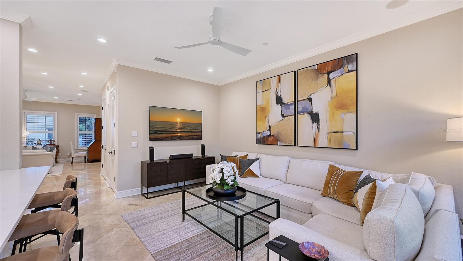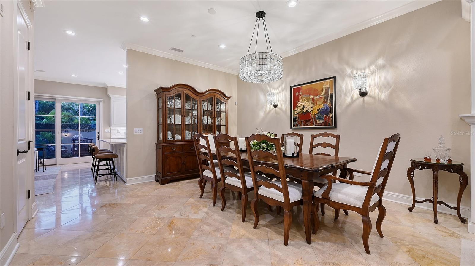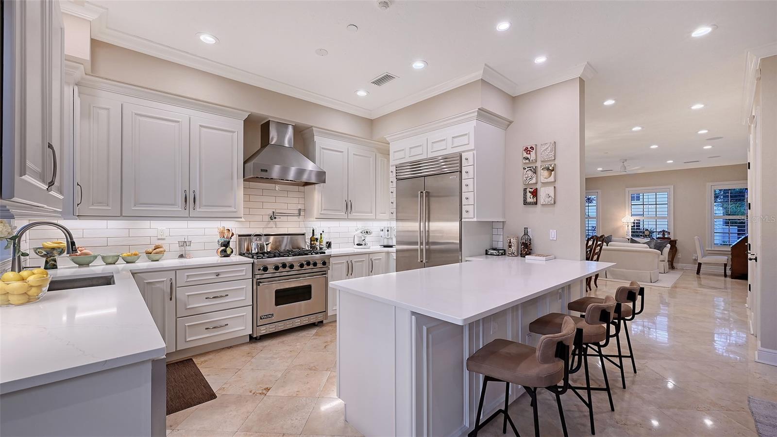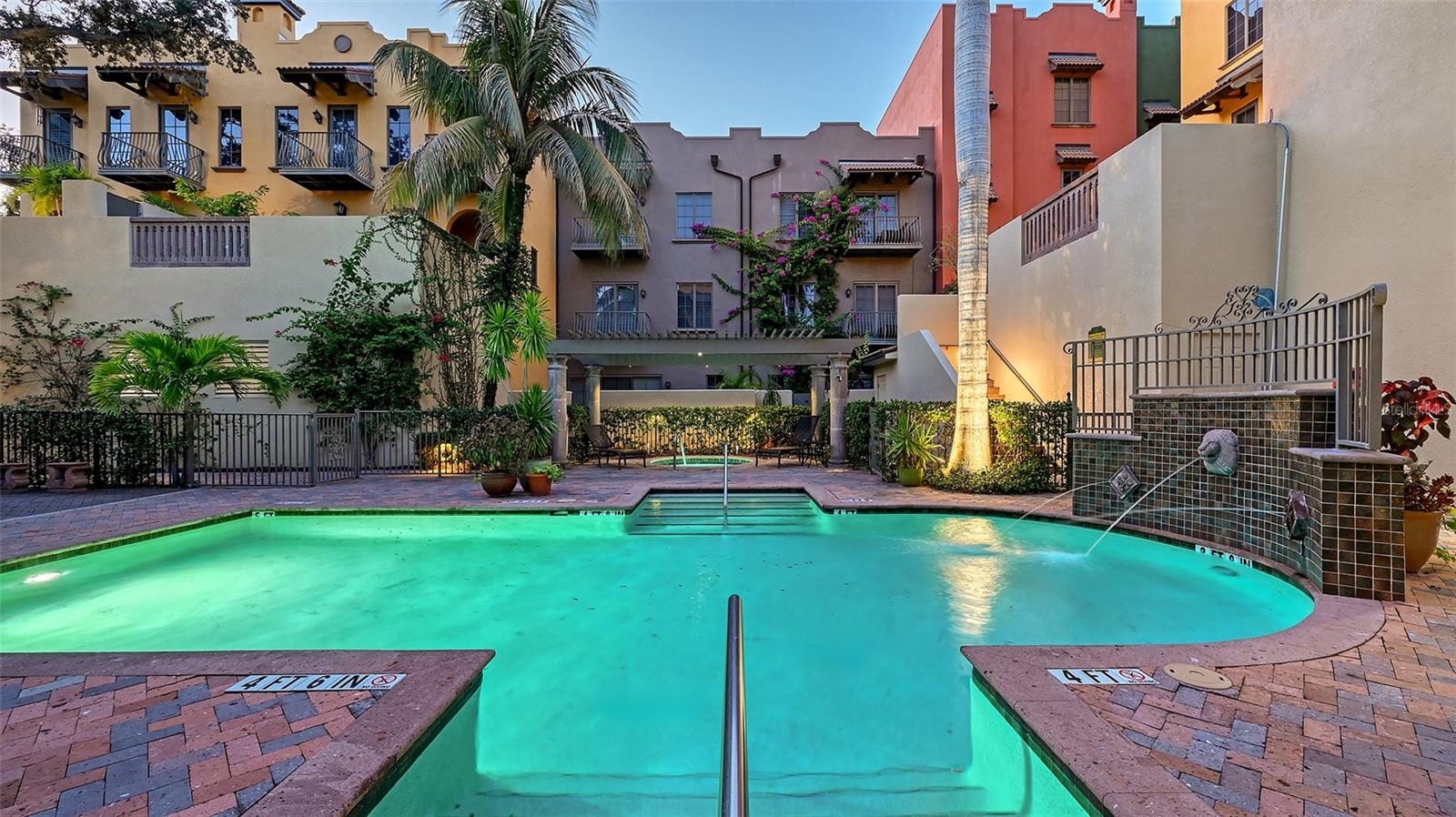 Tucked within the highly sought-after Burns Court Villas in the heart of downtown Sarasota, this exquisite and inviting rarely available two-story townhouse lives with the comfort and privacy of a single-family home yet offers all the conveniences of vibrant downtown Sarasota living just outside your door. With nearly 2,000 square feet of thoughtfully designed space, 3 bedrooms, 2.5 baths, and 3 private balconies plus the largest private courtyard in the community, this residence beautifully balances elegance, comfort, and everyday livability. Step through the solid mahogany front door into light-filled interiors anchored by polished travertine floors, high ceilings, and soft natural light filtering through impact-rated windows and doors. The open living spaces flow gracefully, from the welcoming formal living room with gas fireplace, to the elegant dining room, and on to the fantastic family room just off the kitchen—a peaceful retreat overlooking the lush, private courtyard where birds sing and green Climbing Fig adorns the walls creating a rare, serene extension of the living space for morning coffee, quiet reading, or intimate outdoor entertaining. The kitchen remodel, completed in 2023, reflects impeccable craftsmanship and refined taste. Custom wood cabinetry with soft-close drawers and pull-out storage is paired with quartz countertops, a new Sub-Zero refrigerator, Viking six-burner gas range with electric oven, Viking convection microwave, and Miele dishwasher. Every detail was designed for both beauty and performance, while upgraded LED lighting throughout the home enhances its brightness and energy efficiency. Upstairs, Brazilian cherry engineered hardwood floors add warmth and continuity to the second level. The serene primary suite offers a restful ambiance, with a private balcony access, custom walk-in closet and a fully renovated primary bath—a spa-like retreat of glass, quartz, and intricate custom tilework with cohesive tile patterns and fine finishes. The space features a walk-in shower with bench seating, stainless fixtures, and a designated vanity illuminated by natural light. The 2 generous guest suites are calming private retreats and share a reimagined full bath that mirrors the sophisticated aesthetic of the primary- newly renovated with the finest of materials and finishes. Everyday practicality is elevated by the convenient second-story laundry room with Whirlpool Duet washer and dryer, storage cabinetry, and ample additional closet space. The home also features 2-zone A/C, a water heater less than a year old, GFI EV charging outlet, and assigned parking. Residents of Burns Court Villas enjoy a beautifully landscaped central courtyard with pool, relaxing spa, and fire pit—a true urban oasis. Peace of mind is paramount with enhanced perimeter security including fob-access gates & secure parking. Blending the warmth of a home with the ease of downtown living, this residence offers a lifestyle that’s both tranquil and connected. Walk or ride to Sarasota’s acclaimed dining, theaters, galleries, and the bayfront, then return home to your own private sanctuary—where modern comfort, timeless design, and a sense of calm meet in perfect harmony.