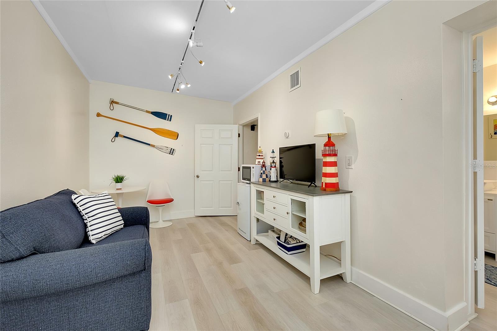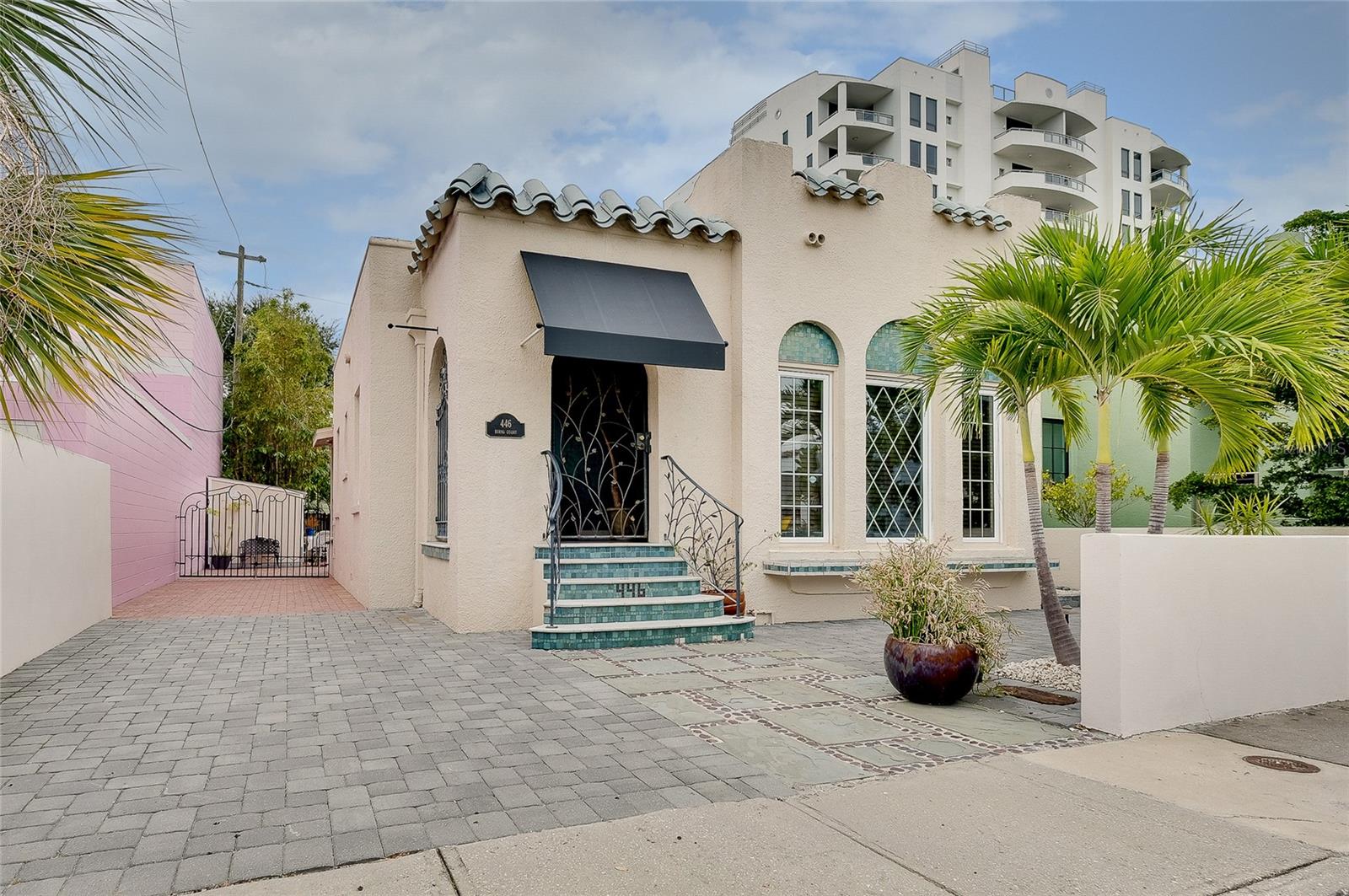 Nestled in one of Sarasota’s most sought-after neighborhoods, this beautifully restored Burns Court residence offers the rare opportunity to own a true piece of Downtown history. Blending timeless charm with modern comfort, this property is ideal as a rental investment, a live-work setup, or simply a vibrant in-town retreat for those who crave the downtown lifestyle. The main home offers one bedroom and one and a half baths, thoughtfully remodeled to blend charm with modern comfort. High ceilings, gleaming wood floors, impact-rated windows, natural gas, and a whole-home water-filtration system enhance the living experience. The cozy living room centers around a classic fireplace, while the chef’s kitchen shines with GE Café appliances, solid wood cabinetry, stone counters, and a welcoming breakfast bar. The primary suite features a beautifully updated bathroom with double sinks, a large walk-in shower, and a custom closet system for optimal organization. Completing the home is an enclosed front porch — a perfect spot to unwind and enjoy the day’s end. A separate 1-bed/1-bath guest cottage extends the property’s versatility, complete with a separate living space, kitchenette, and spacious bath with double sinks and a walk-in shower. The attached screened lounge—perfect for entertaining—opens to a private, brick-paved courtyard with a storage shed and lush tropical landscaping.With DTC zoning, the possibilities are endless—residential, rental, live/work, or even small business use (verify with city guidelines). Surrounded by multimillion-dollar condominiums, galleries, cafés, boutiques, and restaurants, this home puts you in the heart of it all. Just two blocks from Main Street and moments from the Sarasota Bayfront and marina, this residence places you at the heart of downtown living. Enjoy close proximity to Selby Gardens, Owen’s Fish Camp, the Burns Court Cinema, and an array of local shops and cafés. Opportunities like 446 Burns Court are few and far between—don’t miss your chance to own a landmark property in Sarasota’s most vibrant and walkable district.