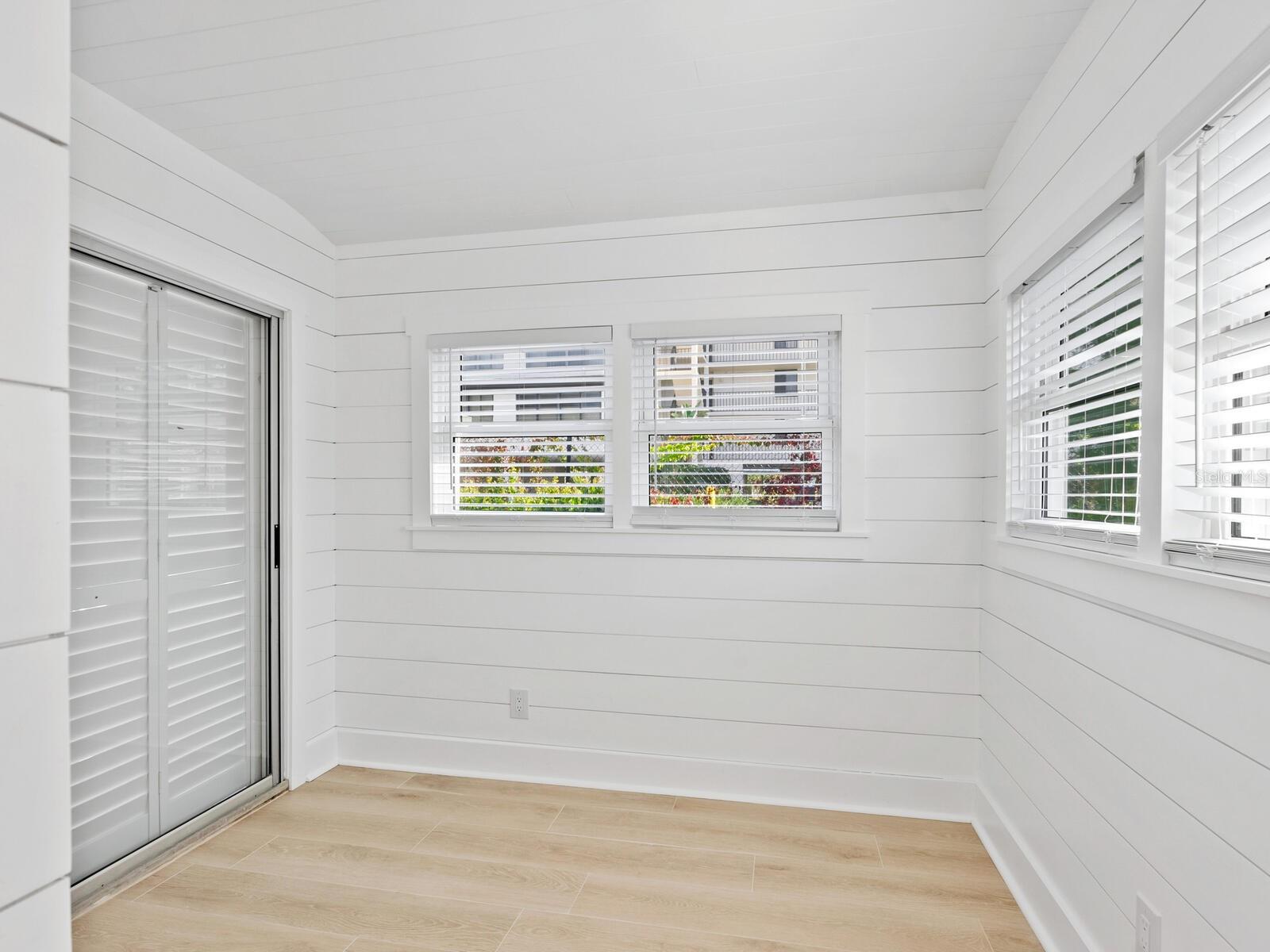 Totally renovated and updated villa with one bedroom and one full bath plus a bonus room and a large glassed-in lanai. This property is located in beautiful Polynesian Gardens close to the community pool and clubhouse. The owner completely renovated and restored this villa after Hurricane Helene. Extra Large great room and primary bedroom, Bonus room large enough for a queen size bed. Extra-large glassed in lanai New appliances, new kitchen cabinets, new tile floors throughout. Impact glass entry door, PGT impact windows and plantation shutters. Too many improvements to list. List of improvements available. The free Siesta Breeze trolley stops in front of the main entrance providing quick access to the #1 Beach at Siesta Key plus Siesta Village, South Siesta Village and Turtle Beach.