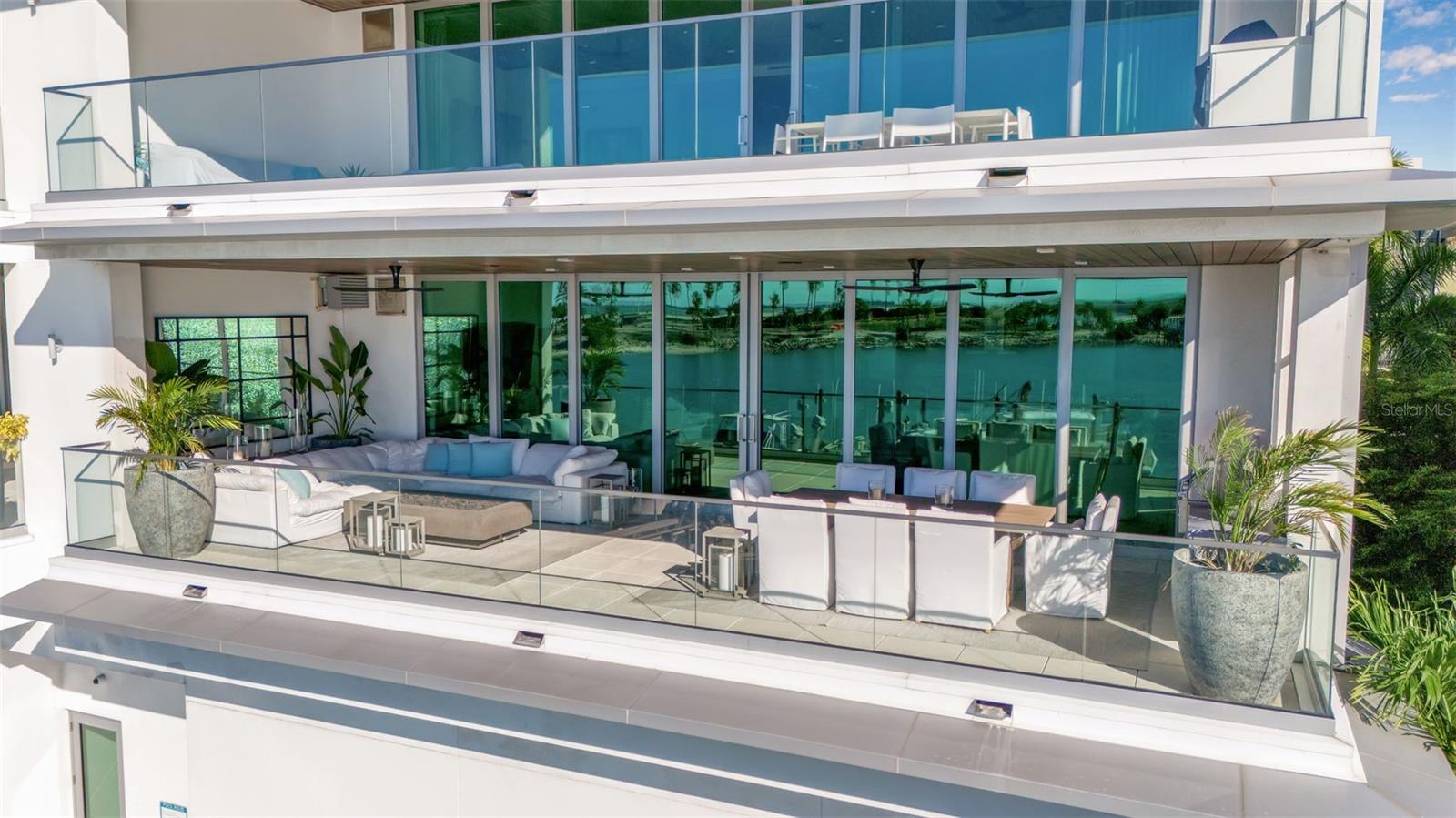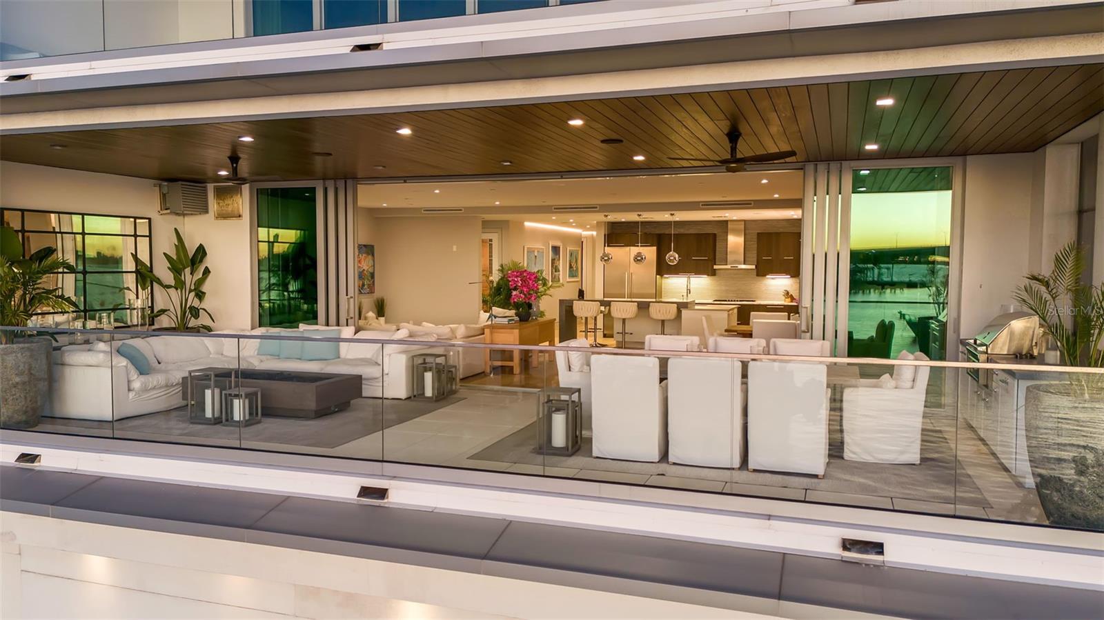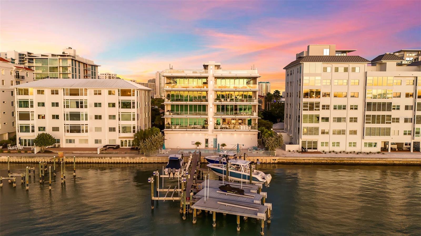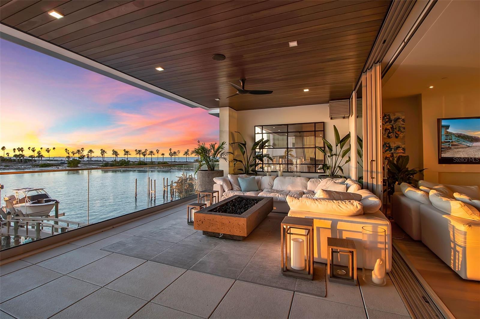 Modern waterfront sophistication takes center stage in this exceptional residence at One88 on Golden Gate Point, a boutique architectural landmark offering just eight private condominiums on Sarasota Bay. Widely regarded as one of Sarasota’s most exclusive addresses, One88 delivers a rare combination of privacy, design distinction, and unobstructed bayfront living. Upon entering the residence, a refined yet highly functional interior unfolds, thoughtfully curated with premier materials and bespoke craftsmanship throughout. Distinguishing features include DuChâteau engineered wood flooring, custom Italian cabinetry by Cucine Ricci, and striking architectural concrete elements by Ben Nettles—featured in the fireplaces, kitchen breakfast bar, and powder bath sink. Additional enhancements include recessed baseboards, two alcohol-burning fireplaces, and a temperature-controlled, 500-bottle wine cellar designed for the serious collector. A full smart-home ecosystem by Wicked Smart Homes seamlessly integrates motorized window treatments, lighting, and surround sound, elevating both convenience and lifestyle. The open-concept kitchen is anchored by a premium Thermador appliance suite, including a dedicated 75+ bottle wine column, complemented by designer Italian cabinetry, a statement tile backsplash, expansive island seating, and a custom-organized walk-in pantry. Positioned to capture sweeping bay views, the kitchen flows effortlessly into the great room, framed by floor-to-ceiling glass doors that open to a 575-square-foot westerly waterfront terrace—creating an exceptional indoor-outdoor living experience unique to this residence with a built-in gas grilling area. As well as 254 sq ft of private Eastern- facing terrace space off the owner’s suite. Secured elevator access into the unit’s foyer, with an additional locking glass door for extra security. The great room offers generous flexibility for furnishing and entertaining, enhanced by a built-in wet bar with dual beverage drawers. The owner’s suite serves as a tranquil retreat, featuring a private morning terrace and a custom spa-style bath unlike any other in the building. Two additional en-suite guest bedrooms, a well-appointed powder room, a spacious laundry room, and multiple storage closets complete the interior layout. This offering includes a private boat dock equipped with a rare 25,000-pound lift, along with two side-by-side parking spaces—one with an additional car lift—plus a utility lift and substantial private storage. Residents of One88 enjoy exclusive amenities including a rooftop terrace, waterfront fire pit, bicycle storage, garage carwash station, and a 70-foot lap pool overlooking Sarasota Bay. Ideally situated on Golden Gate Point, this extraordinary residence is just minutes from downtown Sarasota, St. Armand's Circle, Lido Key, Longboat Key, and Sarasota-Bradenton International Airport—offering unparalleled access to the region’s cultural, culinary, and coastal lifestyle.