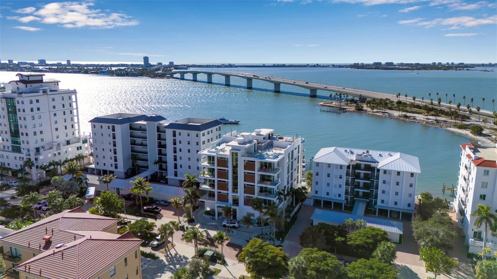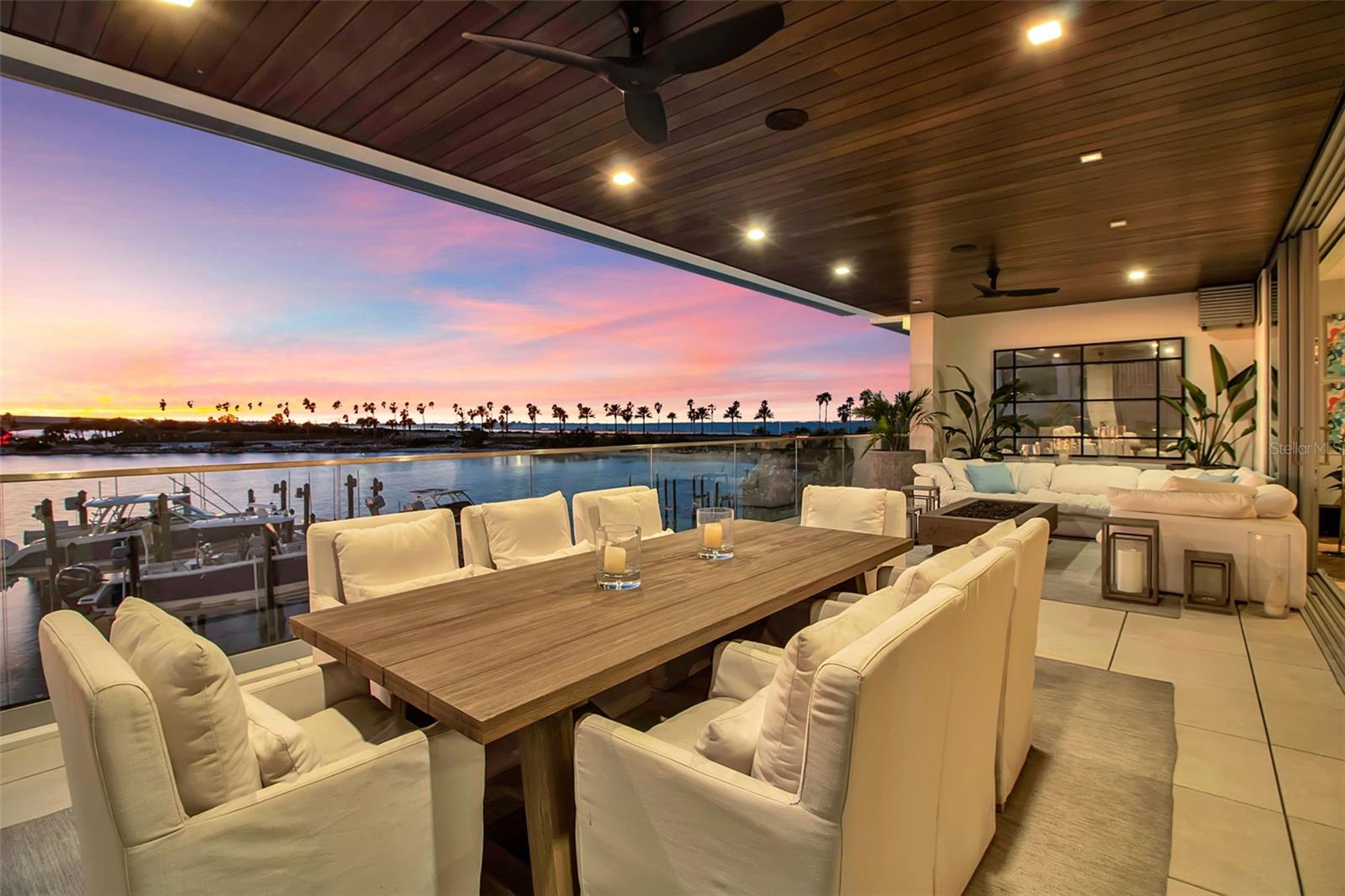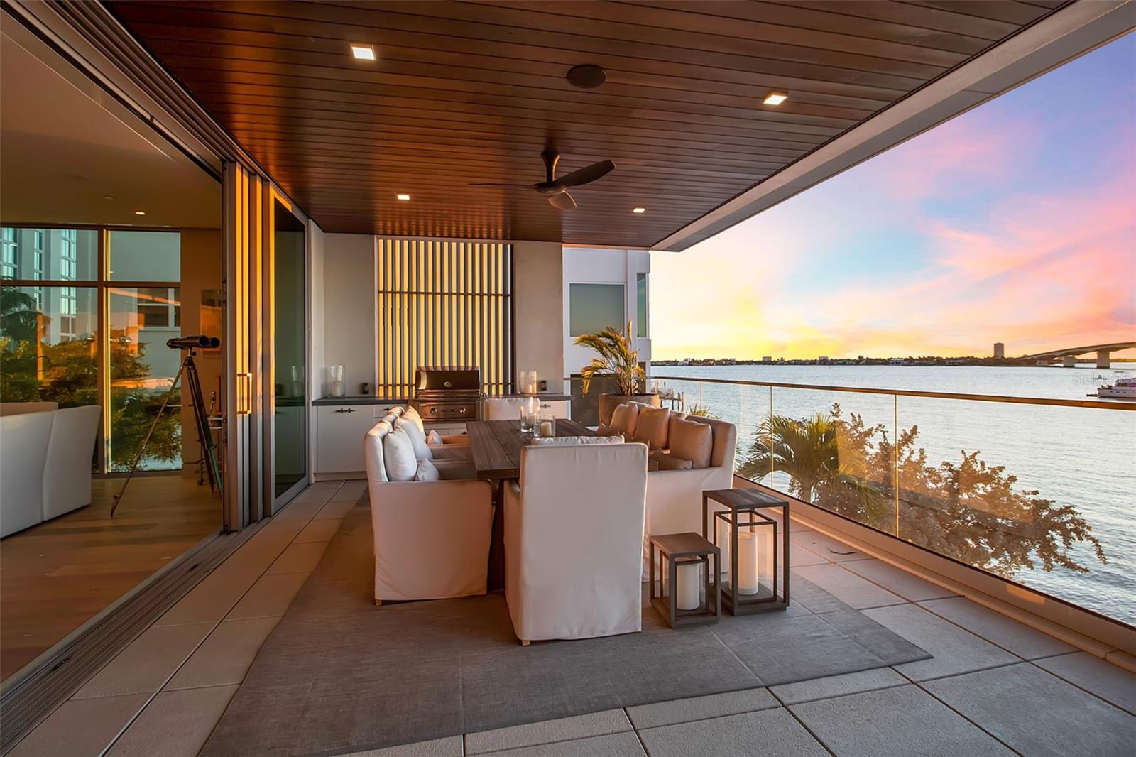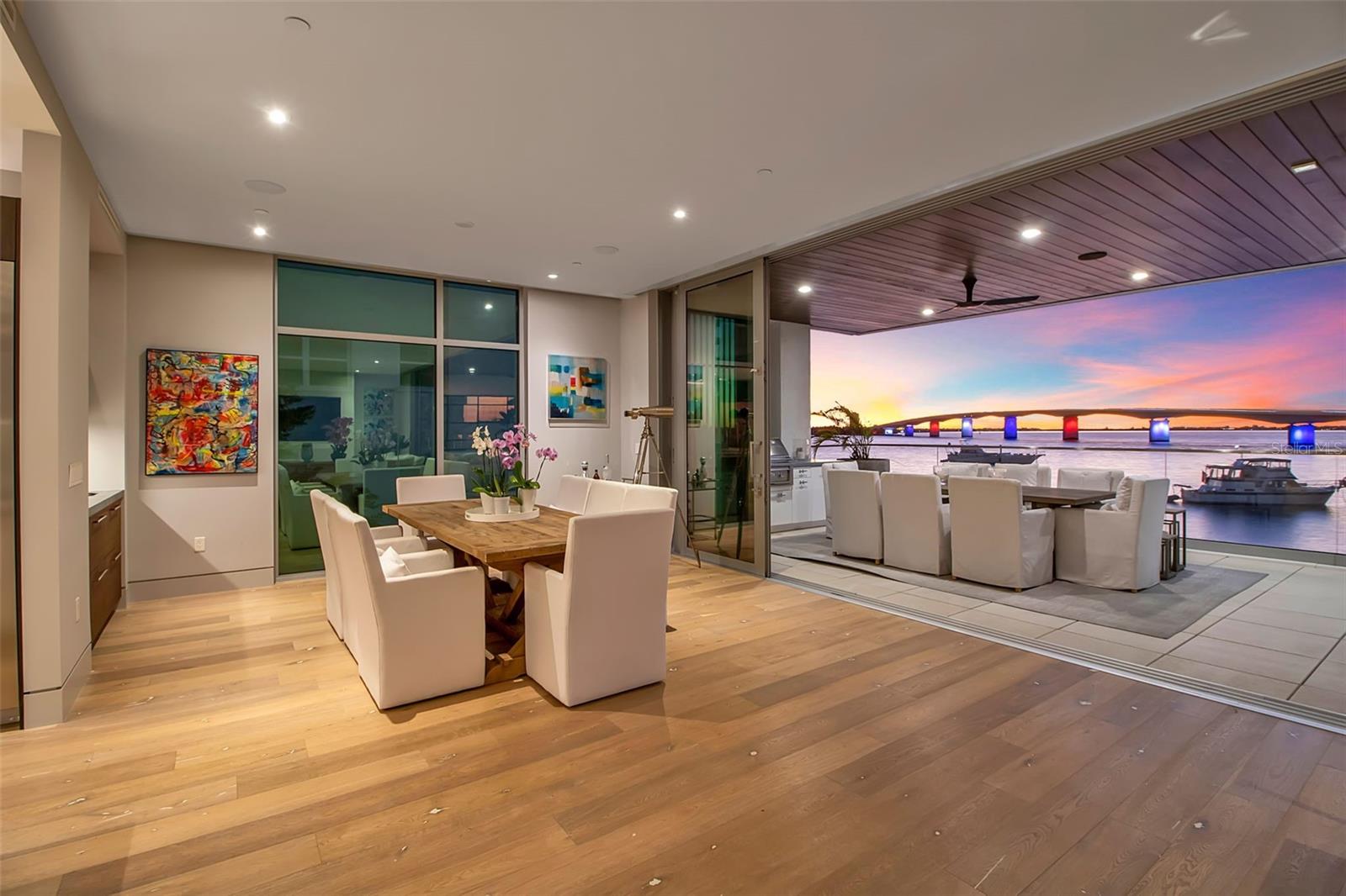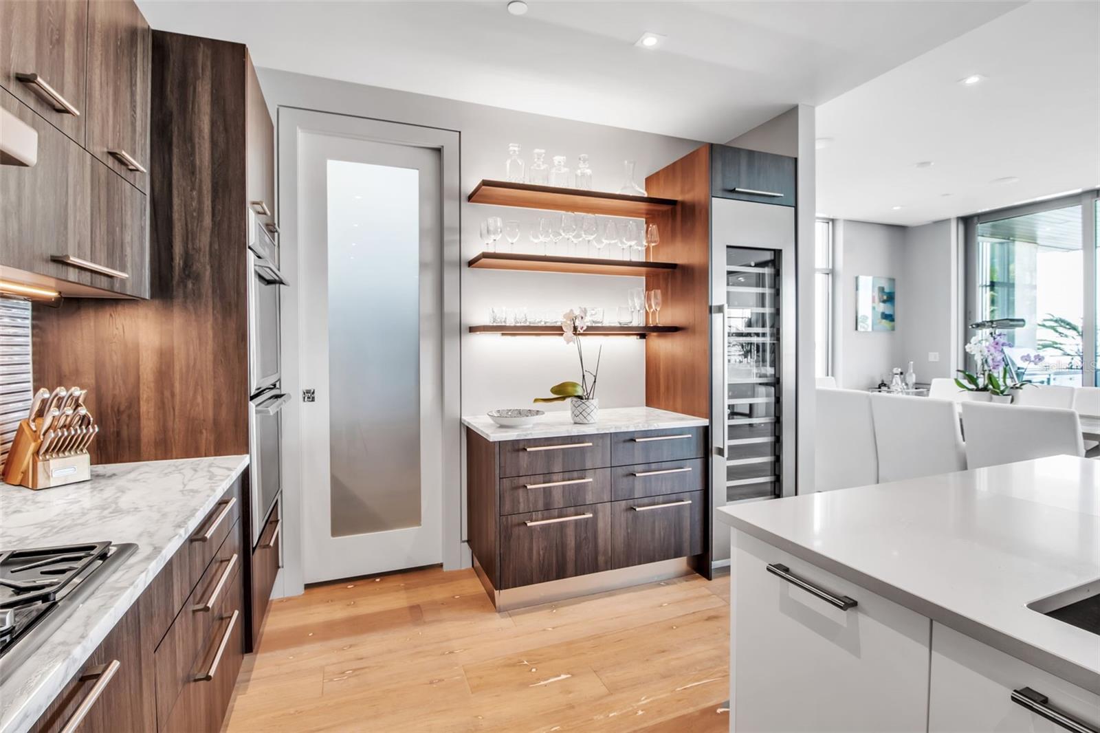 Modern waterfront sophistication takes center stage in this exceptional residence at One88 on Golden Gate Point, a boutique architectural landmark offering just eight private condominiums on Sarasota Bay. Widely regarded as one of Sarasota’s most exclusive addresses, One88 delivers a rare combination of privacy, design distinction, and unobstructed bayfront living. Upon entering the residence, a refined yet highly functional interior unfolds, thoughtfully curated with premier materials and bespoke craftsmanship throughout. Distinguishing features include DuChâteau engineered wood flooring, custom Italian cabinetry by Cucine Ricci, and striking architectural concrete elements by Ben Nettles—featured in the fireplaces, kitchen breakfast bar, and powder bath sink. Additional enhancements include recessed baseboards, two alcohol-burning fireplaces, and a temperature-controlled, 500-bottle wine cellar designed for the serious collector. A full smart-home ecosystem by Wicked Smart Homes seamlessly integrates motorized window treatments, lighting, and surround sound, elevating both convenience and lifestyle. The open-concept kitchen is anchored by a premium Thermador appliance suite, including a dedicated 75+ bottle wine column, complemented by designer Italian cabinetry, a statement tile backsplash, expansive island seating, and a custom-organized walk-in pantry. Positioned to capture sweeping bay views, the kitchen flows effortlessly into the great room, framed by floor-to-ceiling glass doors that open to a 575-square-foot westerly waterfront terrace—creating an exceptional indoor-outdoor living experience unique to this residence with a built-in gas grilling area. As well as 254 sq ft of private Eastern- facing terrace space off the owner’s suite. Secured elevator access into the unit’s foyer, with an additional locking glass door for extra security. The great room offers generous flexibility for furnishing and entertaining, enhanced by a built-in wet bar with dual beverage drawers. The owner’s suite serves as a tranquil retreat, featuring a private morning terrace and a custom spa-style bath unlike any other in the building. Two additional en-suite guest bedrooms, a well-appointed powder room, a spacious laundry room, and multiple storage closets complete the interior layout. This offering includes a private boat dock equipped with a rare 25,000-pound lift, along with two side-by-side parking spaces—one with an additional car lift—plus a utility lift and substantial private storage. Residents of One88 enjoy exclusive amenities including a rooftop terrace, waterfront fire pit, bicycle storage, garage carwash station, and a 70-foot lap pool overlooking Sarasota Bay. Ideally situated on Golden Gate Point, this extraordinary residence is just minutes from downtown Sarasota, St. Armand's Circle, Lido Key, Longboat Key, and Sarasota-Bradenton International Airport—offering unparalleled access to the region’s cultural, culinary, and coastal lifestyle.