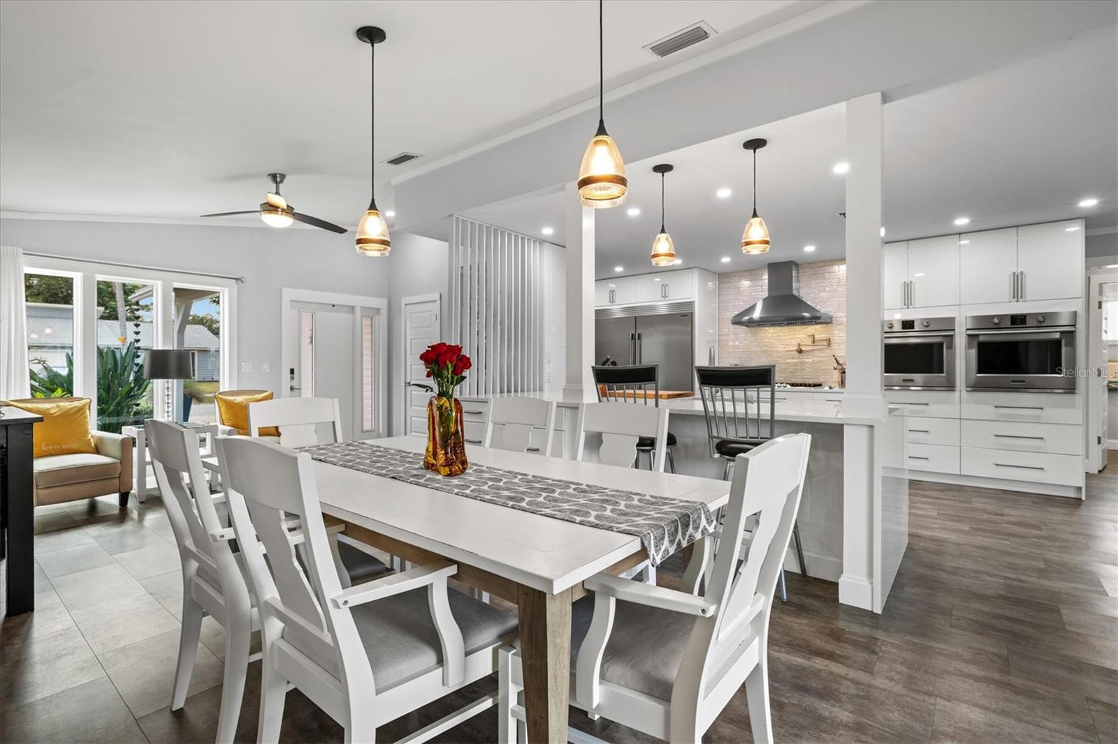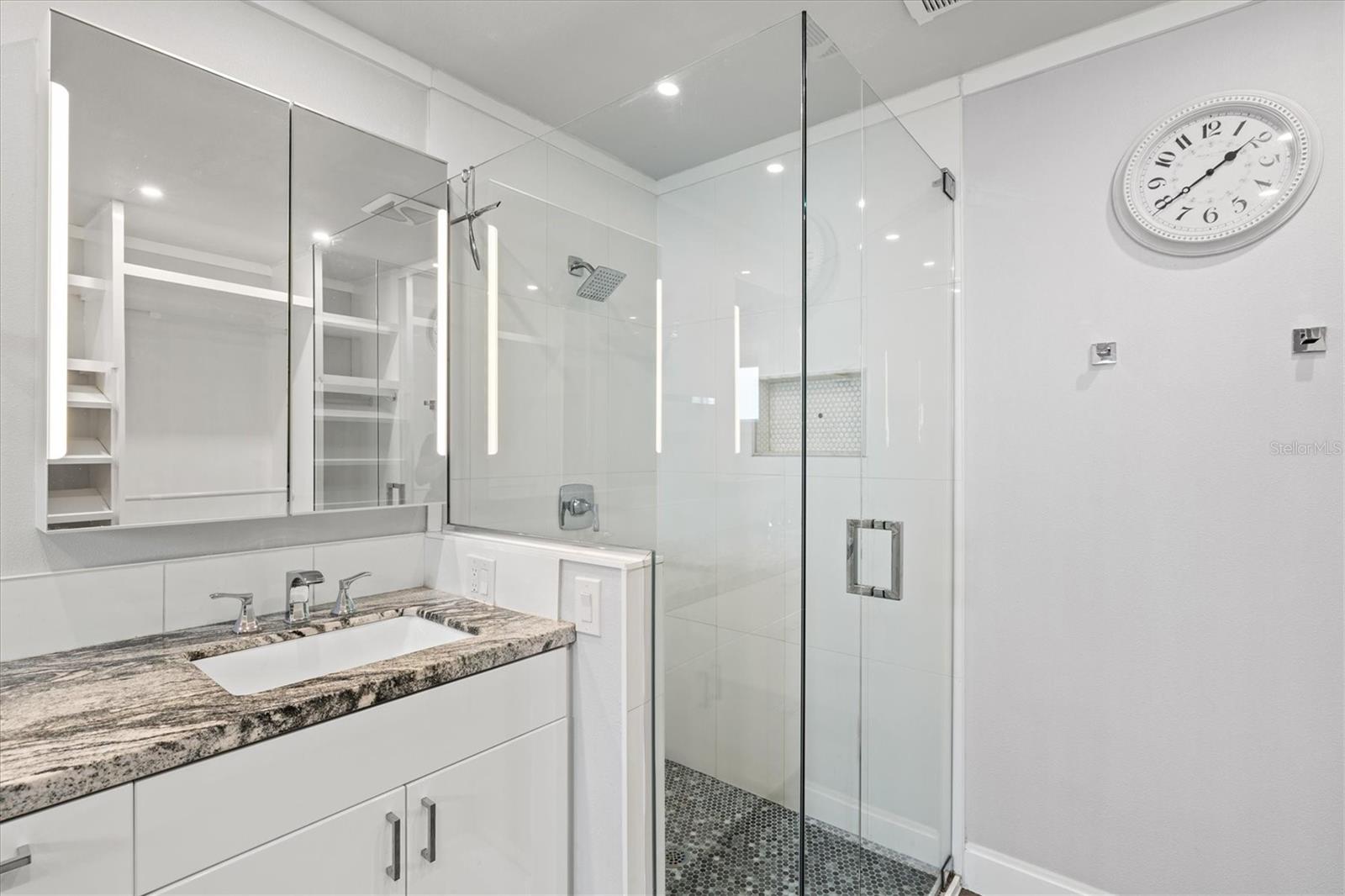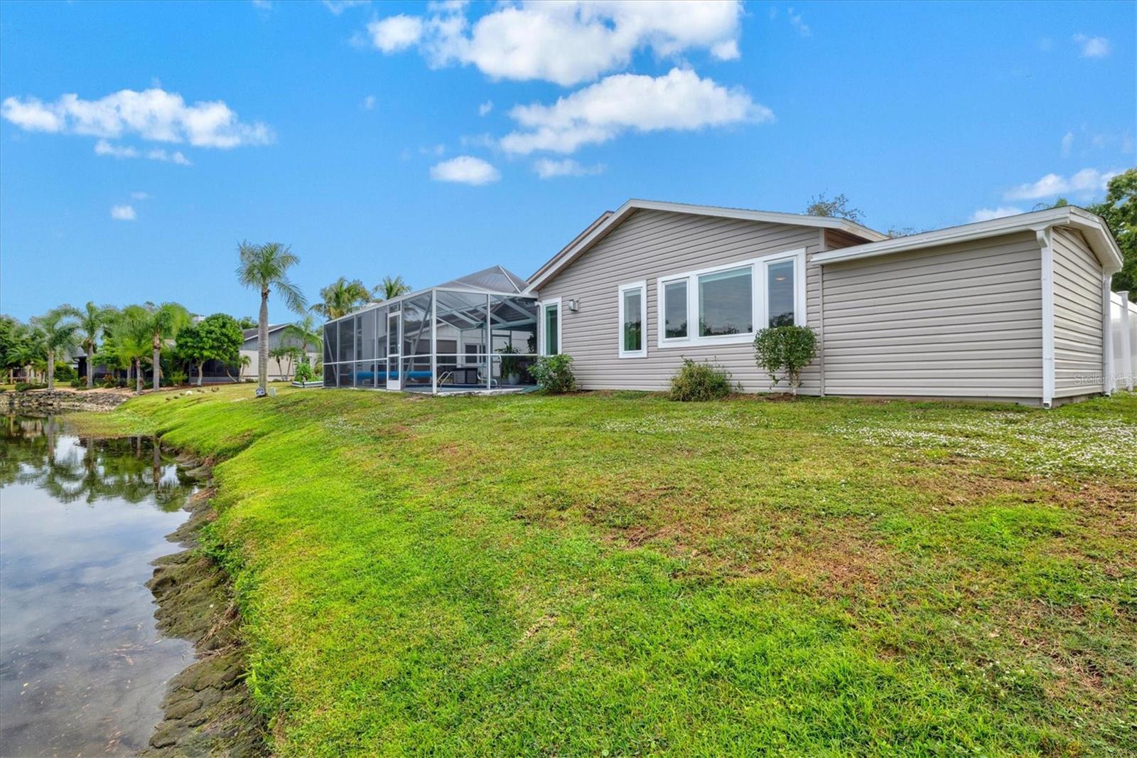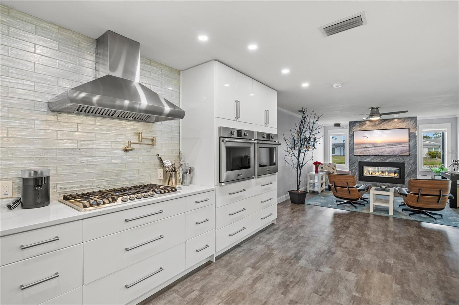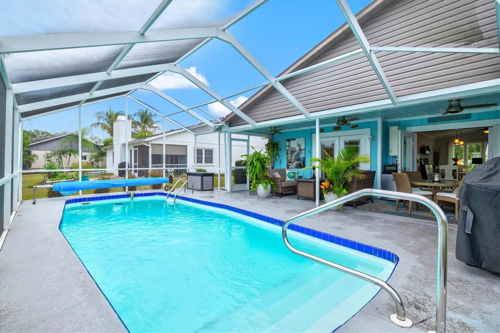 Everything has been done for you, top to bottom, in this completely renovated 3 bedroom, 2 bath, single-story home in Glenbrooke. The kitchen is a chef’s dream with European style high-gloss cabinetry, five-burner propane cooktop stove with pot filler and commercial grade range hood, two electric convection wall ovens, built-in drawer-style microwave and in-kitchen pantries with sliding baskets. You’ll have plenty of space to stock up and prep meals for the week with the full size, side-by-side refrigerator and freezer. Soft close drawers and quartz countertops put the finishing touches on this culinary haven. In the family room, a propane fireplace adds a cozy ambiance on cool evenings. Tall windows bring in plenty of natural light and provide water views. The dining area is thoughtfully designed with access to serving drawers at the breakfast bar, vaulted ceiling, and french doors leading to the pool enclosure and outdoor living space. The primary suite also has direct access to the pool enclosure and features and ensuite bath with marble vanity and dual sinks at counter height, backlit mirrors and frameless glass shower. Two guest rooms and a full bath on the opposite side of the home provide privacy for friends and family (one room currently used as an office). The outdoor space is pleasant for entertaining, with solar heated pool plus solar cover, and a view of the pond, and covered seating area. A propane line is available to connect to a grill. This home was fully renovated to the studs in 2019 as a forever home (not a flip) and brought to hurricane standards including reinforced walls, roof, hurricane impact windows and doors. Home is in the X flood zone and does not require flood insurance. Side yard is fenced and gated and includes a 8 x12 storage shed with shelves. This area can be used as a dog run. Garage is fully insulated and has remote controlled heat/cool split system.