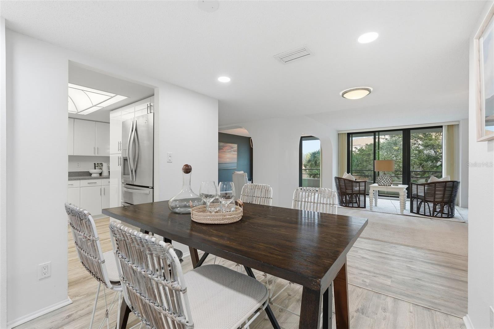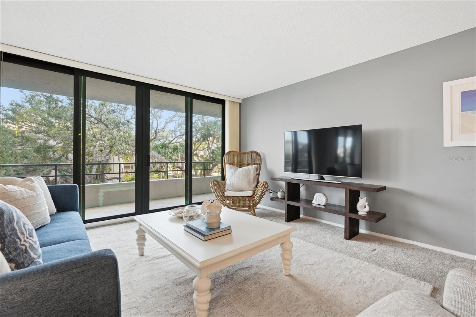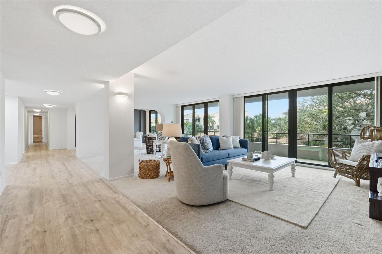 Deeded beach access, Intracoastal waterway frontage with boat dockage AND room for the whole family! Discover the epitome of coastal living in this fabulous three-bedroom, two-and-a-half-bath residence, boasting 2,358 square feet of interior space and a 95-foot balcony spanning the entire length of the home. Recently upgraded with $80,000 worth of high-impact hurricane sliders, the spacious floor plan offers multiple living and dining areas, with a split layout ensuring privacy. This is a real gem for investors as it is one of only eight 3-bedroom units in the building. At the Anchorage, owners and renters enjoy deeded, gated beach access right across the street, a canal with boat dockage and kayak/paddleboard launch, and beautiful sprawling park-like grounds overlooking the intracoastal waterway. Other amenities include a gated entrance, heated pool, fitness center, clubhouse, tennis and pickleball courts, shuffleboard courts and kayak racks. Onsite rental management and a one-week minimum rental make this community very popular with vacationers and savvy investors alike. Come see why The Anchorage is the place to be year-round on Siesta Key.