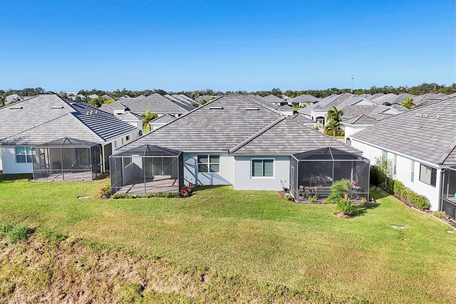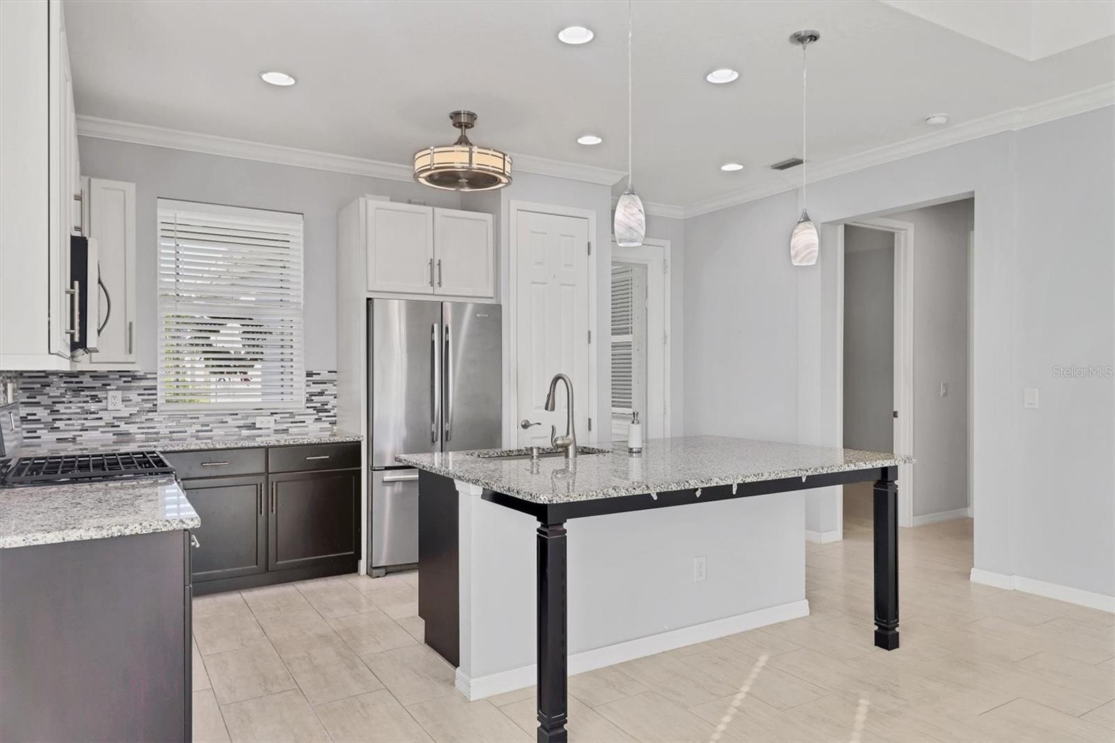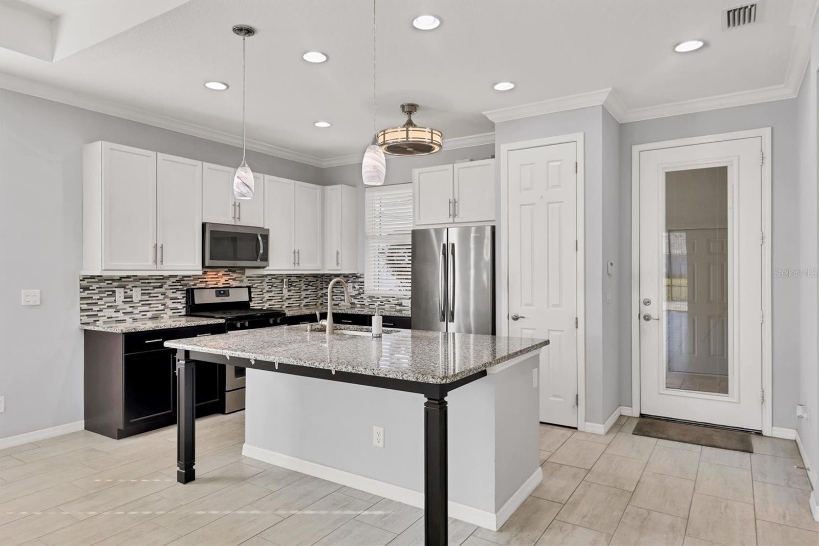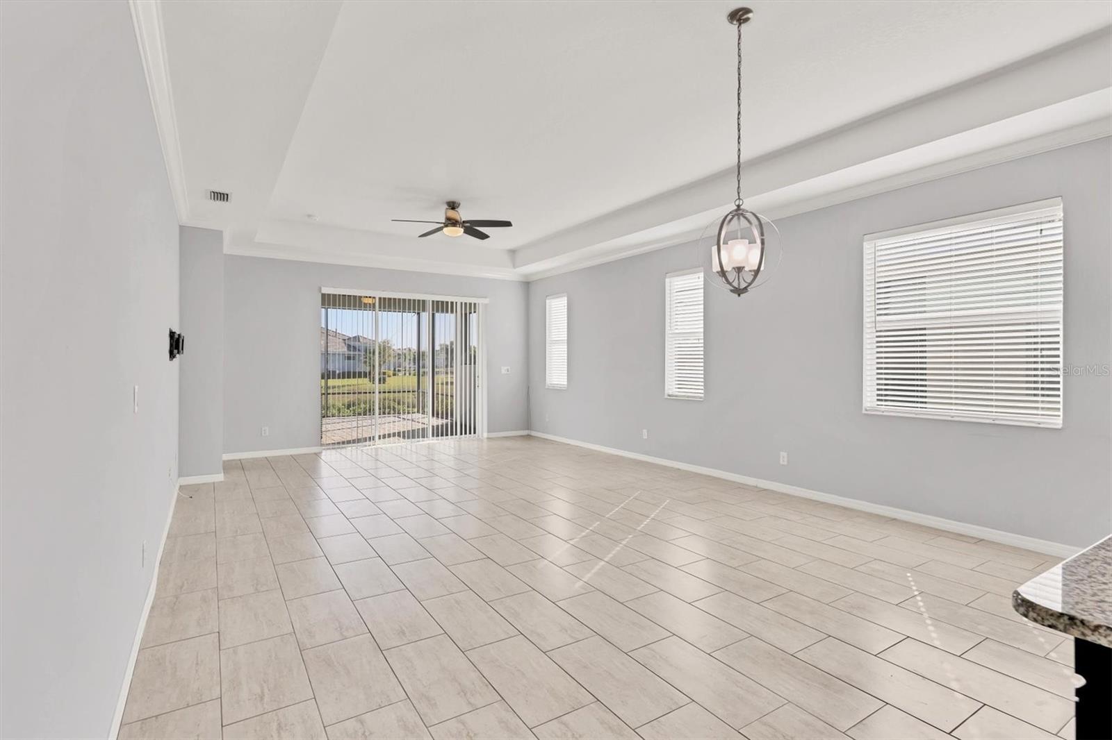 A wide-open layout, stylish finishes throughout, and a peaceful backyard setting define this 2-bedroom, 2-bath villa in University Village. The kitchen sits at the heart of the home, featuring abundant cabinetry, generous granite counter space, stainless steel appliances, and room for bar seating—an easy place to start the day, linger over meals, or settle in with a laptop and a cup of coffee. The dining area and living room connect seamlessly beneath a tray ceiling that adds architectural depth and a sense of openness to the main living space. Sliding doors draw you out to an extended paver lanai, creating a natural extension of the home with room to relax, dine, or simply enjoy the open backyard backdrop. Privately positioned off the back of the living area, the primary bedroom is set apart from the rest of the home, offering a quiet place to reset with two walk-in closets that provide generous, well-planned storage. The en suite bathroom is designed for efficiency and ease, featuring dual vanities and a linen closet that keeps daily essentials neatly within reach. The split-bedroom layout places the second bedroom at the front of the home with a full bathroom just outside, providing flexibility for guests, work-from-home needs, or everyday living that adapts over time. A dedicated laundry room adds another layer of practicality, complete with cabinetry and counter space that keeps storage organized and out of sight. University Village offers a setting that supports an easy, flexible routine, with sidewalks woven throughout the neighborhood, a resort-style community pool, and a dedicated dog park with shaded seating and tables. Association-maintained grounds, along with cable and internet, support a low-maintenance way of living while giving residents the freedom to enjoy the community with fewer day-to-day demands.With its open layout, extended lanai, and low-maintenance setting in University Village, this villa is ready for its next owner—schedule your private showing today!