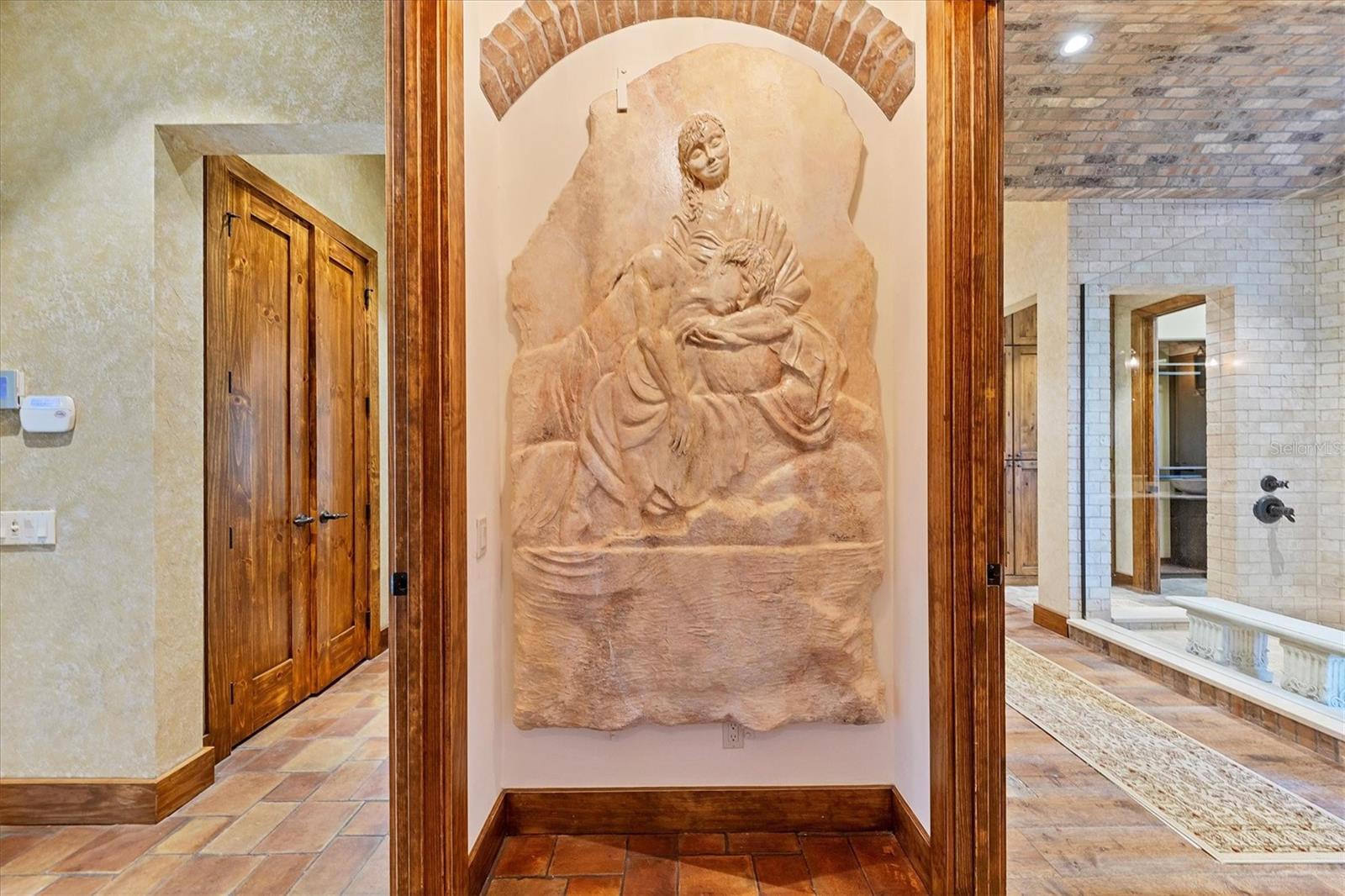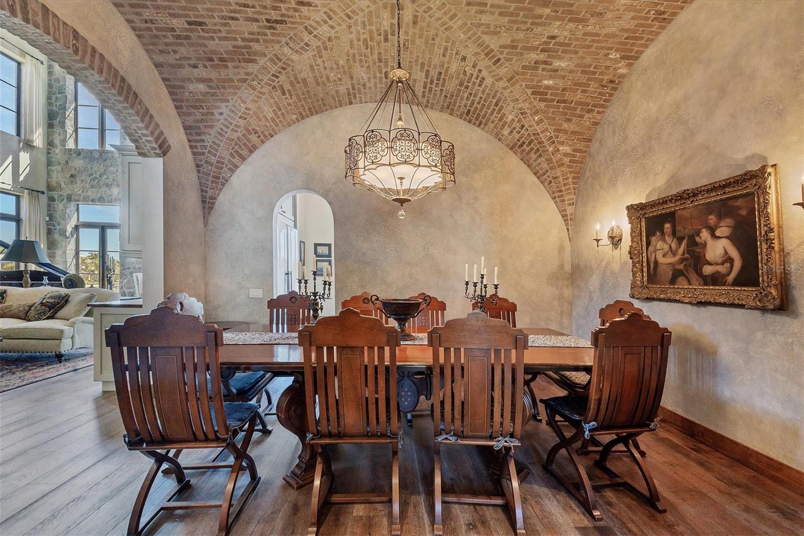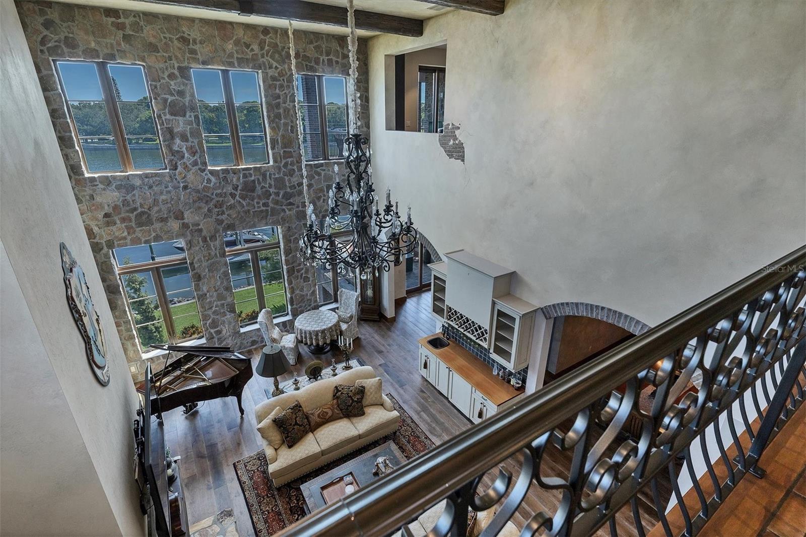 House never flooded, including during Hurricanes Milton and Helene, and protected by a full house generator! Lavishly embellished with Old World authenticity, this exceptional waterfront estate evokes the grandeur of a 17th century Tuscan farmhouse. Custom built by John Cannon, the home is set on what was once Ringling’s personal yacht basin, offering protected sailboat water, 180 feet of seawall, a private dock, two boat lifts, and a dedicated kayak lift platform, all framed by sweeping panoramic water views. From the moment of arrival, the level of craftsmanship is unmistakable. Walls are finished in aged plaster, hand made terra cotta floors have been acid washed and stained to reflect centuries of wear, and authentic frescoes and ceiling beams inspired by the Renaissance period add depth and character throughout. The great room provides a dramatic setting for entertaining with soaring 22 foot ceilings, a gas fireplace, and a wet bar accented by a hammered copper sink. The chef’s kitchen is equipped with an Italian eight burner gas range and Brazilian soapstone countertops, while the dining room features a rare brick vaulted ceiling that reinforces the home’s Mediterranean soul and creates a truly immersive dining experience. The primary suite is a romantic retreat with his and hers walk in closets and a spa like bath wrapped in rich wood and stone finishes. Additional spaces include two to three guest bedrooms, dual offices, a bonus room, and a wine room. A true 2,500 square foot ground level garage offers tandem parking for two to four plus vehicles, making it a dream for car collectors. Outdoor living is exceptional, with stone and wrought iron terraces, an outdoor kitchen and bar on the main level, all designed to capture natural breezes and expansive water views. The newly completed infinity edge pool and spa create a striking visual effect, with the water appearing to seamlessly spill into the bay, while two strategically placed fire pits add warmth and dramatic ambiance after sunset. This storybook residence is ideally located near Sarasota’s beaches, dining, and cultural attractions, offering a rare blend of architectural artistry, privacy, and timeless elegance.
