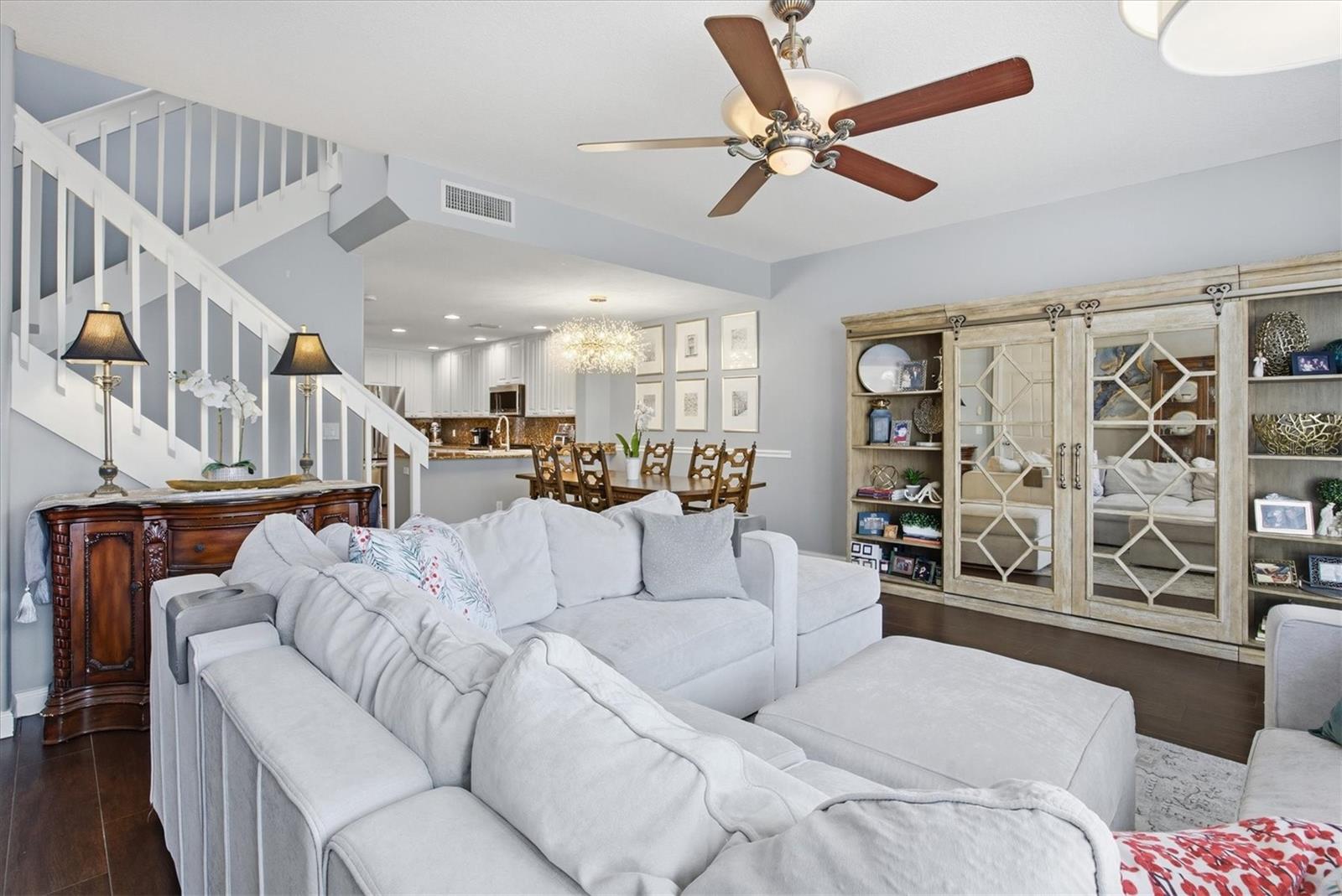 Welcome to one of Palmer Ranch’s most sought after, maintenance free communities, the resort style VillageWalk. This beautifully updated 3 bedroom, 3 bath Cayman model townhome, complete with a private heated pool, offers the perfect blend of comfort, durability, and Florida lifestyle living. Built by DiVosta with reinforced steel and poured concrete construction, the home features hurricane shutters for peace of mind. Inside, a bright, open floor plan is enhanced by fresh interior and exterior paint, wood look tile flooring throughout most of the home, along with plantation shutters on every window, creating a timeless and cohesive design. The kitchen has been beautifully refreshed with all new GE Profile appliances from 2025, including an induction stove, granite countertops, abundant cabinetry, and generous counter space, making it ideal for both everyday living and entertaining. The versatile layout offers three spacious primary style bedrooms, each with a walk in closet with built ins and a private ensuite bath. The downstairs bedroom opens to its own covered balcony and works perfectly as a home office, den, or guest retreat. Upstairs, one bedroom features a charming private balcony overlooking lush tropical landscaping, while the other includes a cozy nook ideal for a desk, lounge, or creative space. An upstairs laundry room includes a utility sink and extra cabinetry for added convenience. Step outside to the expansive screened in lanai with tranquil heated pool, where you can enjoy Florida living year round. The pool heater and pump were added in 2019, and a remote controlled awning provides effortless shade for relaxing or entertaining, making this space perfect for grilling and outdoor dining. Significant system updates include a new HVAC system installed in 2020, a new hot water heater installed in 2020, and a Tesla charger with upgraded electrical added in 2019. Additional highlights include a two car garage with ample room for a golf cart and storage, a built in vacuum system, and a large storage room located under the stairs. VillageWalk is not just a place to call home, it is a community designed for an active and engaging lifestyle. Residents enjoy exceptional amenities including a waterfront Town Center, café, salon, post office, gas station, meeting rooms, lap and lagoon pools, six Har Tru lighted tennis courts, pickleball, bocce, basketball, a state of the art fitness center, gift shop, lagoon tiki bar, and miles of scenic walking and biking trails throughout over 500 acres of beautifully landscaped preserve. A full calendar of clubs and activities offers something for every age and interest. Perfectly located near top rated schools, Legacy Trail, Siesta Key and area beaches, shopping, Costco, golf courses, parks, and Sarasota’s arts and cultural scene, VillageWalk truly offers the very best of Florida living.