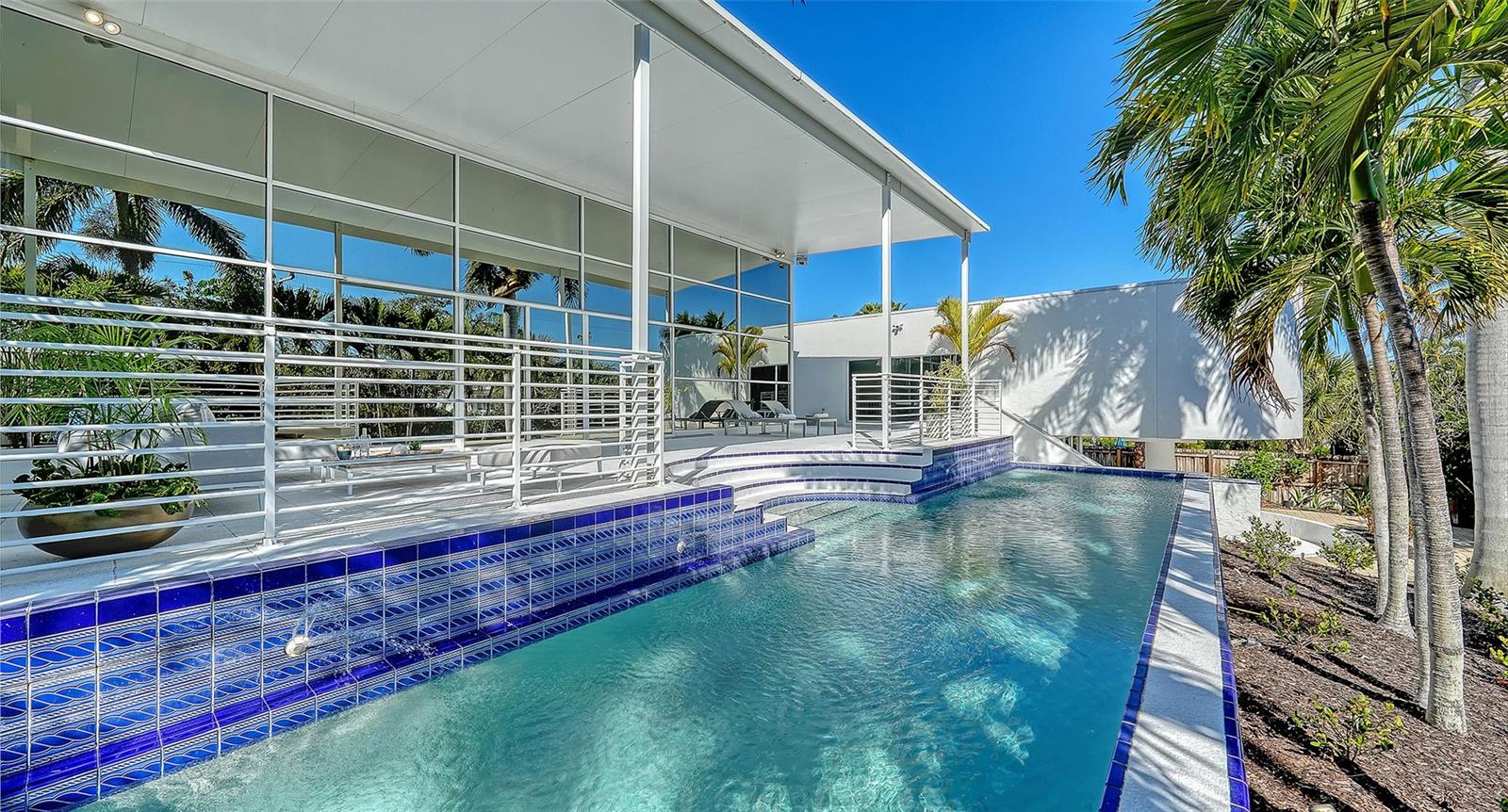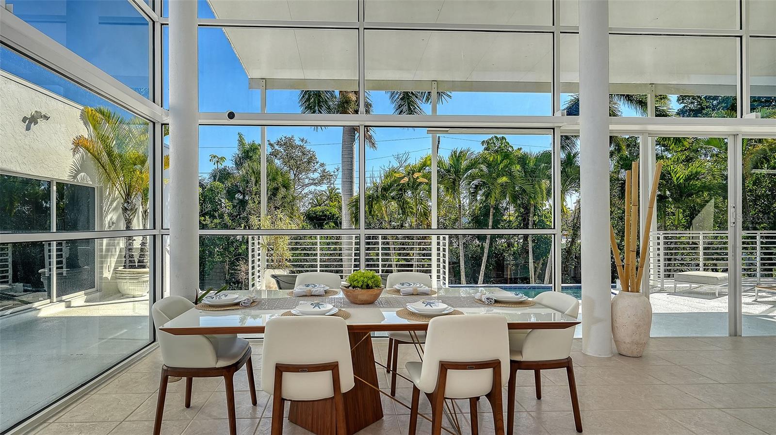 In the sought-after Lido Shores community with deeded beach access, this striking contemporary residence is a rare architectural offering designed by renowned Swiss architect Hans Ritschard. Thoughtfully updated while honoring its modernist roots, the home seamlessly blends timeless design with today’s lifestyle. At the heart of the home is a dramatic atrium, an architectural centerpiece designed for year-round enjoyment. Sixteen-foot floor-to-ceiling windows on three sides frame tranquil views of the 54ftx 18ft covered patio, the lap pool and lush palm-filled grounds, while clerestory windows introduce warm, indirect sunset light from the fourth side. A state-of-the-art climate control system ensures comfort in every season, making this space ideal for gathering, relaxing and entertaining, rain or shine. The newly renovated gourmet kitchen anchors the living spaces, featuring sleek finishes and an open-concept layout that overlooks the atrium, ideal for everyday living and hosting guests while preparing a favorite meal. The residence offers three bedrooms and three baths, along with a versatile ground-level flex space that can easily serve as an additional bedroom, home office or private gym. The lower level includes a walk-out family room with sliding glass doors that open directly to the outdoor living areas, enhancing the home’s seamless indoor-outdoor connection. A two-car garage provides ample storage, including a dedicated closet for beach gear, bikes and recreational equipment.