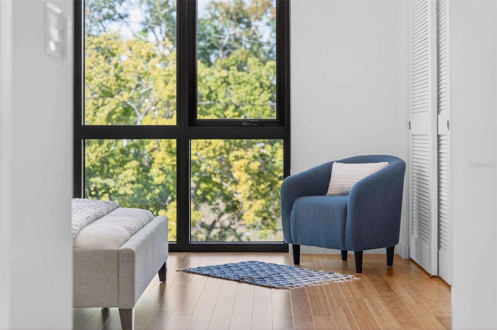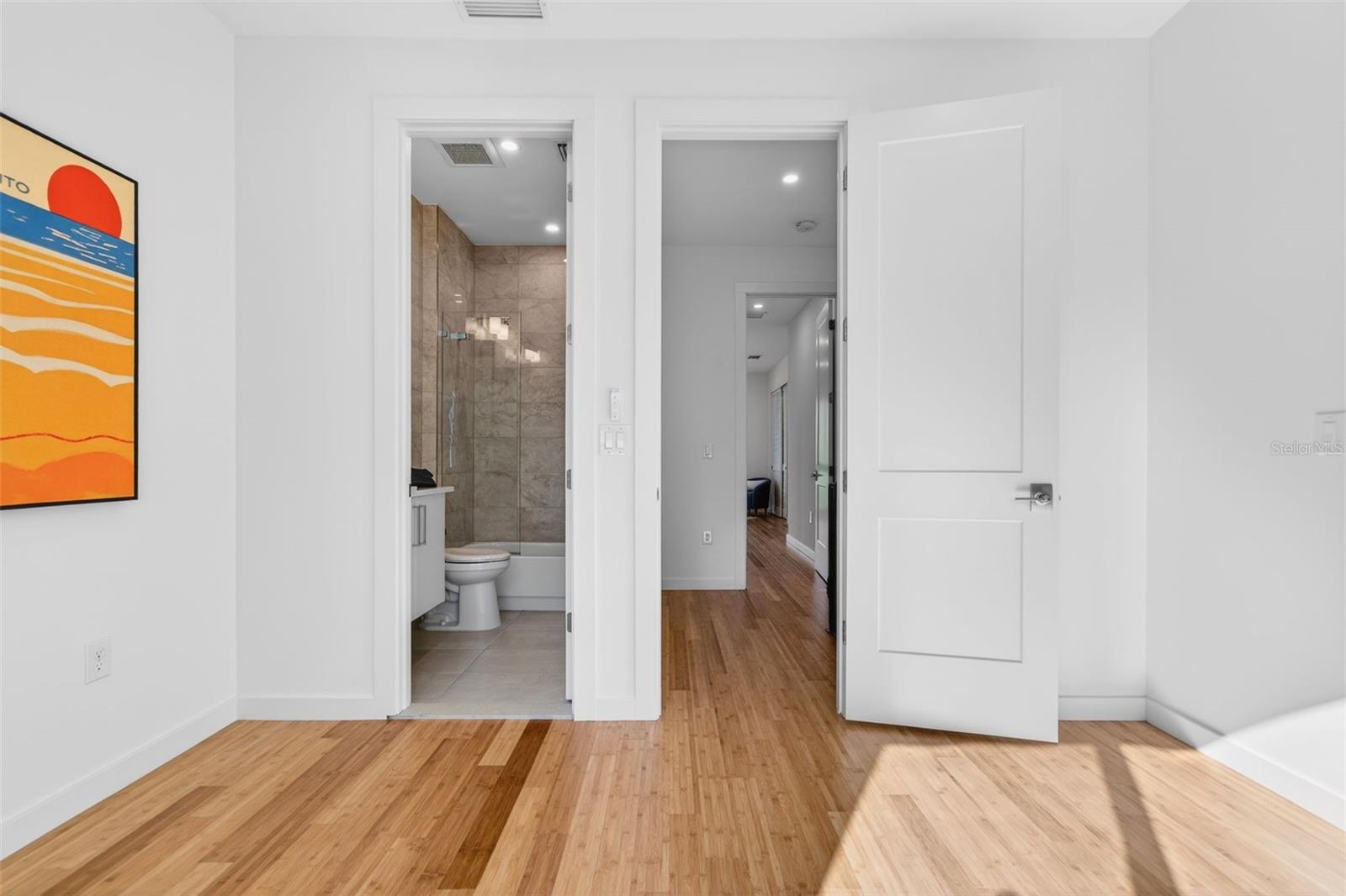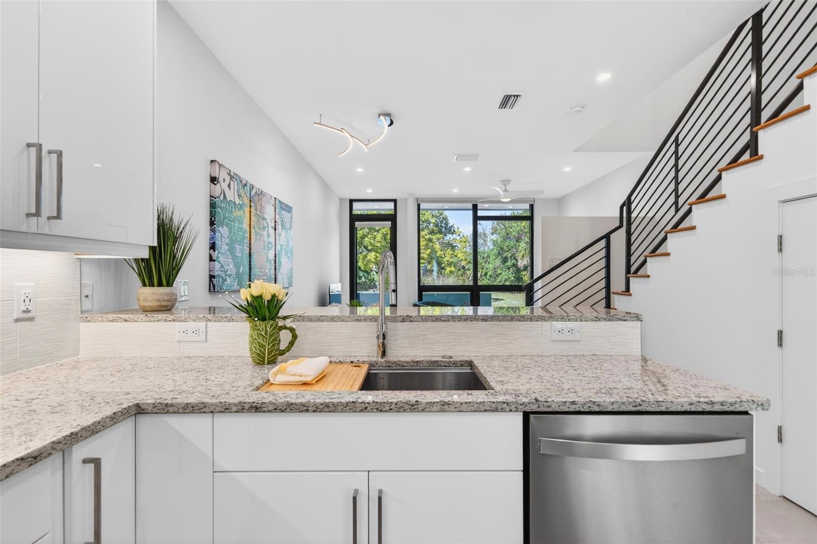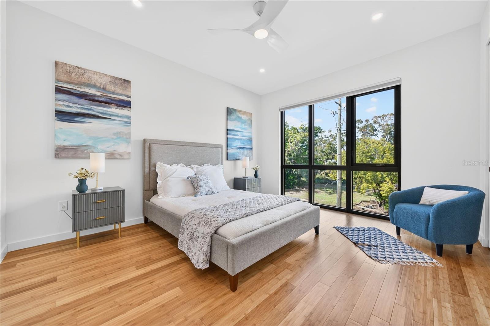 Enjoy new construction just steps from Sarasota's renowned 10-acre Gillespie Park and minutes to the Rosemary District and downtown. This never lived in townhome offers the perfect balance of walkable city living and a peaceful park-side setting, with 2 bedrooms, 2.5 baths, and 2 assigned parking spaces with direct access to the residence. Inside, the open floor plan is designed for both everyday comfort and entertaining, featuring a contemporary kitchen with stone countertops, stainless steel appliances, and quality cabinetry. Thoughtful finishes throughout include hardwood bamboo flooring, designer tile baths, impact windows and doors, and a full-size washer and dryer. Solid concrete block construction with sound-dampening insulation creates an impressively quiet interior, while smart home features and energy-efficient systems enhance convenience and comfort. Step outside to your own outdoor grill and seating area, then take advantage of Gillespie Park's pickleball, tennis and basketball courts, playground, dog park, and shaded green space right across the street. Located in Flood Zone X with a foundation elevated over 18 feet above sea level, this home offers additional peace of mind. A rare opportunity for low-maintenance downtown Sarasota living in a truly move-in-ready new home.
