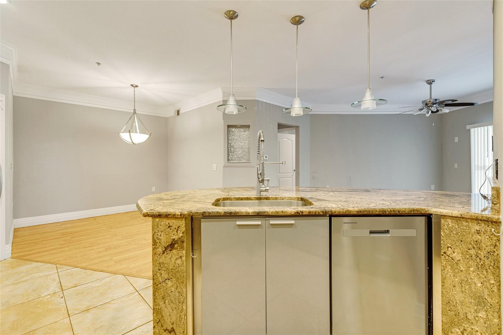 One or more photo(s) has been virtually staged. This updated and stylish first-floor condo is move-in ready, offering three bedrooms and two bathrooms with a functional split-bedroom layout and beautifully modern finishes throughout. The open-concept living space features crown molding, neutral paint, and updated laminate and tile flooring that create a fresh and inviting atmosphere. The kitchen is a standout with granite countertops, sleek stainless steel appliances, frosted glass cabinets, a designer backsplash, and a curved island with pendant lighting, perfect for entertaining. The spacious primary suite includes a walk-in closet and an updated en-suite bath with a walk-in shower. Enjoy the outdoors on your private screened-in lanai surrounded by tropical landscaping and tile flooring that extends the modern feel. In-unit laundry and two exterior storage closets offer added convenience. Water, sewer, trash, pest control, and exterior maintenance are all included in the monthly HOA for worry-free living. Located in the gated community of Serenade at Palmer Ranch, residents enjoy resort-style amenities including two heated pools, a spa, fitness center, tennis courts, clubhouse, and playground. Just minutes from shopping, dining, I-75, and world-renowned Siesta Key Beach, this home offers the ideal Sarasota lifestyle.