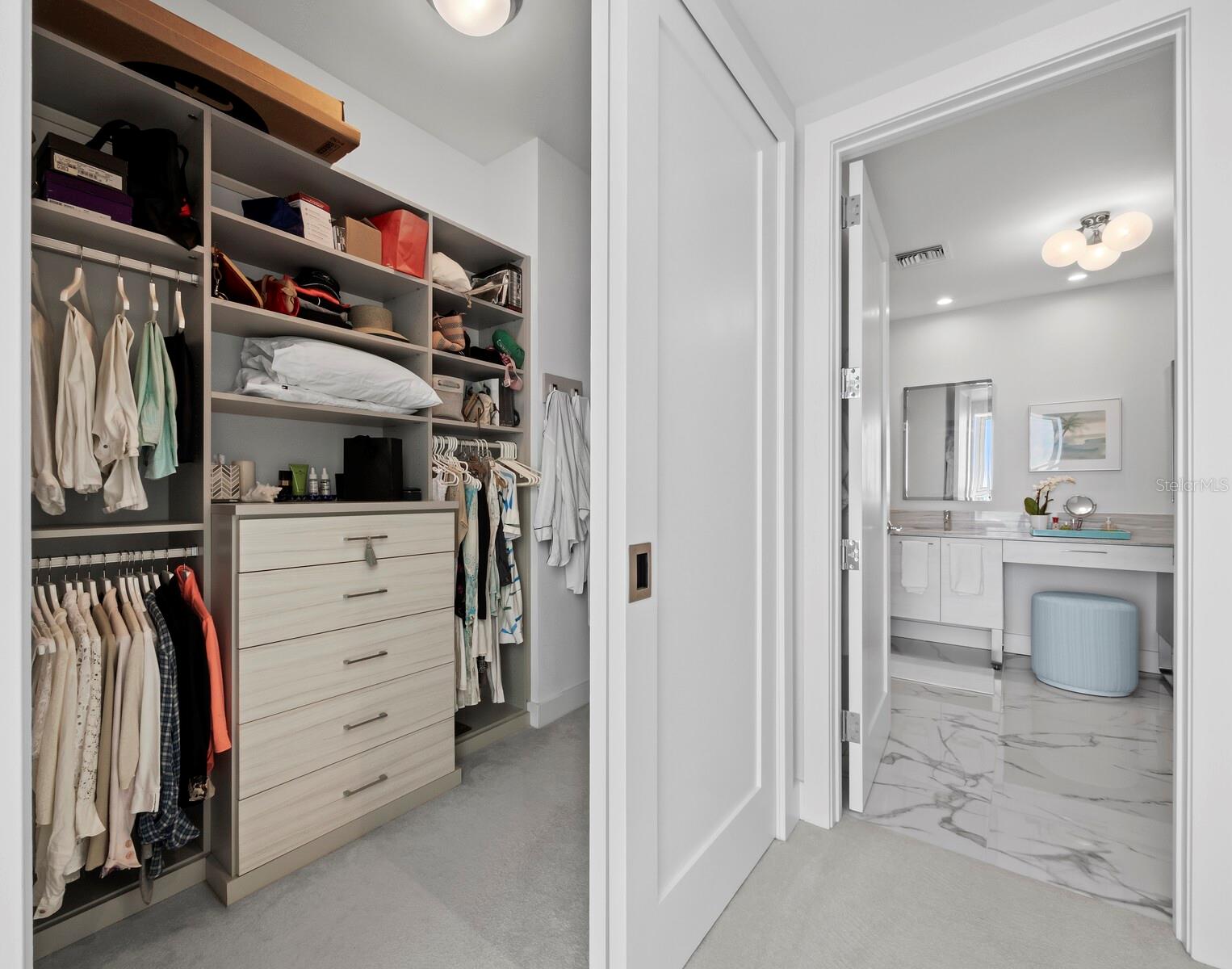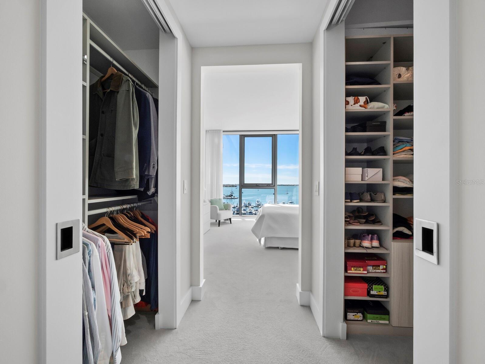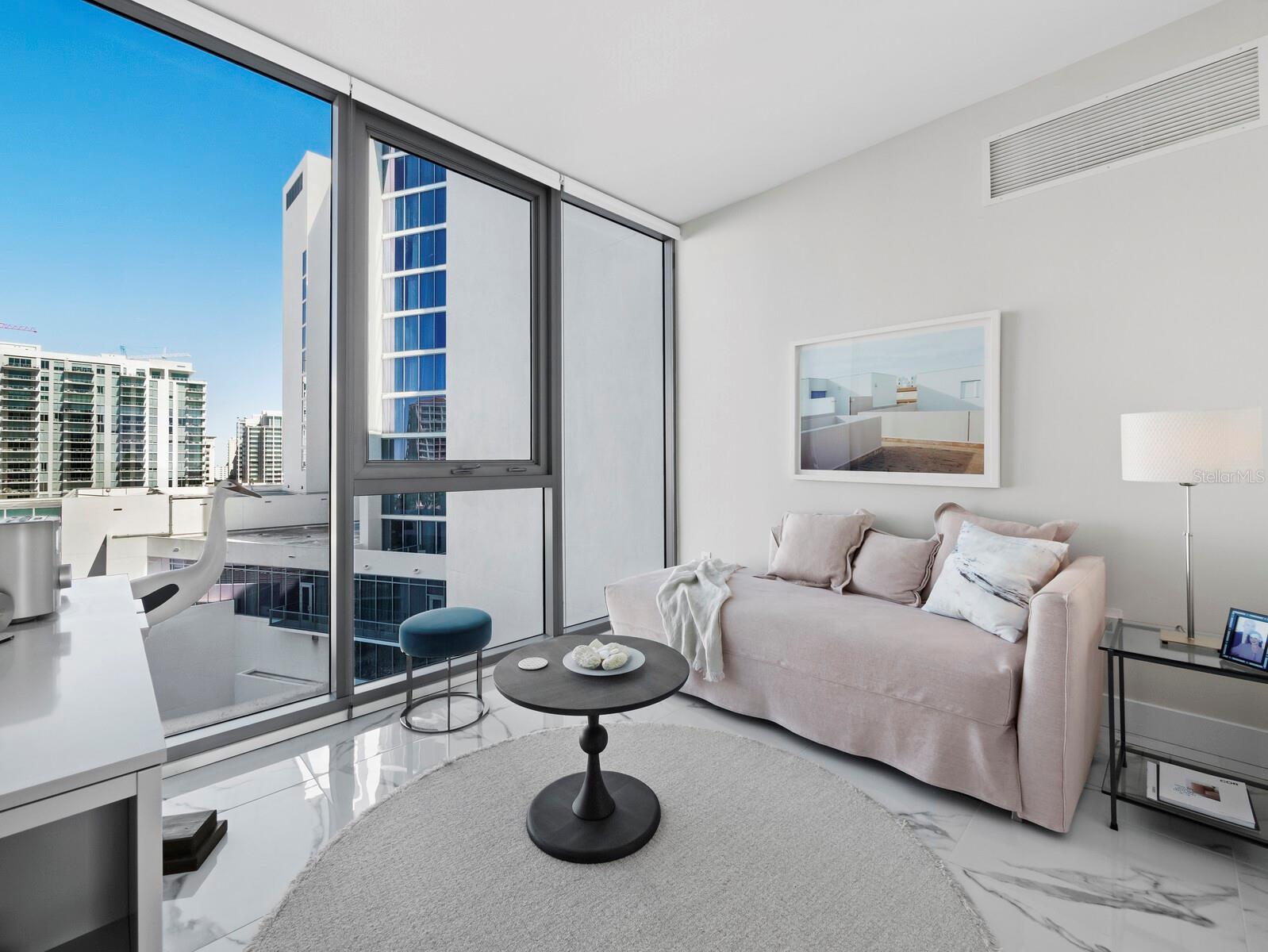 Numerous functional and design upgrades add significant value to this pristine, high-floor residence in one of Sarasota's most sought-after buildings. Positioned in a stack preferred for its through sight lines that showcase elevated vistas of both the waterfront and cityscape, this homes luxuries include large format porcelain tile flooring, motorized window coverings, premium custom cabinetry, custom built-ins in the living room and guest room, and designer lighting and fixtures throughout. Numerous functional and design upgrades add significant value to this pristine, high-floor residence in one of Sarasota's most sought-after buildings. Positioned in a stack preferred for its through sight lines that showcase elevated vistas of both the waterfront and cityscape, this homes luxuries include large format porcelain tile flooring, motorized window coverings, premium custom cabinetry, custom built-ins in the living room and guest room, and designer lighting and fixtures throughout. With a layout ideal for entertaining and personal retreat, 1,770 A/C square feet encompass two large ensuite bedrooms as well as a separate den and powder bath and a dedicated utility and laundry room for added convenience. Private elevator access opens to a central vestibule and corridor that features spectacular, unobstructed views through floor-to-ceiling windows on either side of the residence. In the primary living space, the gourmet kitchen and dining area flow easily with the living room, all overlooking and opening fully to a deep private terrace with coveted southwestern exposure and marina views. Full-height windows and sliding glass doors create a seamless connection to the outside, expanding the living space with additional room for lounging and dining. Accentuated by a chic modern pendant, the dining area inside accommodates a table for six or more, with adjacent counter seating at the oversized kitchen island. Arranged for optimal prep and hospitality, the kitchen features premium appliances and finishes including stainless double-door refrigerator, range and hood, wall oven, integrated microwave, and a deep basin sink. Bespoke cabinetry and surfaces complement the homes elevated modern style. Past the great room, the spacious owners suite enjoys exquisite west-facing views through a wall of glass, with room for seating, dual closets with custom built-in wardrobe systems, and a spa-like bathroom with separate water closet, glass enclosed walk-in shower and an extra-long double vanity with cosmetic station. On the other side of the home, a large guest room enjoys an ensuite with soaker tub and floor-to-ceiling windows overlooking Downtown Sarasota. City views extend to the adjacent den, a generously sized flex space ideal for a media lounge, private office, or occasional hospitality. Beyond the interior, this unit has the considerable advantage as one of only six in the building with a parking space that can be equipped for EV charging. Located within steps of the waterfront at the heart of Downtown Sarasota, VUE is renowned for its resort-style amenities and gleaming modern features. From the notable service amenities including valet and concierge to the heated pool and spa with lounge areas, firepits, and grill station, and state-of-the-art fitness and resident lounges, this building offers a truly luxurious lifestyle. Furnishings available by separate offer for the ultimate convenience of turnkey acquisition.