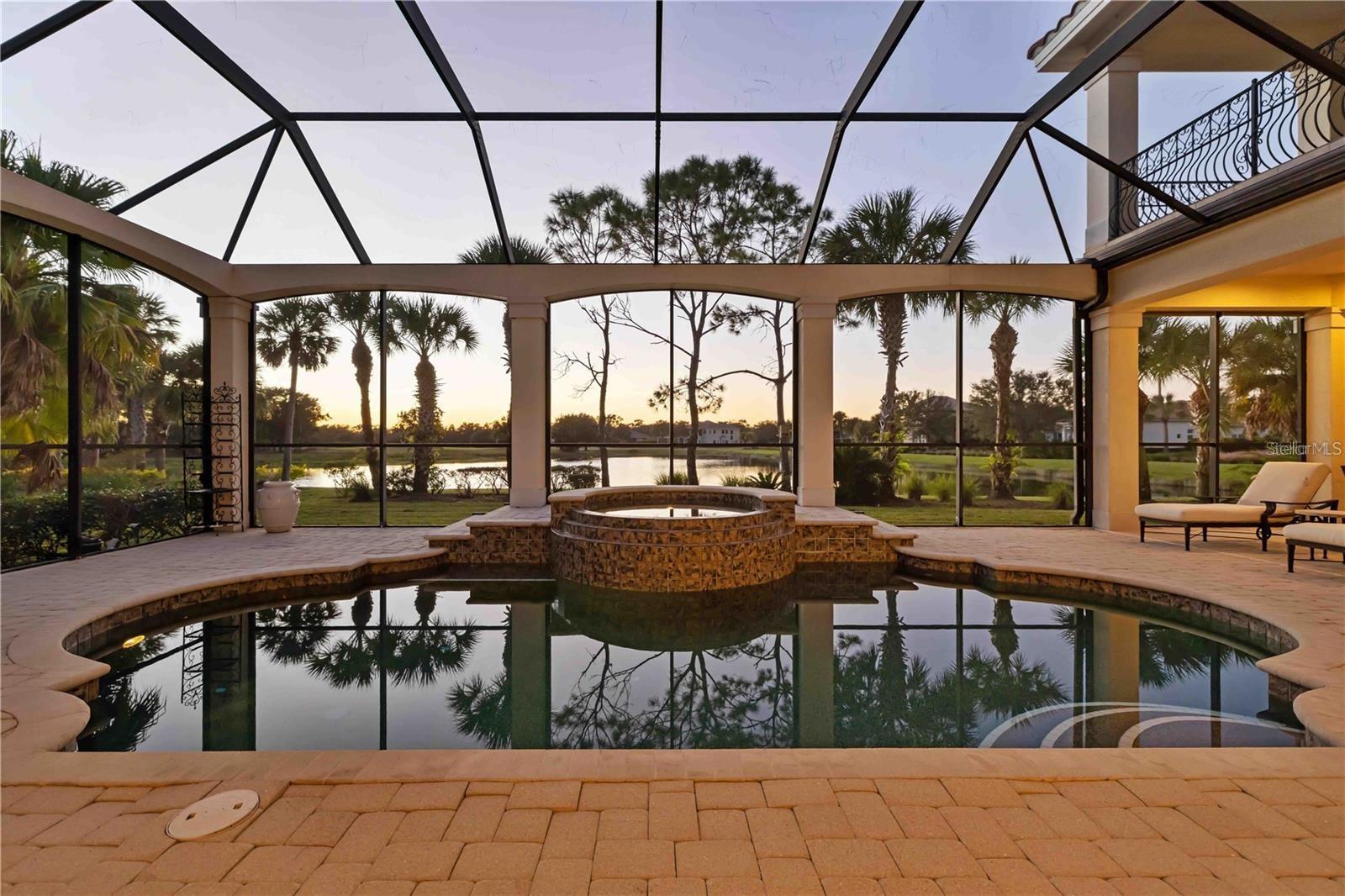 Welcome to one of the most remarkable estates in The Founders Club, set on an expansive 0.66-acre lakefront homesite offering unmatched privacy, breathtaking water views, and a refined living experience that is nearly impossible to replicate. Thoughtfully designed and impressively upgraded, this architectural masterpiece blends elegance, serenity, and true estate-style living in one of Sarasota’s most exclusive guard-gated communities. Step inside and immediately feel the impact of the dramatically high ceilings that elevate the living and dining spaces with natural light and grand proportions. Throughout the home, rich travertine flooring—including upgraded travertine in all bedrooms and closets—creates a seamless, luxurious flow. At the heart of the home is an entertainer’s dream: a beautifully appointed full bar area complete with its own climate-controlled wine cellar, refrigerator, and sink—perfect for intimate evenings or large gatherings. Nearby, a dedicated home theatre delivers a cinema-quality experience, fully enclosed to maximize sound and immersion. The primary suite is a sanctuary unto itself, featuring a stunning spa-inspired bathroom with onyx countertops, an oversized car-wash style walk-through shower, and a private outdoor bath garden—a retreat designed for pure relaxation. Dual walk-in closets have been thoughtfully customized with separate his-and-hers spaces. Throughout the home, carefully curated details set it apart: rare green onyx flooring in the powder room and pool bath, elegant Swarovski crystal chandeliers, natural gas fireplaces both indoors and out, and a whole-house audio system with speakers on both levels. Every element has been crafted for luxury living. Ideal for multigenerational living or hosting guests, all four bedrooms include private ensuite baths. The second floor extends the living experience with a spacious family room featuring a bar area, tonal machine, and a large balcony that frames magnificent panoramic lake views. Outdoor living is elevated to resort style with a lanai that includes both a full bathroom and a powder room—a rare luxury that enhances poolside convenience and entertaining on a grand scale. The spacious four-car garage offers abundant parking and storage for vehicles, golf carts, or hobbies. Set within a boutique community known for its championship golf course, lush landscaping, and ultimate privacy, this home represents a rare opportunity to own a true Sarasota luxury estate—one where thoughtful design, high-end materials, and breathtaking views blend seamlessly to create an extraordinary living experience.