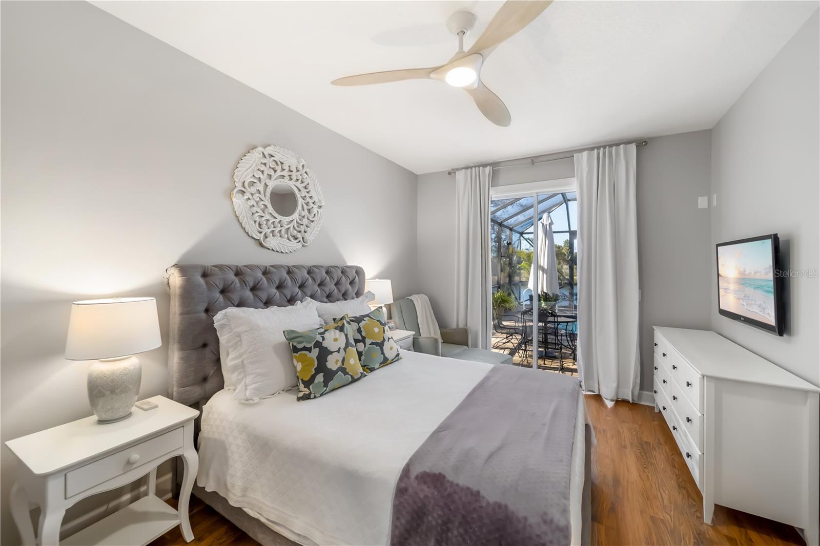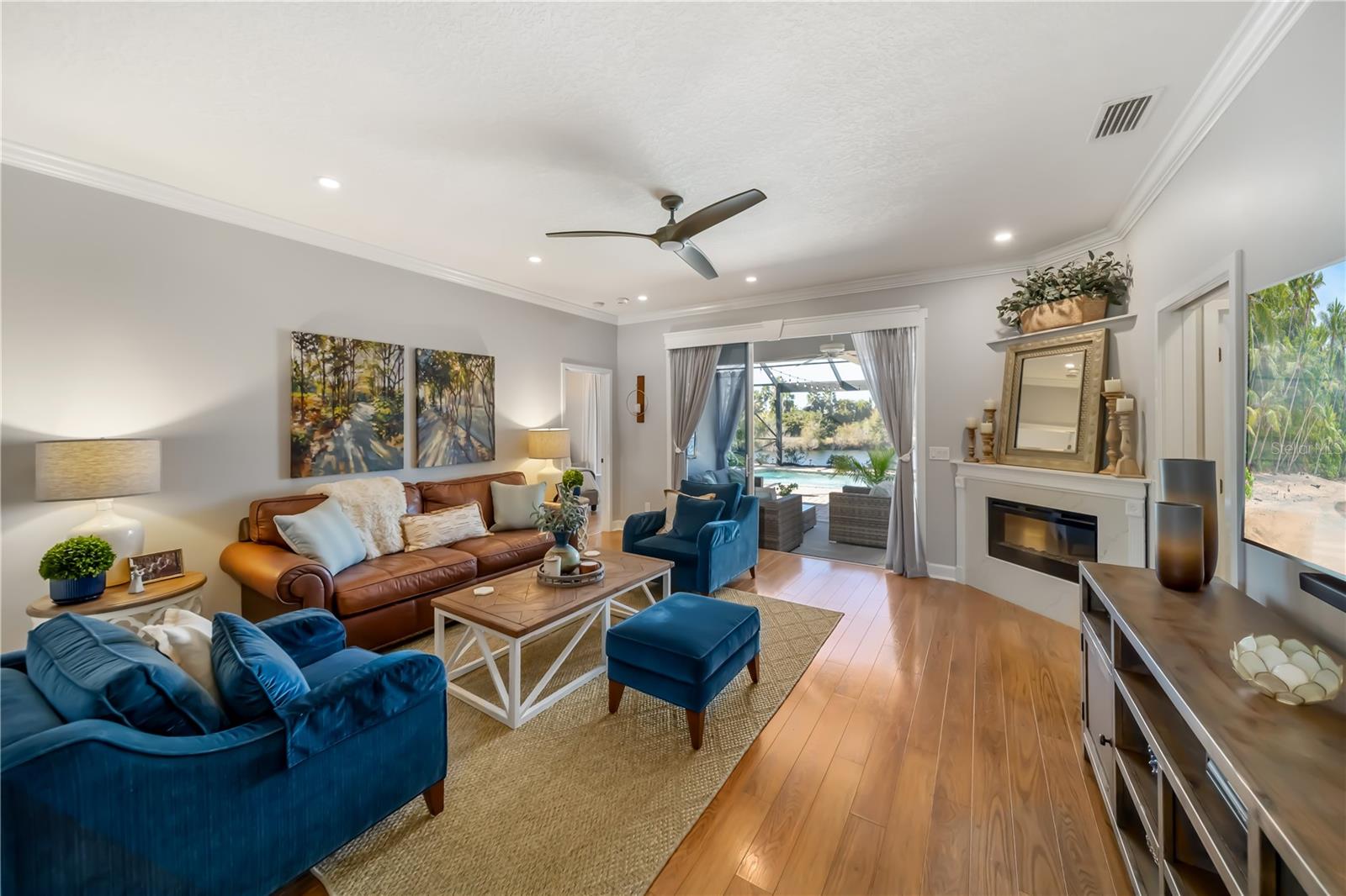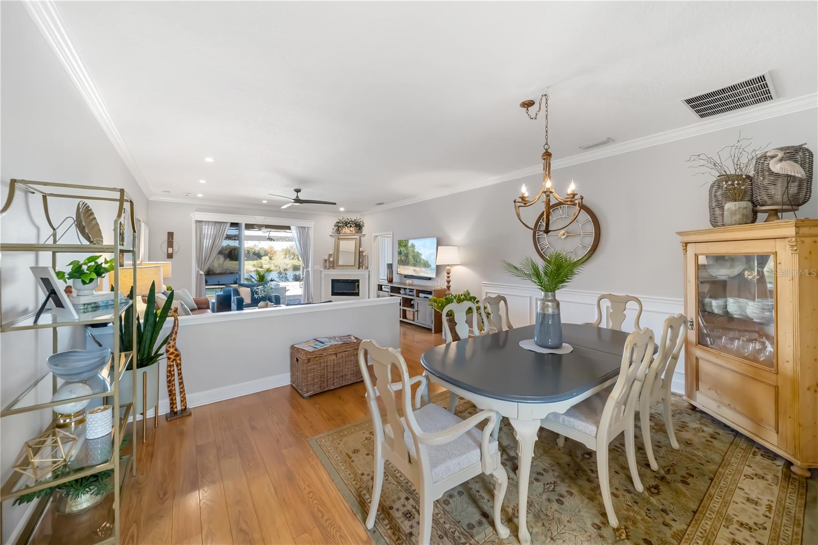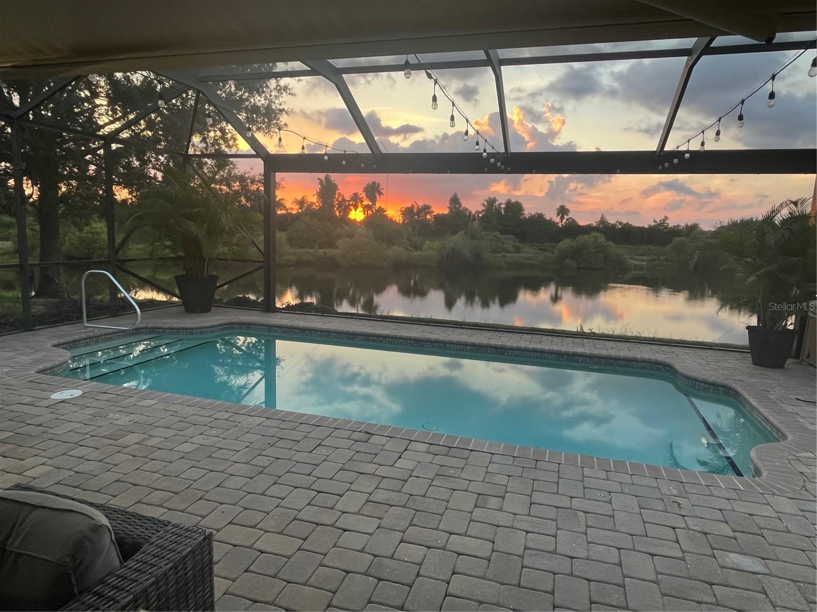 Enjoy breathtaking views and stunning Florida sunsets right from your backyard in this 3 Bedroom, 2 Full Bath, model-like Home on the Water, with NEW ROOF! NO CDD fees and low HOA dues, this exceptional Lakefront Home offers outstanding value. The expansive lanai features a 28’ x 40’ seamless illusion screen blending indoor and outdoor living, with a heated saltwater pool, covered sitting area with a 10’ x 18’ motorized retractable awning, TV, outdoor kitchen with Lynx BBQ grill, updated burner and briquette tray, refrigerator, vent hood, and sink—perfect for outdoor entertaining! There's also a playground right across from your front door as well! Inside, the beautiful look of hardwood flooring with the convenience and durability of laminate flows throughout the house, complemented by updated light fixtures and a palette of natural, neutral hues. The kitchen offers stainless steel appliances, granite countertops, decorative backsplash, and large porcelain farmhouse-style sink. The primary suite is separate from guest bedrooms and includes dual vanities, updated countertops, a walk-in shower, and lanai access. Beautiful landscaping enhances both the front and rear yards, supported by an efficient irrigation system. A new roof adds peace of mind. Additional highlights include hurricane shutters, a garage with hanging storage racks and attic pull-down access. Ideally located near UTC Mall, the airport, great dining options, & more! this home offers Florida living at its finest.