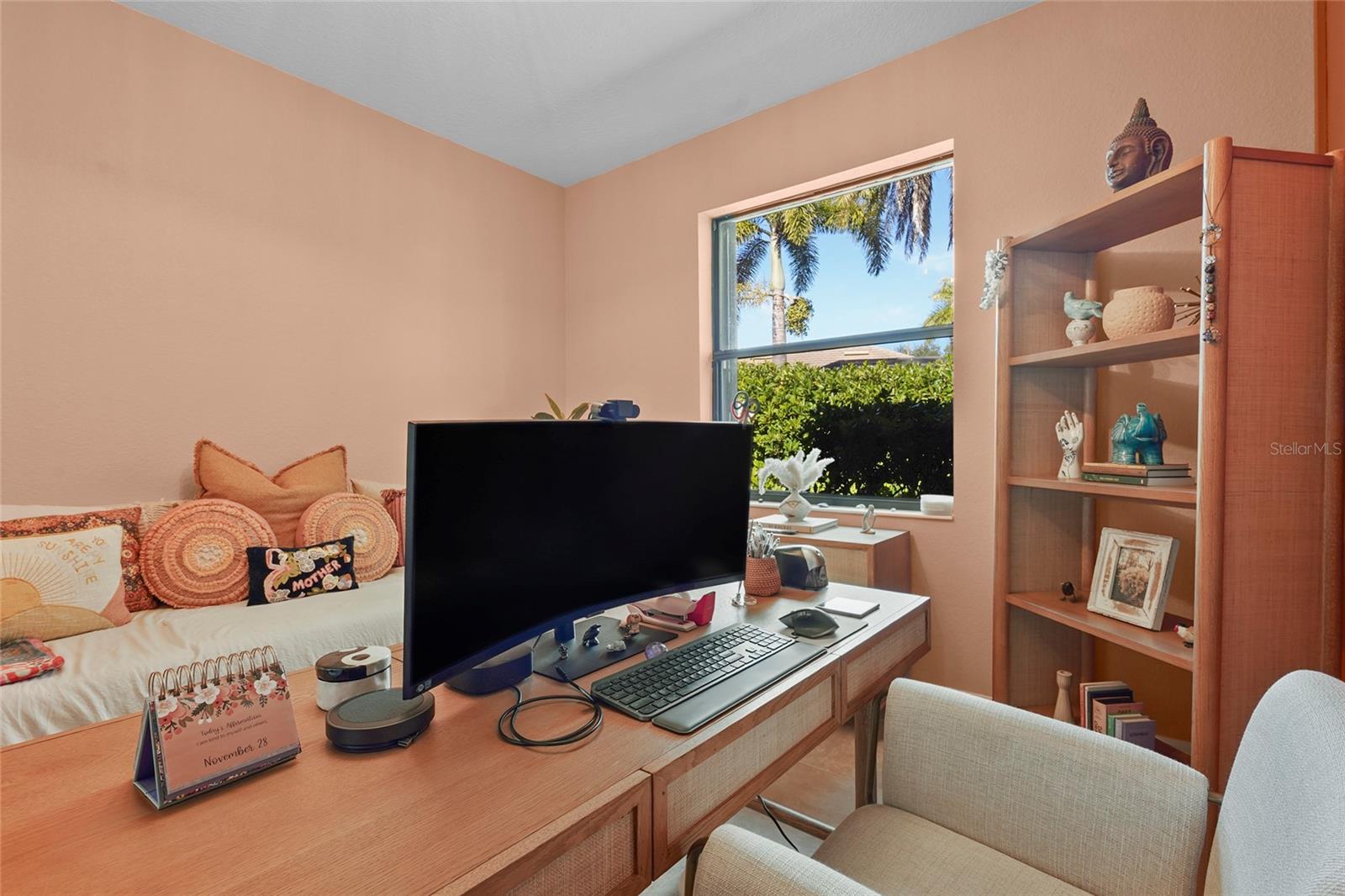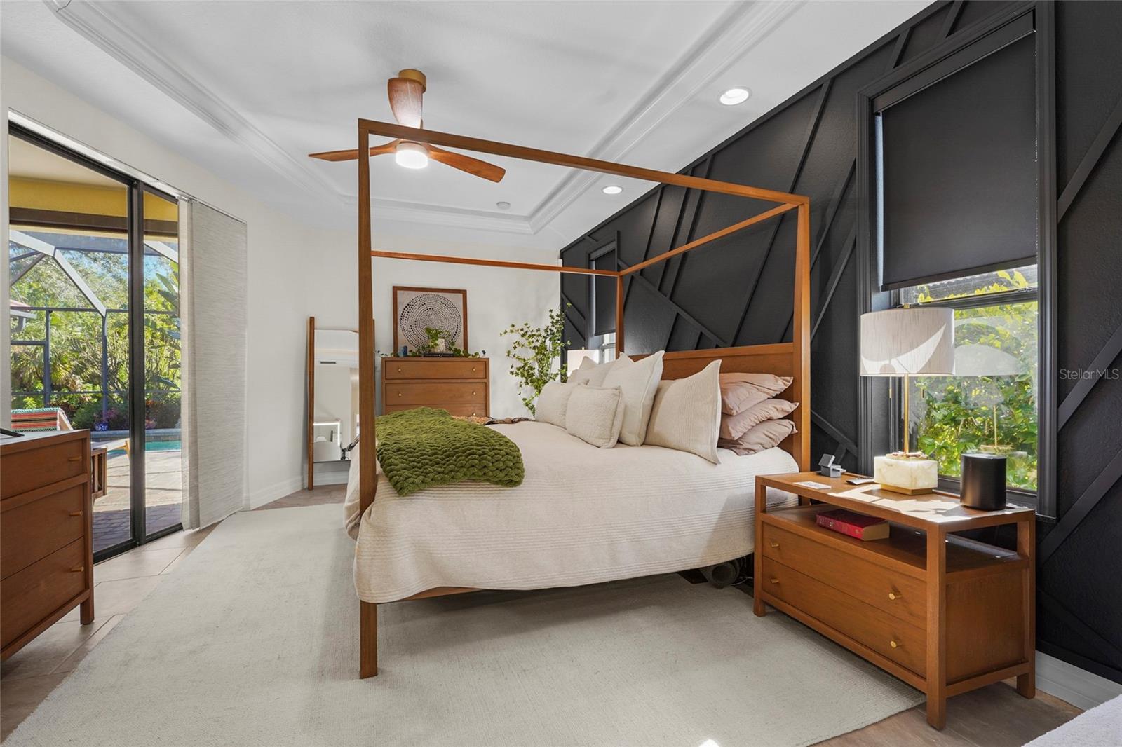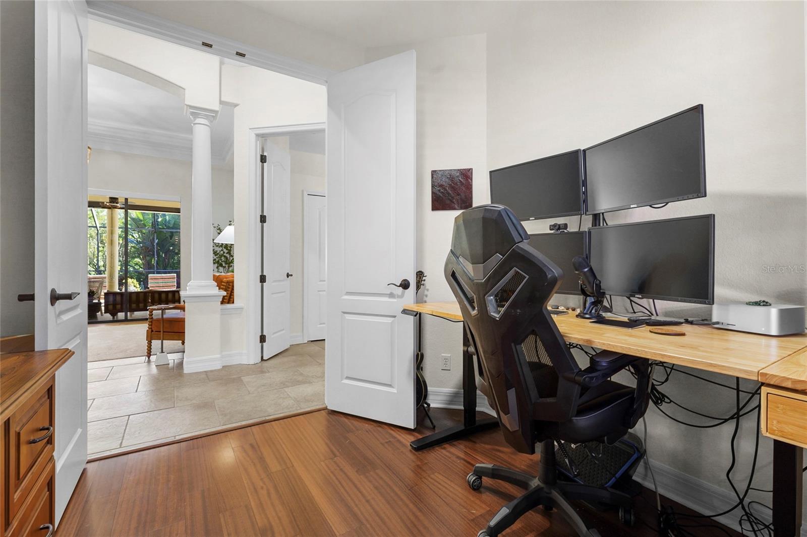 Located in the desirable gated community of The Hammocks, this custom pool home is set on a premium preserve-view lot with mature landscaping. 4 bedroom 3 bathrooms an office and a three-car garage! The open layout flows from the formal living areas to an expansive lanai with a heated pool and spa overlooking tranquil preserve views. The chef’s kitchen features a five-burner gas cooktop with updated vent, double ovens, large center island, slide-out cabinetry, and a double-sided gas fireplace shared with the living room. A unique highlight is the fully enclosed, climate-controlled second kitchen/outdoor entertaining space with gas grill, side burner, commercial vent hood, refrigerator, dishwasher, wine and beverage coolers, and direct pool access. The primary suite includes double-door entry, private lanai access, dual walk-in closets with upgraded systems, tray ceiling with crown molding, Jacuzzi tub, walk-in shower, and dual vanities. Additional features include a custom-built office with wood flooring, full hurricane protection, and a whole-house gas generator (2019). Major updates include A/C systems (2021 & 2016), pool pump (2020), pool heater (2023), dishwasher (2025), washer and dryer (2021), wine and beverage refrigerators (2021), refrigerator (2025) and a new water heater. Private well irrigation and landscape lighting complete this well-maintained home in one of Sarasota’s desirable gated communities.