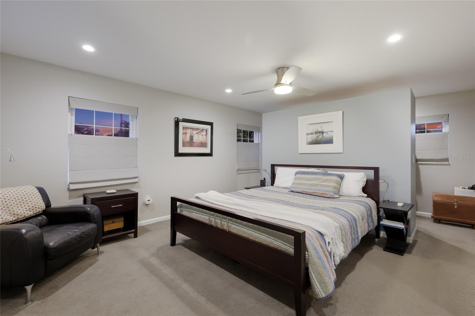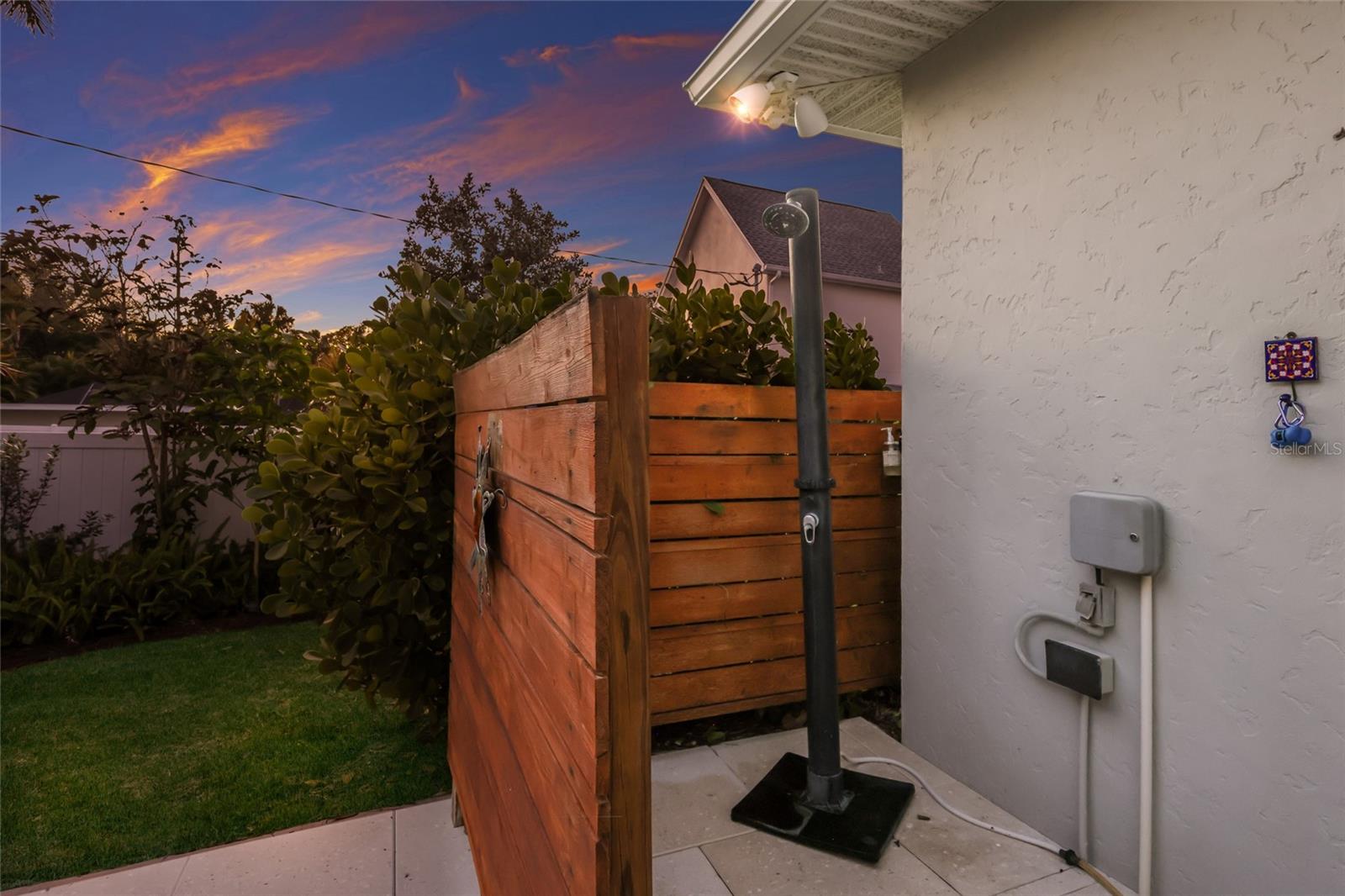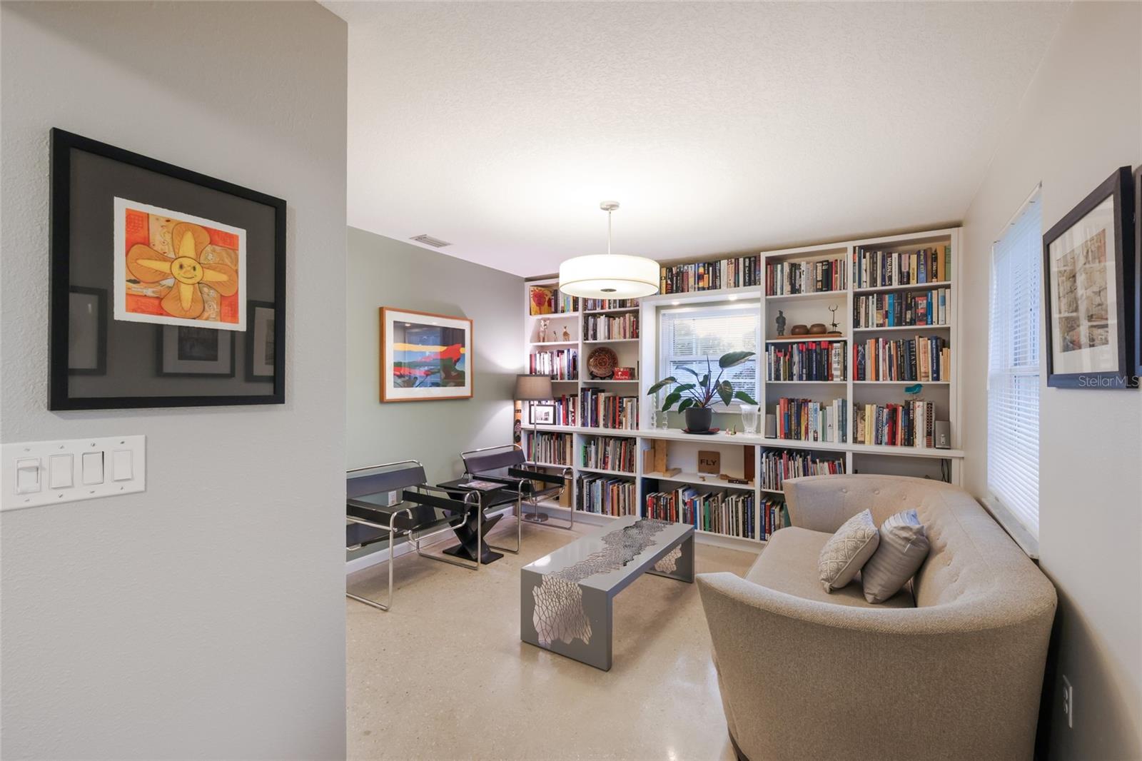 Discover the ultimate coastal retreat at 428 Sapphire Drive, a stunning block-construction residence situated on a rare and expansive double lot in the prestigious Sapphire Shores area. A long driveway and winding sidewalk lead you through a beautifully landscaped front yard to this secluded haven, which is set back from the street for maximum privacy. Inside, the home exudes a modern, industrial-chic aesthetic featuring sleek polished concrete floors, soaring vaulted ceilings, and a fresh interior paint palette. The open-concept gourmet kitchen is a focal point, illuminated by a bright skylight and appointed with premium Quartz countertops, abundant cabinetry, and a high-end stainless appliance suite including a Bosch cooktop and refrigerator alongside a KitchenAid double oven. The thoughtful layout offers exceptional flexibility; the current library, featuring a recently replaced north-facing impact window, was originally a third bedroom and can easily be restored to its original configuration. Seamlessly connecting the interior to the outdoor oasis are sliding pocket glass doors that retreat to open the living area to the lanai, offering both an elegant architectural feature and an added layer of protection for the block-construction core. The master suite serves as a private sanctuary with its own bay-facing impact window, a spacious walk-around closet, and a luxurious ensuite bathroom featuring a deep soaker tub and a separate walk-in shower. Significant structural upgrades provide peace of mind, including a new metal roof installed in 2023 and brand-new hurricane-rated garage doors added in 2025. The epoxy-finished garage also comes equipped with a Tesla charging station, catering to modern efficiency. The outdoor living space is a true oasis, fully enclosed by a vinyl privacy fence. Relax in the heated saltwater pool surrounded by elegant Shellock pavers, or enjoy the convenience of the lanai’s solar shower. The sprawling backyard is a nature lover’s dream, boasting a dedicated butterfly garden, a cozy fire pit, and an irrigation system powered by well water. A versatile detached storage building, currently utilized as a home gym, is equipped with its own air conditioning unit and dedicated kayak storage. Perfectly positioned just minutes from Downtown Sarasota, this home is also a short stroll from the Ringling Museum and the scenic bayfront paths of Sapphire Shores Park.