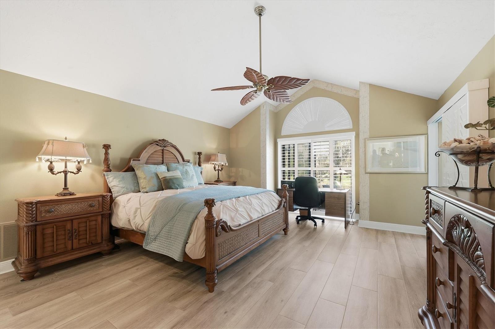Tucked within the gated Prestancia golf community, 4221 Escondito Circle offers three bedrooms, two-and-a-half baths, and nearly 3,000 square feet of thoughtfully designed living space that blends architectural character with effortless indoor–outdoor living. Lush, mature landscaping lines the graceful walkway to double front doors, while a private side courtyard with a tranquil water feature creates a peaceful sense of arrival before stepping inside. The foyer opens to expansive living spaces framed by soaring vaulted ceilings, arched transitions, and a striking chandelier, with multiple windows drawing in soft natural light and views of the courtyard. The living room feels both grand and inviting, anchored by a wood-burning fireplace with marble and wood detailing and framed by large arched windows. Beyond, the family room offers a second fireplace, custom built-in shelving with lower cabinetry, and walls of glass that connect seamlessly to the lanai. Sliding doors and transom windows fill the space with light while creating an easy indoor–outdoor flow ideal for everyday living and entertaining. At the heart of the home, the kitchen blends warmth and functionality with rich cherry cabinetry, granite countertops, professional-grade appliances, and generous bar seating for six. Five recessed display niches crown the cabinetry, adding architectural interest, while a built-in desk and pantry storage enhance everyday convenience. A pocket door leads to the formal dining room, where vaulted ceilings, a chandelier, and courtyard-facing windows create an elegant setting for gatherings. Adjacent to the kitchen, the breakfast nook is wrapped in picture windows and dual sliders, offering panoramic views of the pool and pond on three sides. The primary suite is thoughtfully positioned for privacy, featuring vaulted ceilings, serene pond views through plantation-shuttered windows, and direct lanai access. A charming bump-out provides space for a desk or sitting area, while the spa-inspired bath offers a glass-enclosed shower with multi-function panel, a corner Jacuzzi tub with marble surround beneath a chandelier, custom cabinetry, and a generous walk-in closet with built-ins. Two additional vaulted bedrooms share a Jack-and-Jill bath with a tub-shower combination and decorative tilework, and one bedroom opens directly to the lanai. A convenient powder room, well-appointed laundry with cabinetry and utility sink, and an oversized two-car garage with epoxy floors and built-in storage complete the interior. Outside, the screened lanai becomes a natural extension of the living space, featuring stamped concrete decking, brick coping, multiple seating areas, ceiling fans, and a hot tub alongside the private pool. Tranquil pond views provide a picturesque backdrop, creating a setting equally suited for quiet mornings or relaxed evenings with friends. Located in Palmer Ranch within Prestancia, residents enjoy a gated lifestyle near TPC Prestancia’s two championship golf courses, with optional memberships available. Just 5.5 miles from Siesta Key Beach and minutes from Sarasota’s dining, shopping, the Legacy Trail and cultural attractions.