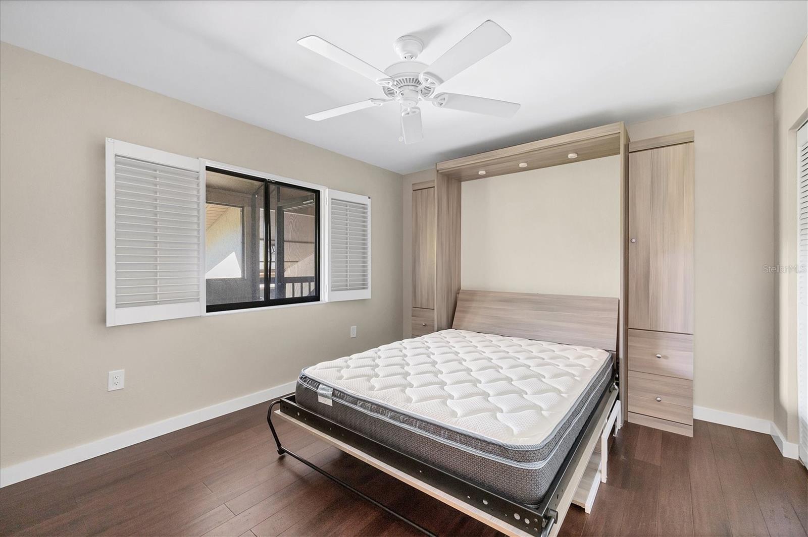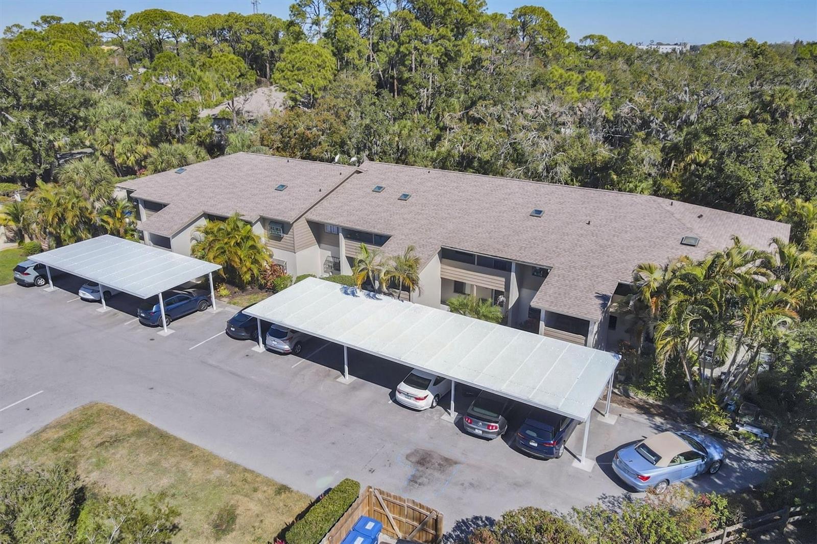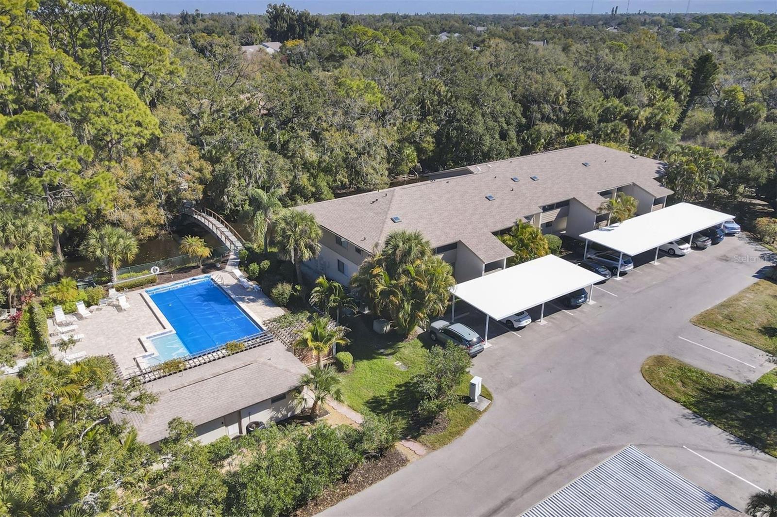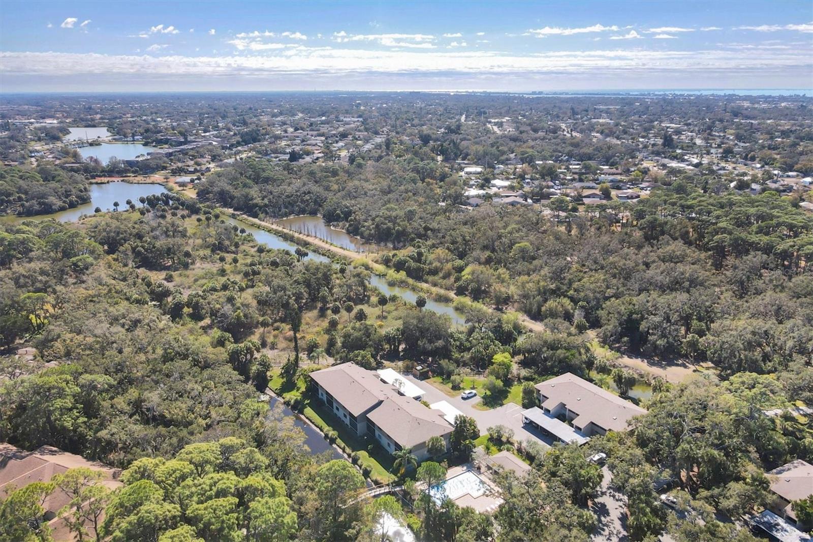 Welcome to Crooked Creek, a hidden gem in Sarasota adjacent to the Red Bug Slough Preserve. This beautifully maintained 2-bedroom, 2-bath 2nd floor residence was completely updated in 2021 and offers serene views of Crooked Creek, a charming wooden bridge, and lush park-like surroundings. The open and airy floor plan features hardwood floors and tile throughout, plantation shutters, a skylight at entry, and modern finishes. The updated kitchen includes white cabinetry, solid surface countertops with a large peninsula, tile backsplash, smart stainless steel appliances, a spacious pantry, and a garden window. The primary suite enjoys peaceful water, a walk-in closet, linen closet and sliding doors to a covered screened lanai. The updated bath has a washer/ dryer closet, as well as tile floors, a modern vanity, and tile shower . The guest bedroom offers flexible use with a built-in workstation and queen-size Murphy bed. Additional features include two screened covered lanais, reverse osmosis water system, covered carport, and ample guest parking. Crooked Creek is a 78-unit community offering a heated resurfaced pool, updated poolside kitchen, gazebo with seating, gas and charcoal grills, tennis/pickleball court, community storage with individual lockers, newer roofs (2019), new carports, and recently painted buildings. HOA fees have been reduced by $69 per month from 2025, reflecting strong reserves and excellent financial management. Conveniently located minutes from Siesta Key Beach, Gulf Gate, downtown Sarasota, shopping, and dining. A true nature lover’s paradise.