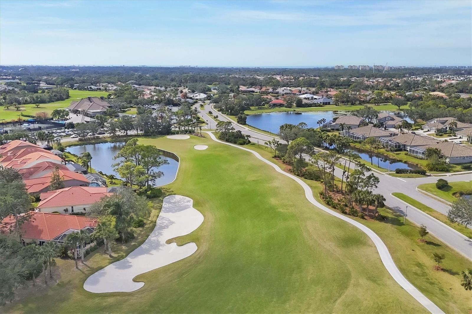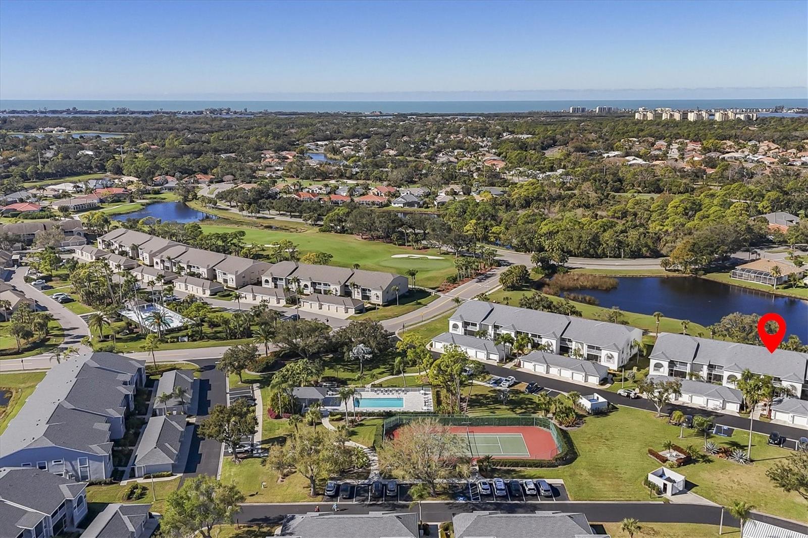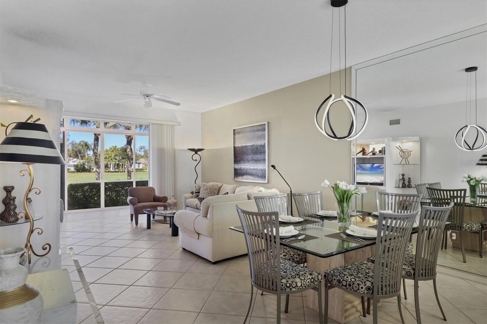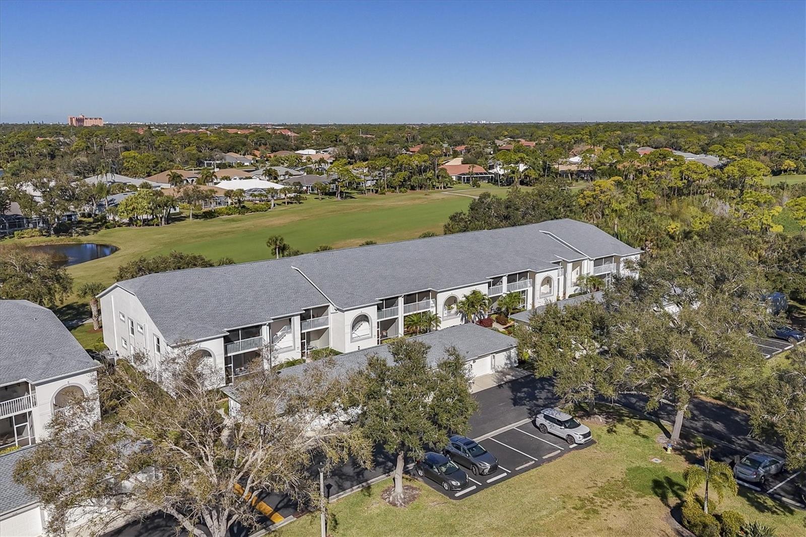 This highly sought-after first-floor condo, in Stoneybrook Golf & Country Club, offers 2 bedrooms, 2 full baths, front and rear lanais, and a detached garage. Thoughtfully updated, the residence features newer appliances, tile flooring throughout the main living areas, and a glass-enclosed rear lanai—perfect for enjoying year-round indoor-outdoor living. Enjoy serene views of the 18th fairway with a picturesque backdrop of a pond, palm trees, and mature live oaks. Located in Veranda Greens North, residents enjoy a nearby community pool and tennis court, along with full access to the exceptional Stoneybrook Golf & Country Club lifestyle. Amenities include a recently modernized 18-hole championship golf course, tennis, fitness center, pro shop, bocce ball, and a restaurant with both indoor and outdoor dining, plus a full bar. Ideally situated near the Legacy Trail and just minutes from Nokomis Beach, Siesta Key Beach, shopping, dining, and entertainment. This unit is being sold turnkey furnished, making it truly move-in ready. As an added value, the seller has paid the 2024 golf course modernization assessment in full saving the buyer over $6,000. More than a home, this is the Stoneybrook lifestyle.
