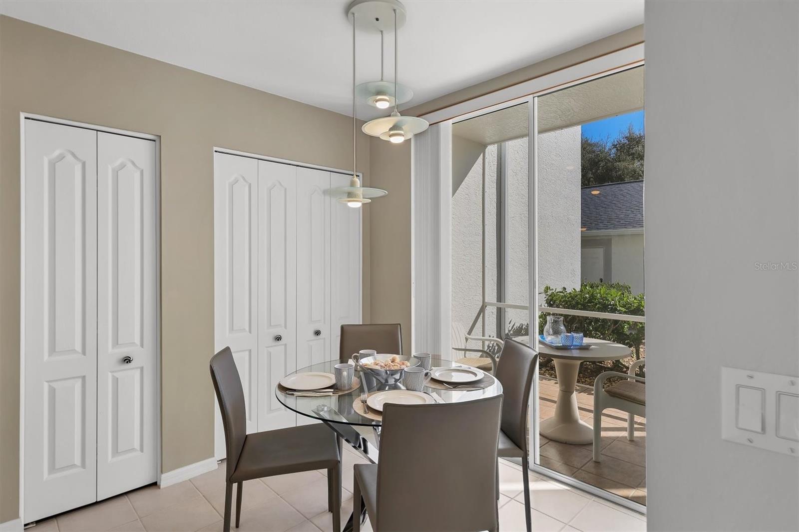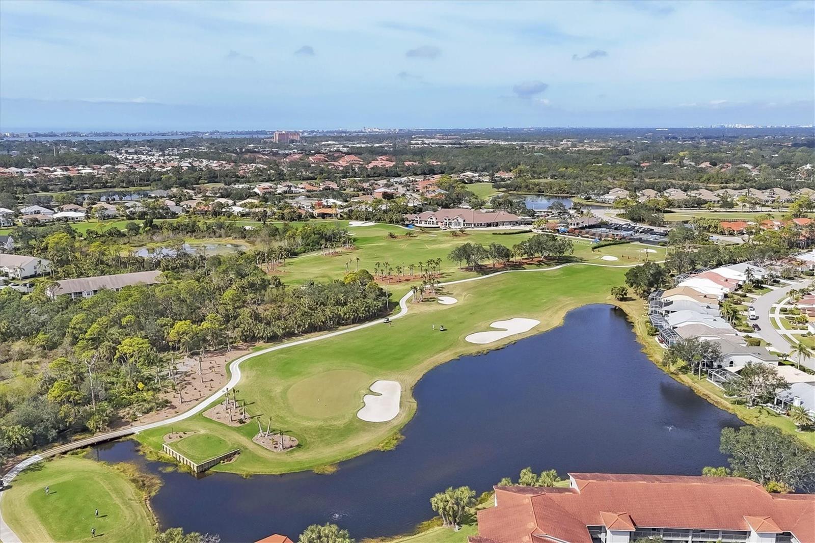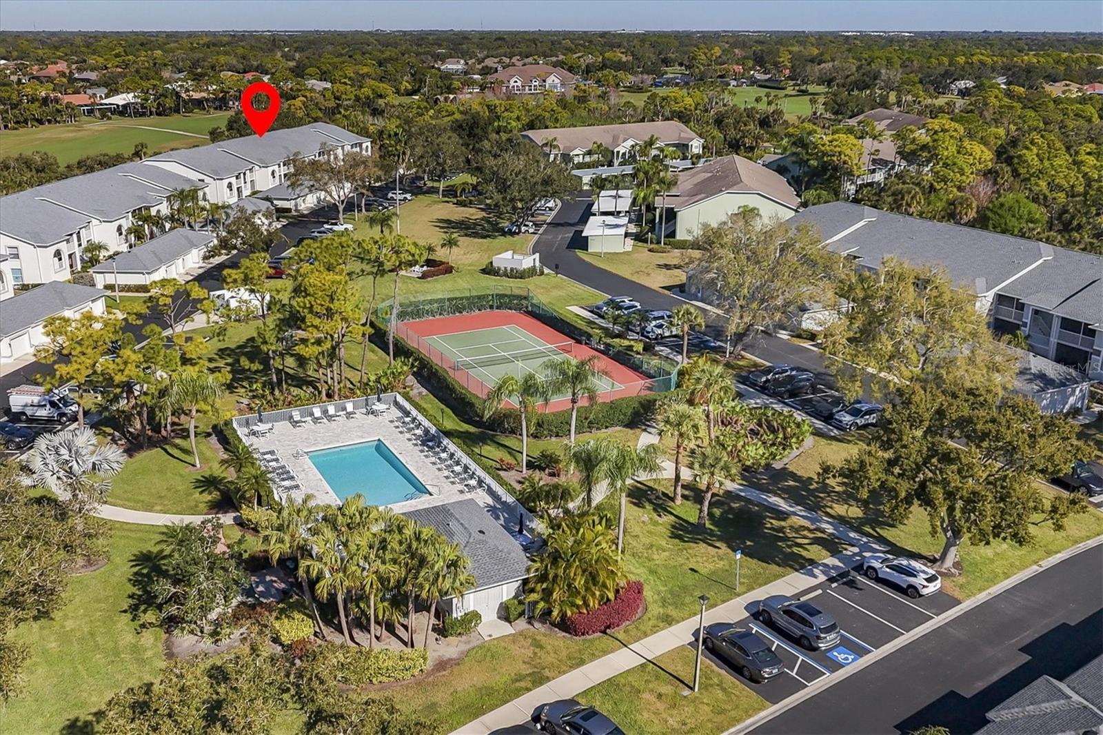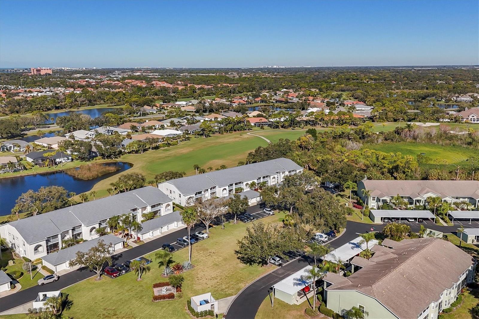 This highly sought-after first-floor condo, in Stoneybrook Golf & Country Club, offers 2 bedrooms, 2 full baths, front and rear lanais, and a detached garage. Thoughtfully updated, the residence features newer appliances, tile flooring throughout the main living areas, and a glass-enclosed rear lanai—perfect for enjoying year-round indoor-outdoor living. Enjoy serene views of the 18th fairway with a picturesque backdrop of a pond, palm trees, and mature live oaks. Located in Veranda Greens North, residents enjoy a nearby community pool and tennis court, along with full access to the exceptional Stoneybrook Golf & Country Club lifestyle. Amenities include a recently modernized 18-hole championship golf course, tennis, fitness center, pro shop, bocce ball, and a restaurant with both indoor and outdoor dining, plus a full bar. Ideally situated near the Legacy Trail and just minutes from Nokomis Beach, Siesta Key Beach, shopping, dining, and entertainment. This unit is being sold turnkey furnished, making it truly move-in ready. As an added value, the seller has paid the 2024 golf course modernization assessment in full saving the buyer over $6,000. More than a home, this is the Stoneybrook lifestyle.