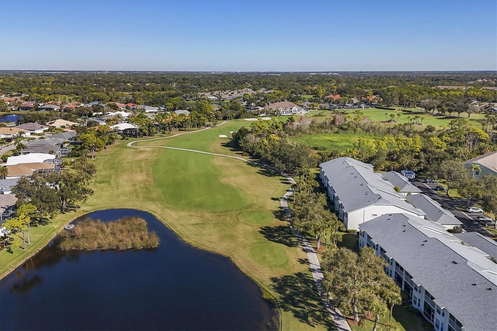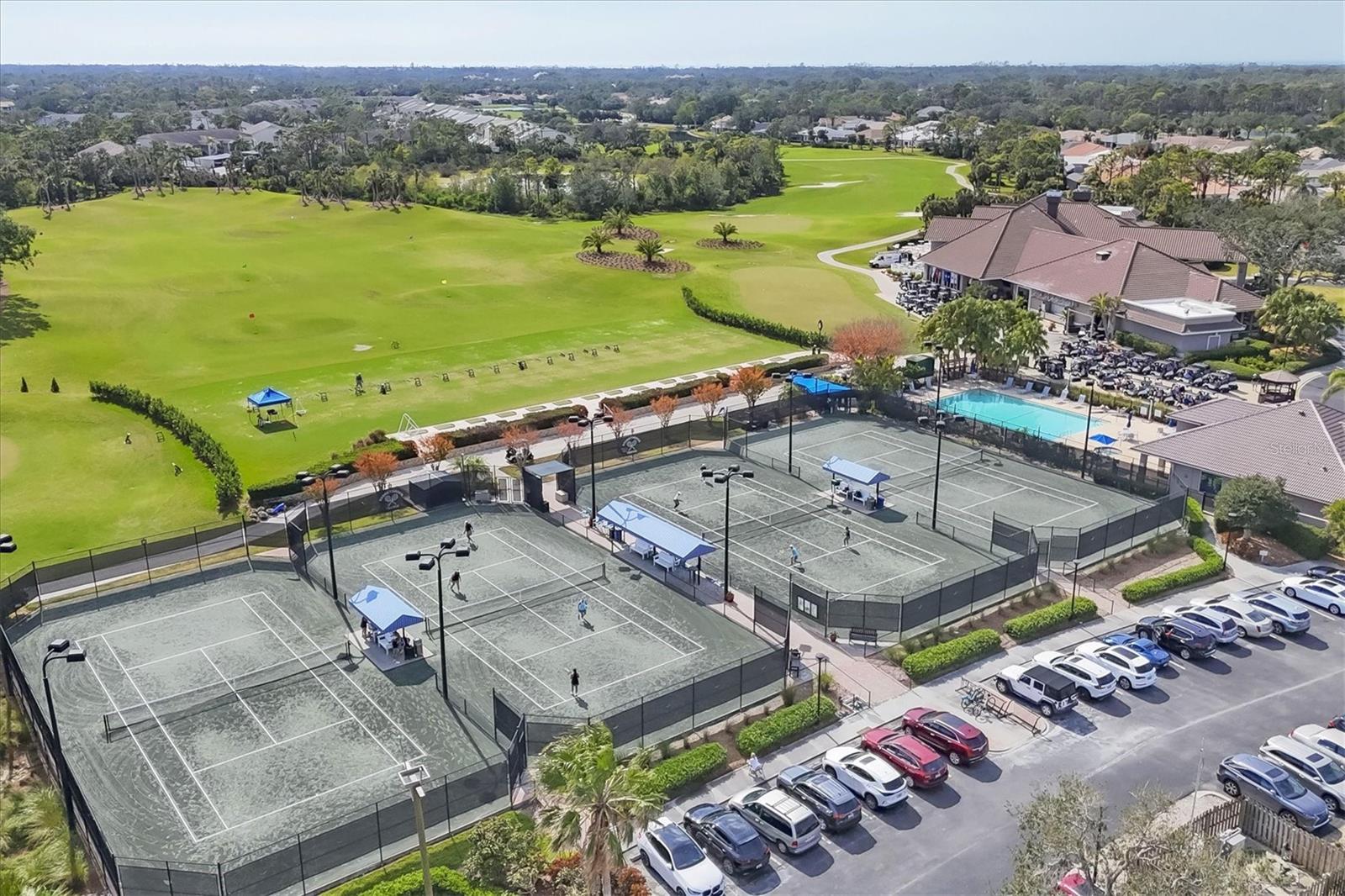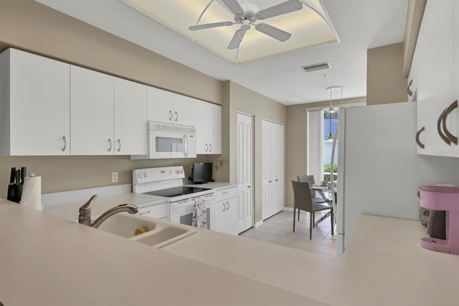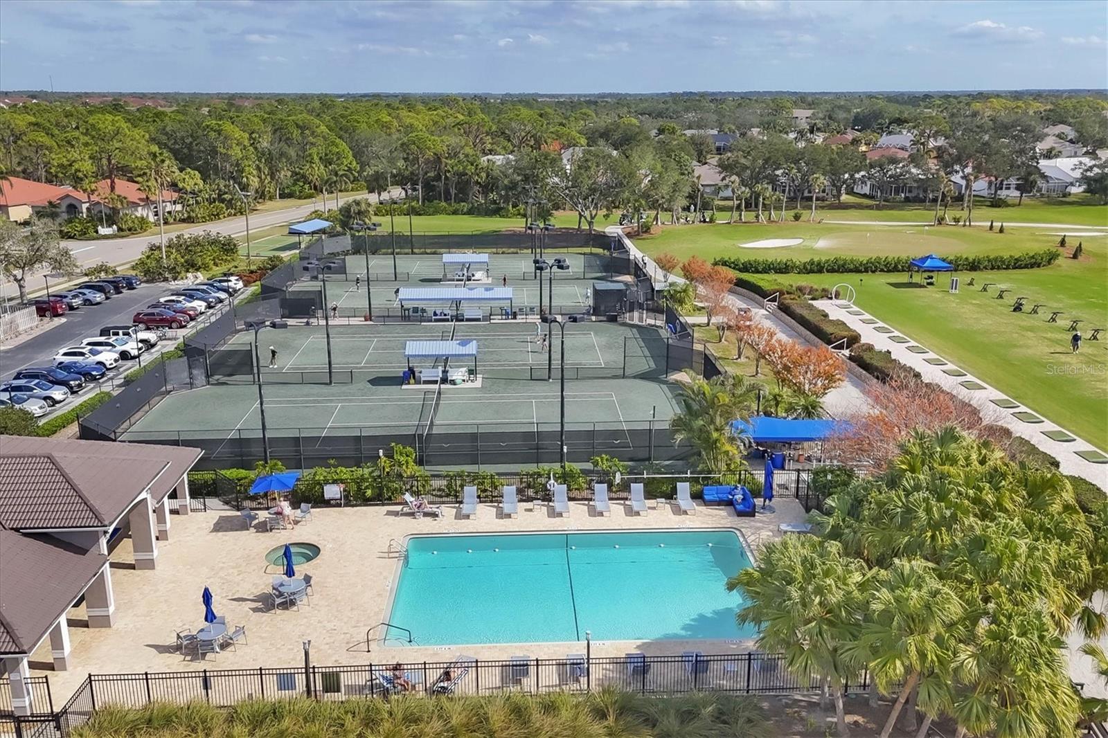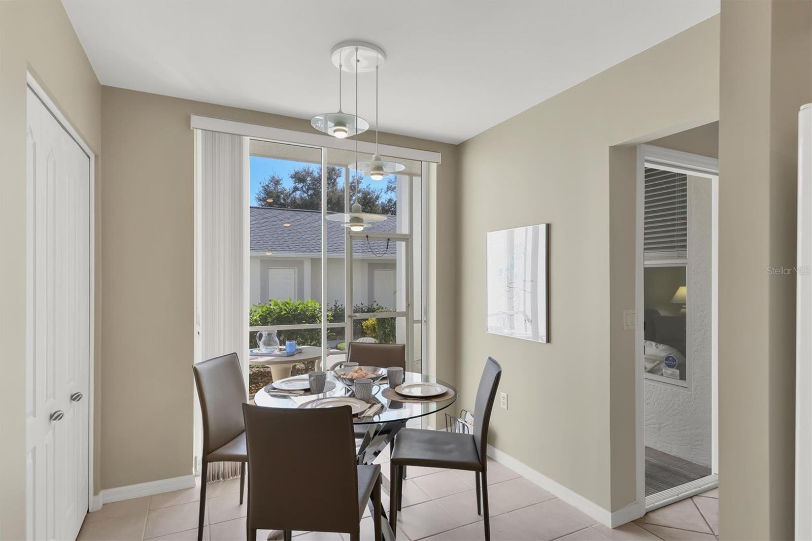 This highly sought-after first-floor condo, in Stoneybrook Golf & Country Club, offers 2 bedrooms, 2 full baths, front and rear lanais, and a detached garage. Thoughtfully updated, the residence features newer appliances, tile flooring throughout the main living areas, and a glass-enclosed rear lanai—perfect for enjoying year-round indoor-outdoor living. Enjoy serene views of the 18th fairway with a picturesque backdrop of a pond, palm trees, and mature live oaks. Located in Veranda Greens North, residents enjoy a nearby community pool and tennis court, along with full access to the exceptional Stoneybrook Golf & Country Club lifestyle. Amenities include a recently modernized 18-hole championship golf course, tennis, fitness center, pro shop, bocce ball, and a restaurant with both indoor and outdoor dining, plus a full bar. Ideally situated near the Legacy Trail and just minutes from Nokomis Beach, Siesta Key Beach, shopping, dining, and entertainment. This unit is being sold turnkey furnished, making it truly move-in ready. As an added value, the seller has paid the 2024 golf course modernization assessment in full saving the buyer over $6,000. More than a home, this is the Stoneybrook lifestyle.