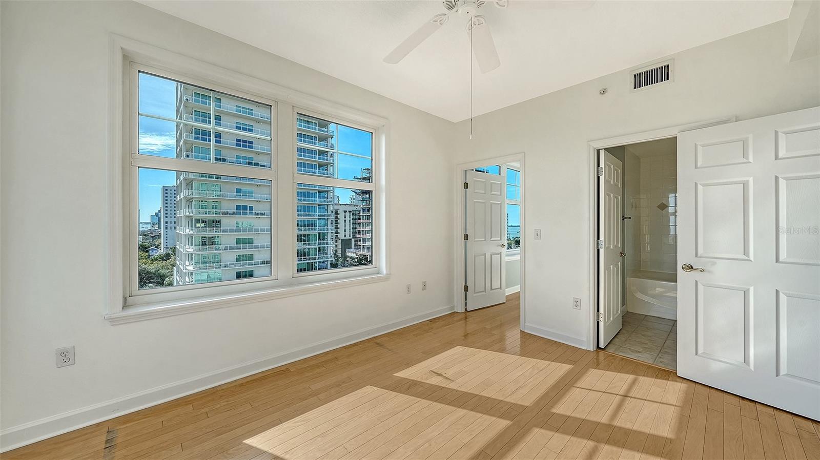 Exceptional 10th-floor corner residence in the heart of downtown Sarasota, featuring coveted southern exposure and unobstructed, sweeping city views. This sun-drenched two-bedroom, two-bath condominium offers 9-foot ceilings, expansive windows, and the privacy only a corner unit can provide. The primary suite features a large walk-in fitted closet and an en suite bath, while all closets throughout the residence are professionally fitted. Wood flooring runs throughout the living areas, with tile in the kitchen and baths. A washer/dryer closet conveniently located within the kitchen adds everyday functionality. The spacious living area opens to a private terrace with a pocket screen door—ideal for indoor-outdoor living. Pet-friendly and located in Flood Zone X (outside the flood plain), with lobby and guest parking elevated approximately 15 feet above sea level for added peace of mind. Residence includes one assigned, secure garage parking space. The Renaissance offers resort-style amenities rivaling a five-star hotel, including a fully equipped fitness center, massage room, sauna, movie theater, club room with catering kitchen, business center, conference room, lap pool, outdoor gas grill, and 24-hour security with concierge services. Located less than three miles from Gulf beaches, this is the perfect city-to-beach lifestyle opportunity. A great value in Sarasota’s iconic Renaissance building. Ready for immediate occupancy.