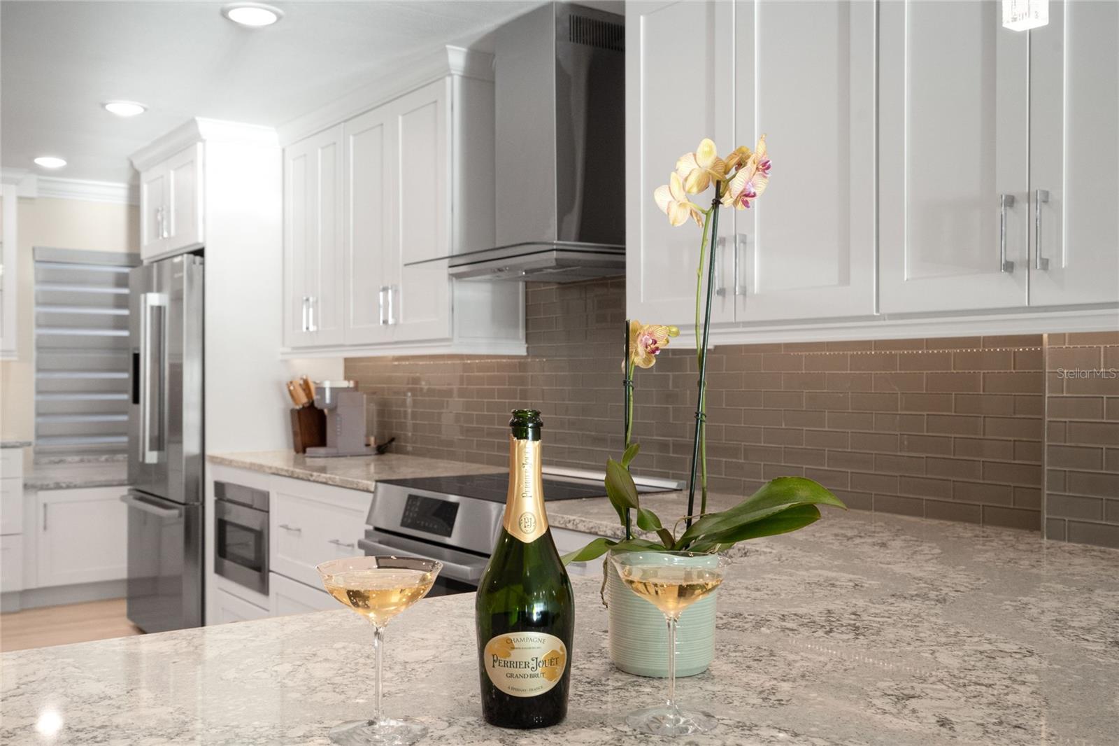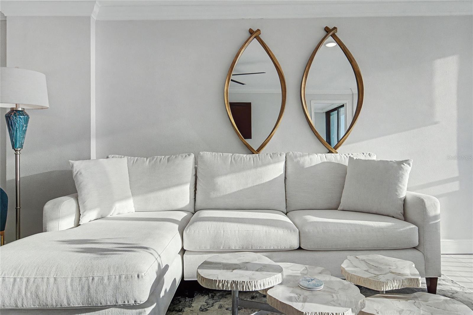 Sleek. Contemporary. Timeless elegance—with breathtaking views. Welcome to Whispering Sands, Unit #1105. This exquisite residence showcases thoughtfully curated finishes throughout, blending refined design with effortless coastal living. Crown molding, recessed lighting, and ceiling fans are just a few of the elegant details that set the tone. Offered turn-key and beautifully furnished with pieces from Bernhardt, Crate & Barrel, and more, this home is truly move-in ready. The cook’s kitchen is nothing short of divine and designed for entertaining. Stunning Cambria® quartz countertops are complemented by an impressive 8-foot waterfall breakfast bar. Abundant graceful cabinetry features soft-close doors and drawers throughout. The premium BOSCH stainless-steel appliance suite includes a refrigerator, range, dishwasher, built-in drawer microwave, and a 32-bottle wine refrigerator. Wide-plank tile flooring flows seamlessly throughout the home, creating an expansive, cohesive, and airy feel. The dining and living areas are ideal for everything from an intimate weeknight dinner and movie to larger gatherings with family and friends. Floor-to-ceiling impact glass sliders in both the living room and primary bedroom frame stunning views of the beach and the Gulf—and those unforgettable sunsets. Hunter Douglas motorized, light-filtering shades allow you to tailor the ambiance to suit your mood. The primary suite rivals a luxury hotel, offering sweeping Gulf views right from the bed. The spa-inspired bath is beautifully appointed with dual sinks, a vanity, abundant storage, a rainfall shower with built-in bench, and striking tile work—your own private sanctuary. The guest bedroom provides a welcoming retreat for visitors, conveniently located near a private guest bath. This gracious home delivers beauty, sophistication, and timeless design—just steps from a private beach, swimming pools, clubhouse, Tower Lounge, and the charm of Siesta Village.