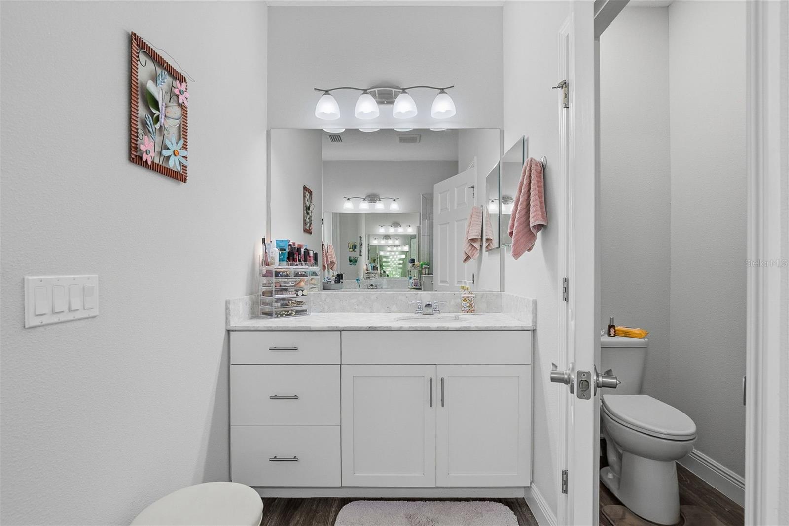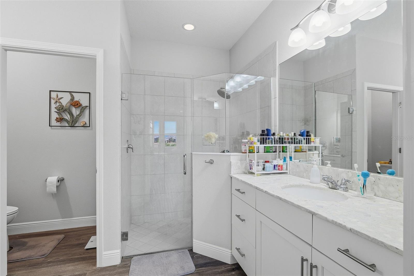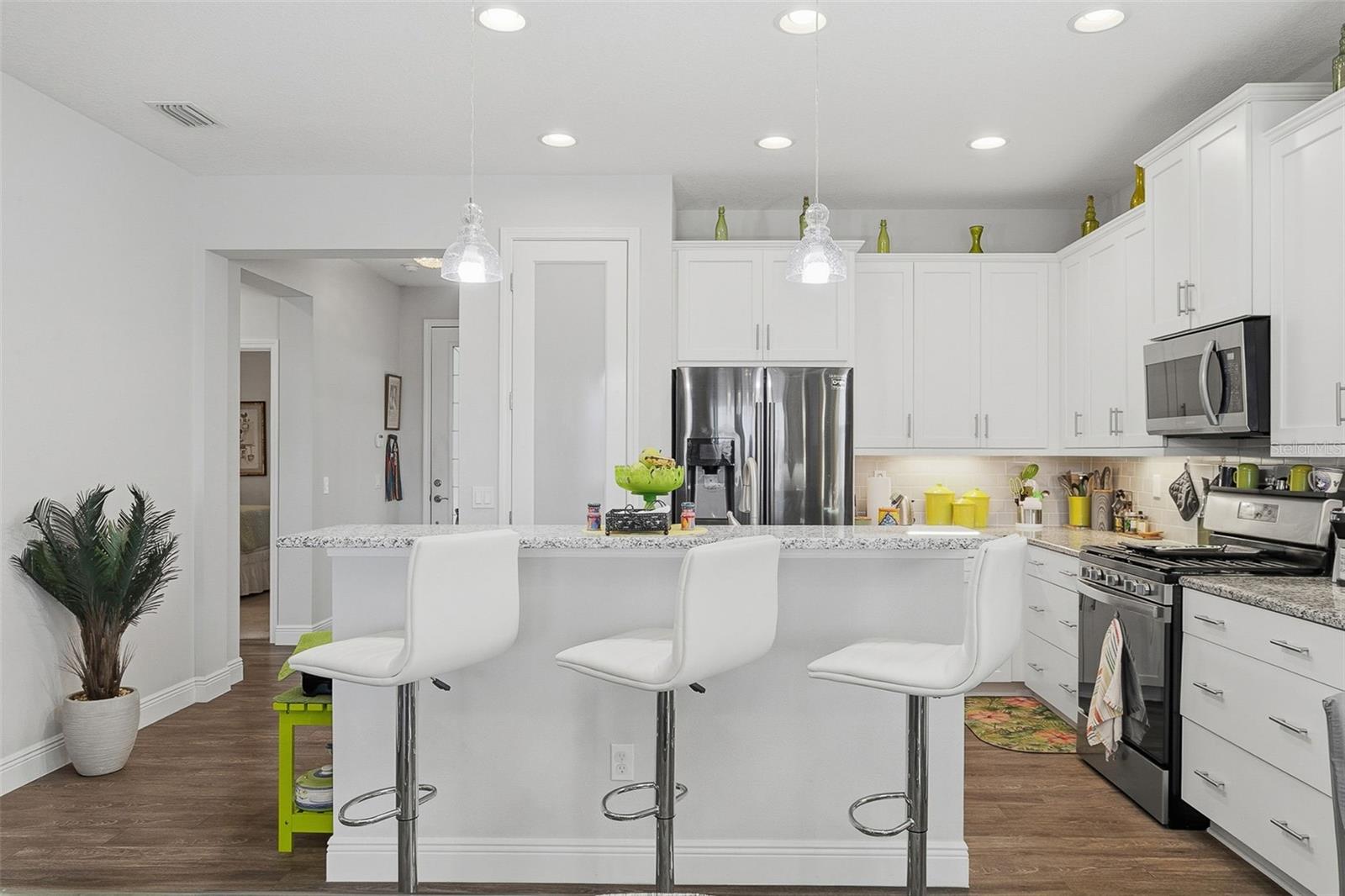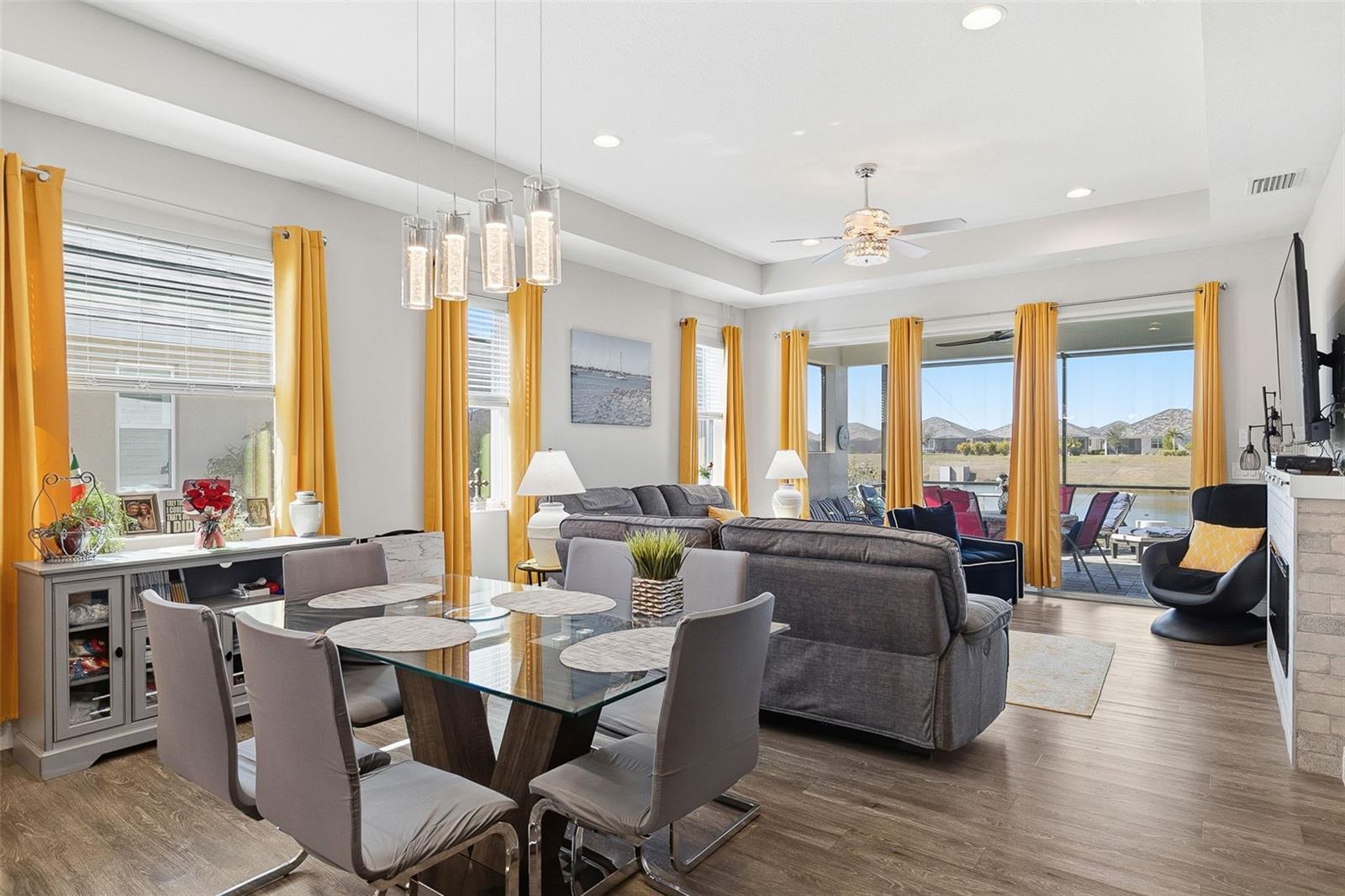 Welcome to this meticulously maintained 2019 home in the sought-after Medallion Gated Community. Offering 1,579 square feet of stylish, well-appointed living space, this charming residence features a spacious split floor plan with a private den/office that can easily serve as an additional guest sleeping area. As you approach, you’ll be greeted by a paver driveway leading to a 2-car garage, with a large screened front porch area that invites you to relax outdoors. Step inside to discover an open-concept design that seamlessly blends comfort and elegance, highlighted by recessed lighting and luxury vinyl flooring throughout the main living areas. The heart of the home is the gourmet kitchen, complete with a large island offering seating for four, granite stone countertops, sleek stainless steel appliances and pantry. The luxurious gas stove and microwave were updated in 2024, ensuring efficiency and convenience. Along with the stainless French door refrigerator, a full size freezer has been added in the garage. The adjacent dining room is accentuated by beautiful contemporary lighting, perfect for both casual meals and entertaining. The expansive living room boasts high tray ceilings, an upscale ceiling fan/light, and a stunning stone faced fireplace with glass lighting and heat—ideal for cozying up or hosting guests. Large, wall-to-wall sliders open to an extended, screened-in paver lanai, where you can enjoy tranquil water views of the pond. Whether you're entertaining or simply soaking up the sun, this outdoor space with a 2025 60’ mounted flat-screen TV is sure to impress. The private primary suite offers a peaceful retreat with picturesque pond views. It features a spacious bedroom, a walk-in closet with custom built-ins for optimal storage, and an en-suite bath with separate vanities, stone countertops, a walk-in shower, and a private WC. The home also includes a whole-home water filtration system for added comfort. Additional features include an inside utility room with front-load washer/dryer and a full-size utility sink. The dryer vent was cleaned 12/25. and the most recent upgrade to the home are the accordion storm shutters. As a resident of Medallion, you'll enjoy a host of fantastic amenities, including a sparkling community pool, hot tub, a beautiful clubhouse with an entertaining area, a gated dog park for your furry friends and paver sidewalks throughout the community. This home offers a rare combination of style, comfort, and practicality. Don’t miss your chance to make it yours!