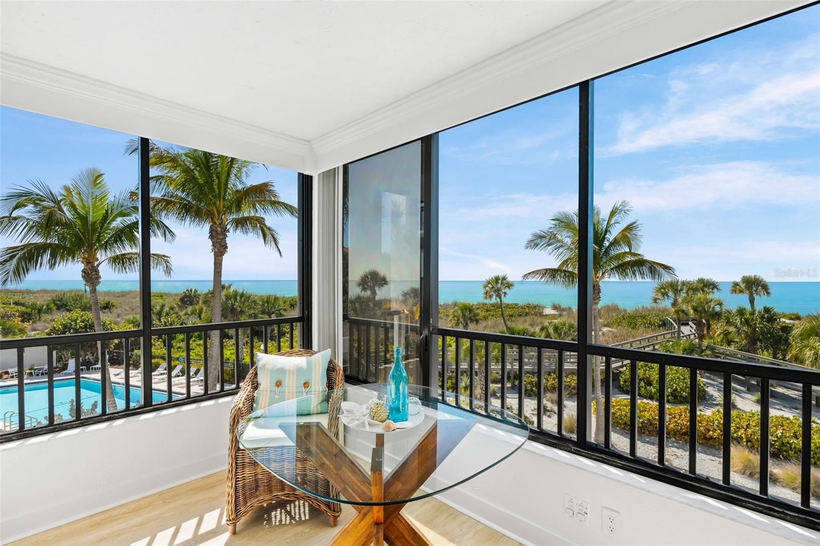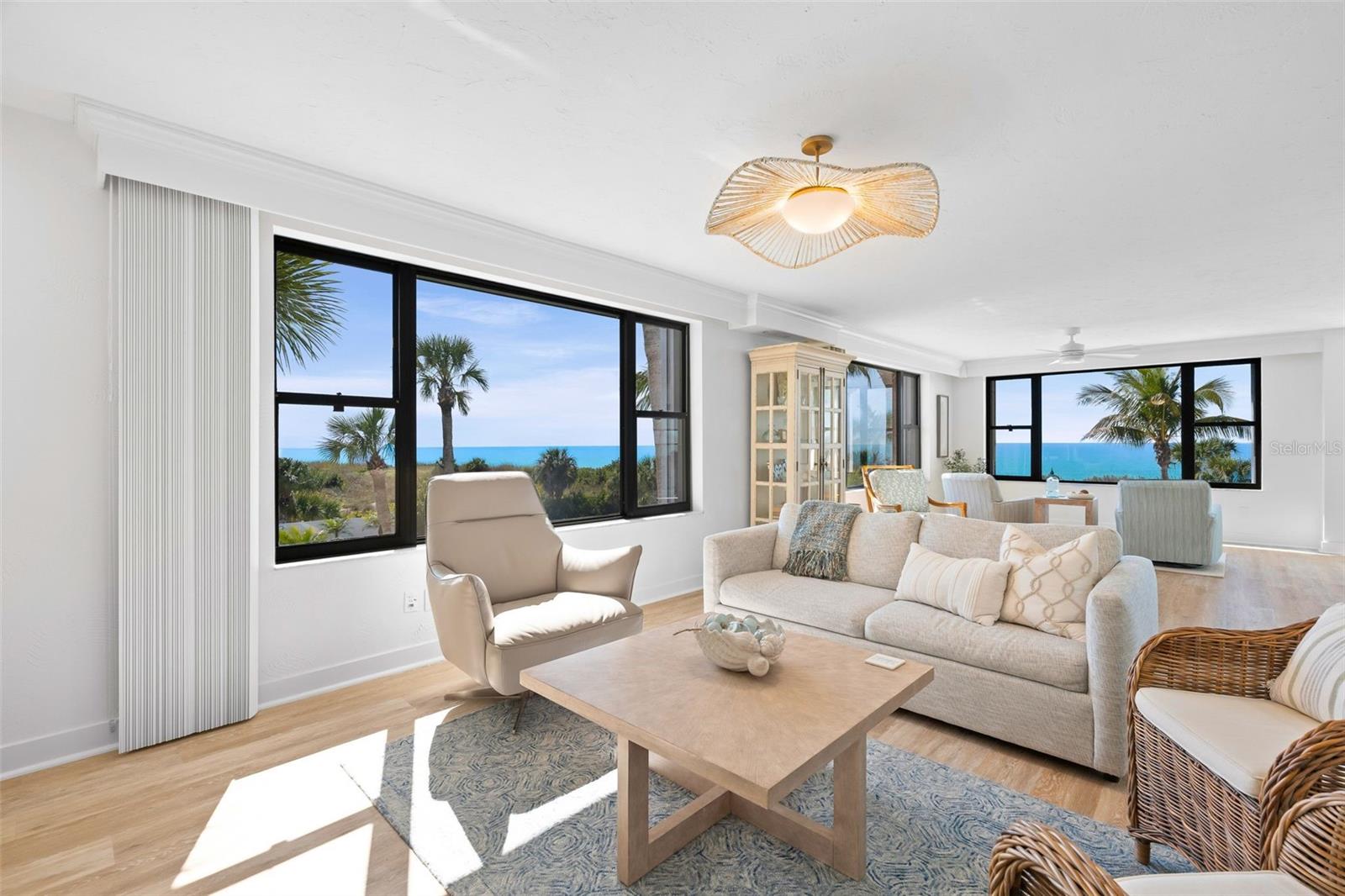 Rarely available at Hidden Lagoon Beach Club, this exceptional turnkey furnished residence offers breathtaking panoramic gulf views from nearly every angle. Wake to the sound of gentle waves, savor the serenity of a secluded beach, and unwind with unforgettable sunset skies - this is coastal living at its finest. Beautifully furnished and thoughtfully renovated, the expansive 2,730-square-foot condo features an expertly redesigned eat-in kitchen and an open-concept floor plan that maximizes both space and natural light. Custom built-in cabinetry frames a striking shiplap accent wall with an inviting electric fireplace, mantel, and TV - perfect for those relaxed evenings. The home includes two generously sized primary suites, each with updated en-suite baths and large walk-in closets equipped with custom organizer systems. Neutral luxury vinyl plank and tile flooring run throughout, creating a clean, coastal elegance. Offered turnkey furnished, excluding personal items, and complemented by an oversized private two-car garage - a rare and valuable bonus. Hidden Lagoon Beach Club is an intimate, gated community of just 24 residences, ideal for those seeking privacy away from the crowds. Amenities include a heated pool with lockers, tennis court, basketball hoop, kayak/canoe launch, tranquil lagoon views, and a charming butterfly garden, along with private gated beach access. Conveniently located just minutes from Siesta Key’s renowned dining, shopping, and marinas, this extraordinary home truly offers the best of the best. Schedule your private showing today and experience it for yourself.