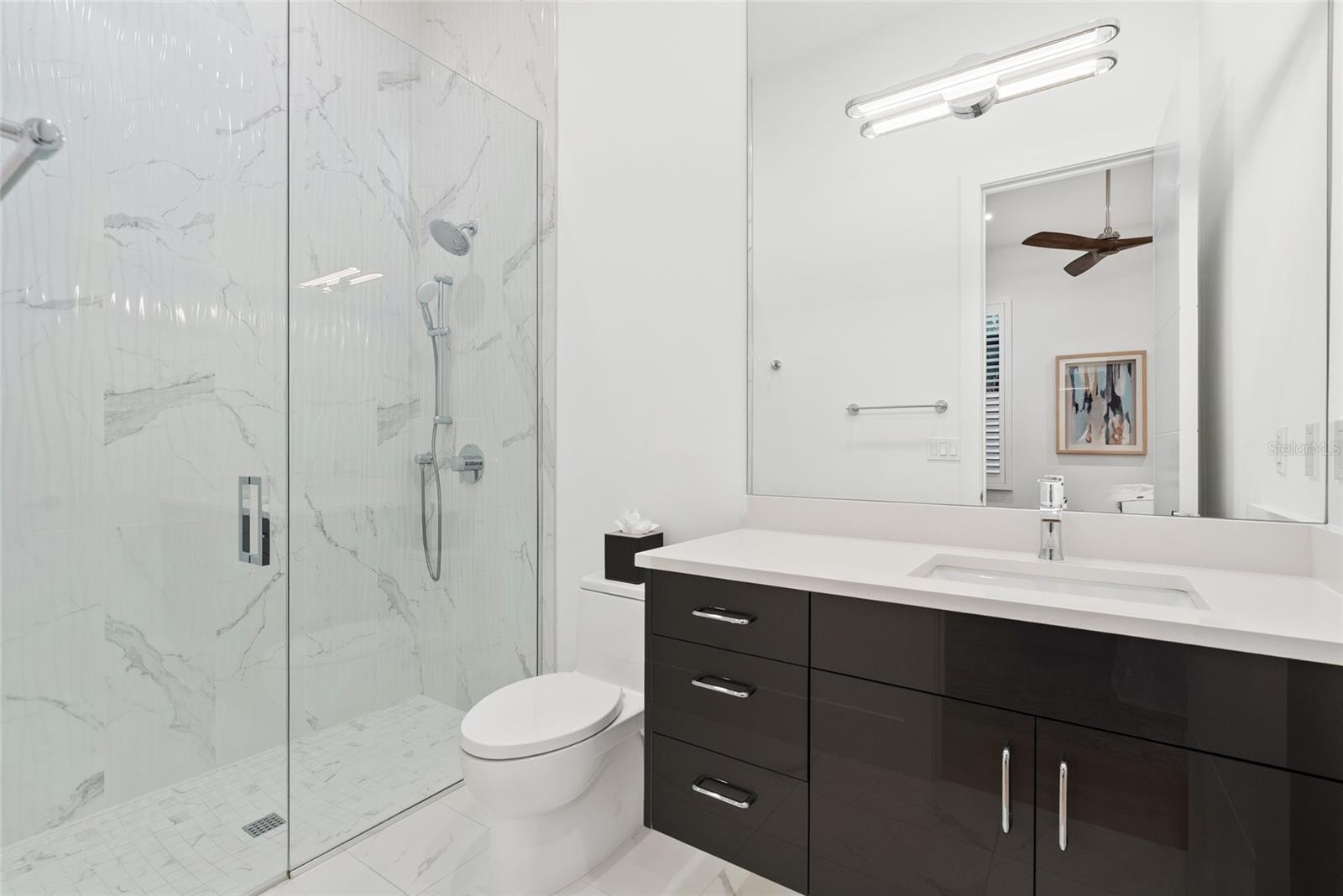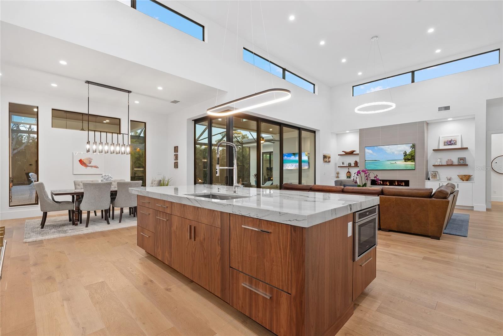 An Oyster Bay masterpiece, where legacy homes and new architectural statements coexist, this striking modern residence delivers volume, spatial continuity, and refined indoor/outdoor living just minutes from Siesta Key, dining, and boating. Built in 2023 and thoughtfully composed on a single level, the home balances bold contemporary design with privacy, warmth, and livability. A dramatic entry introduces soaring ceilings and immediate visual impact, opening into expansive living spaces designed for both daily life and entertaining. Walls of glass, disappearing corner sliders, and ceiling heights approaching seventeen feet create a sense of scale and light rarely achieved, while wide plank French oak flooring and curated designer lighting provide continuity throughout. The kitchen is a true centerpiece, anchored by an oversized island and outfitted with high-end integrated appliances, custom cabinetry, and a full walk-in pantry. It flows seamlessly into the great room and wet bar, making the home equally suited for quiet evenings or larger gatherings. Outdoor living takes center stage. The screened lanai features a fully equipped summer kitchen, generous covered seating and dining areas, and a resort-style heated saltwater pool and spa with fire bowls and cascading water features. Lush tropical landscaping, a precast concrete privacy wall, and a fully fenced yard create a sense of retreat while maintaining openness and light. The owner’s suite is a private sanctuary with direct lanai access, dual custom closets, and a spa inspired bath. Three additional en-suite bedrooms include a poolside cabana style suite ideal for guests, while a dedicated office or den offers flexibility for work or relaxation. Additional highlights include a three-car garage with epoxy flooring and storage systems, impact rated windows and doors, smart home automation, whole house generator, tankless water heaters, and refined finishes throughout. This is a modern Sarasota residence designed for those who value architecture, flow, and lifestyle in one of the city’s most established and sought after neighborhoods.