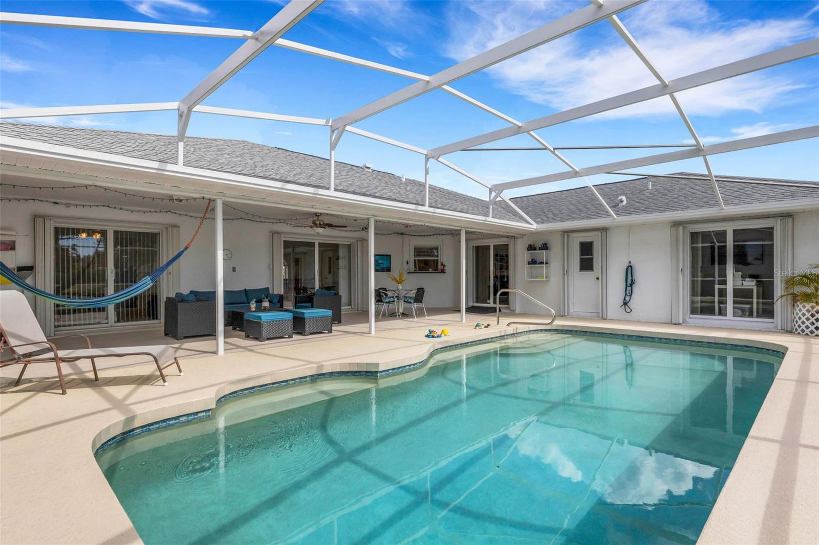LET THE SUN SHINE IN! Come explore this waterfront beauty in Cedar Creek - North Sarasota, where serene pond views and indoor-outdoor living come together beautifully. This 3-bedroom, 2-bath home offers approximately 2,100 square feet of living space on a generously sized lot perfectly positioned to capture water views from nearly every room. Double front doors open to a vaulted-ceiling living room with sliders that immediately draw your eye to the sparkling pool and wide pond view beyond. The natural light pouring in creates a warm and inviting first impression that only gets better throughout the home. Designed for both comfort and entertaining, the layout includes separate living and dining rooms plus a stunning family room featuring a stone wood-burning fireplace and a full wall of custom built-ins adjacent to the kitchen. The bright kitchen offers shaker cabinetry, dark granite countertops, a pass-through window to the lanai, a newer dark stainless GAS range giving you the convenience of propane cooking — a true chef’s dream. All three bedrooms feature walk-in closets and mounted 50+” TVs, with the 2nd bath featuring a door to access the pool area. The spacious primary suite includes a custom-designed closet maximizing every inch of space and sliding glass doors that open directly to the lanai and pool. Outdoor living shines with four sets of sliders leading to the pool area, creating seamless indoor-outdoor flow. The large lanai is under roof, offering plenty of room to add an outdoor kitchen and dining area. The screened pool enclosure was replaced in 2024, and poured sidewalks surround the home for clean, easy access all around. For peace of mind, major improvements include • Roof replacement in 2021 • New A/C and water heater in 2022 - there are so many features here, get the full list! Low HOA fees of just $200/quarter and no CDD make this home even more attractive. Location is here as this community is just 4 miles from UTC and all it has to offer - restaurants, shopping, Benderson Park, and tons more close by! Don't let this opportunity pass you by!