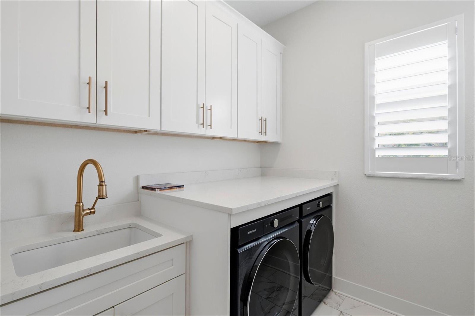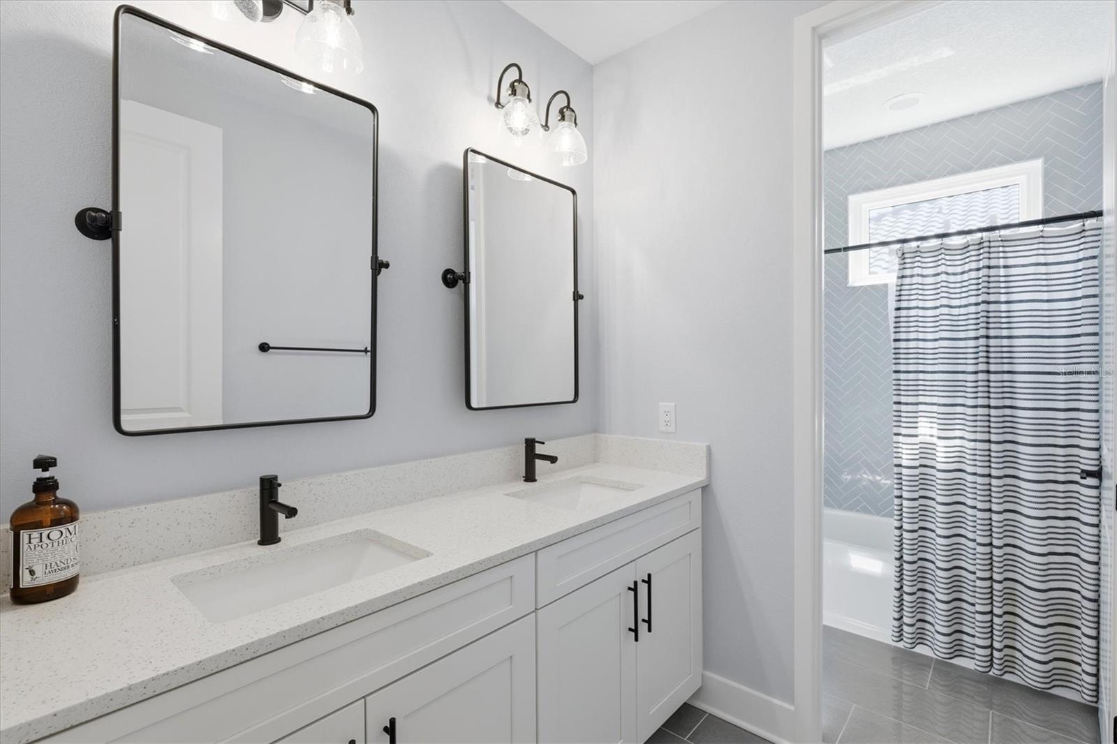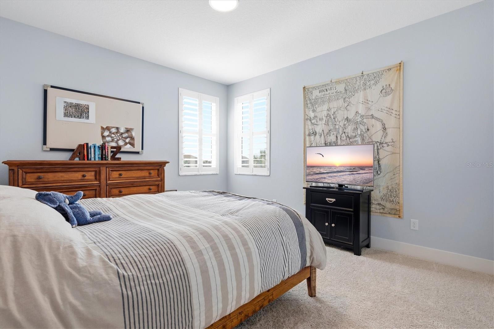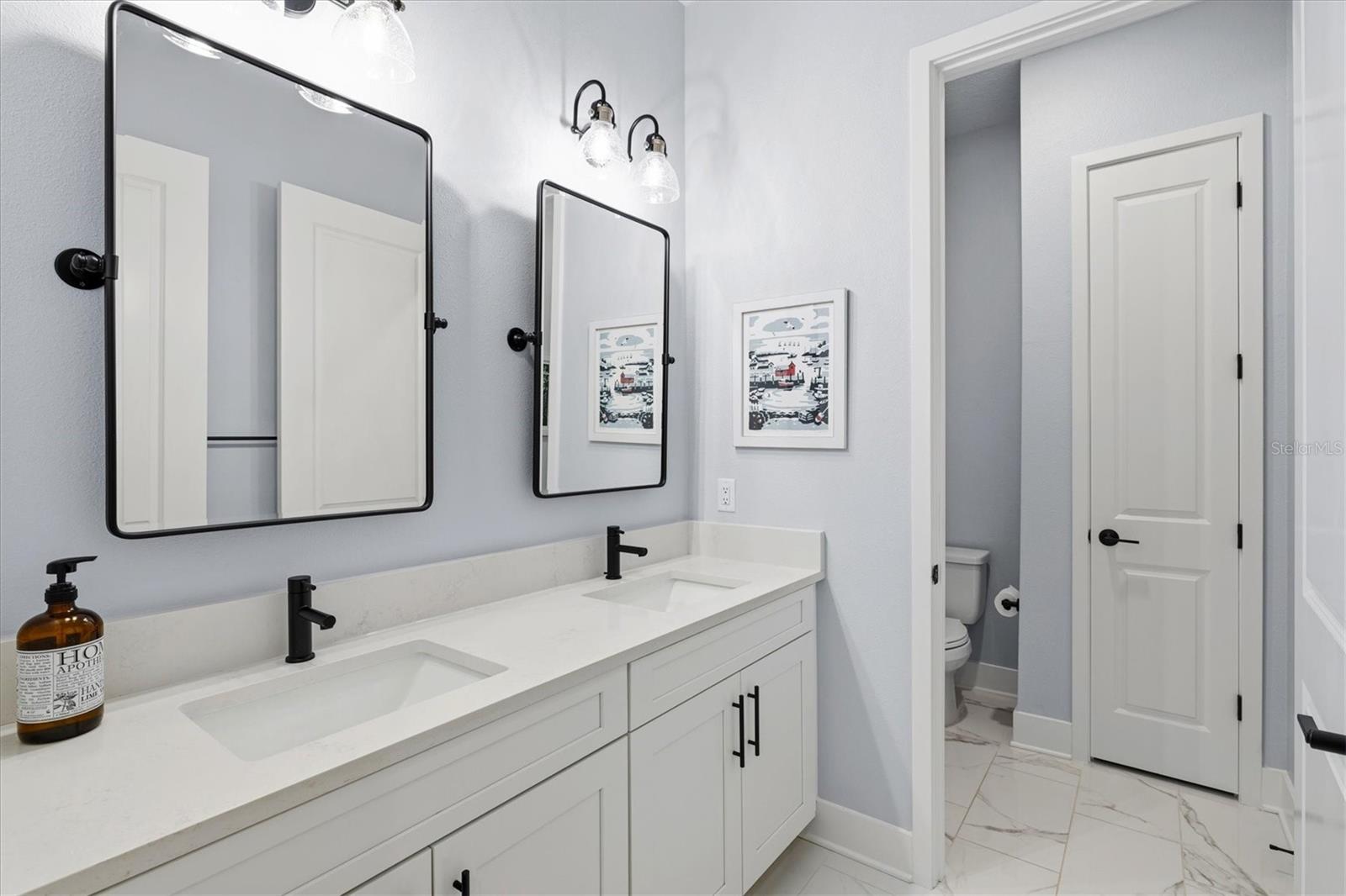 Experience elevated lakefront living in the gated community of Rivo Lakes. Built by MI Homes, this Reflection model offers five bedrooms, three and a half bathrooms, and a three car garage across a thoughtful two level layout designed for flexibility and comfort. From the moment you enter, natural light and soaring ceilings set the tone. Tray ceilings in the great room, dining area, and primary suite add architectural depth, while upgraded stone composite LVP flooring provides durability with a refined look. Custom interior paint and whole house plantation shutters give the home a finished, intentional feel throughout. The kitchen is both a statement and a workhorse. Anchored by a massive quartz island, it features GE Café appliances, natural gas cooking, a farmhouse sink, soft close cabinetry, a vent hood, and a walk in pantry. It flows seamlessly into the great room, where hard wired multi zone audio serve everyday living and entertaining. The main level primary suite is a private retreat with a spa style bath that includes a soaking tub, walk in shower, dual vanities, and a generous walk in closet. A separate bedroom wing on the first floor offers two additional bedrooms with large walk in closets and a full bath, creating ideal space for guests or multi generational living. Upstairs, a spacious bonus room, two more bedrooms, and a full bath provide flexible space for a media room, office, gym, or playroom. Outdoor living is where this home truly sets itself apart. The south facing screened lanai captures lake views and beautiful sunsets. Lush tropical landscaping creates privacy and a true retreat feel. The heated PebbleTec saltwater pool and spa are app controlled for effortless enjoyment. Hard wired outdoor speakers and a dedicated Wi Fi access point ensure seamless indoor outdoor living. Major upgrades include impact windows and doors, security cameras, a water softener and filtration system, gutters, a fully built out custom laundry room, a brand new two stage variable speed HVAC system for energy efficiency, and an epoxy finished three car garage floor. Rivo Lakes is known for its low HOA fees, no CDD fees, and peaceful gated setting near Twin Lakes Park. Siesta Key Beach is approximately fifteen minutes away, with convenient access to downtown Sarasota, UTC shopping and dining, golf courses, and top rated schools. This is lakefront living with intention, privacy, and sunset views built into everyday life.