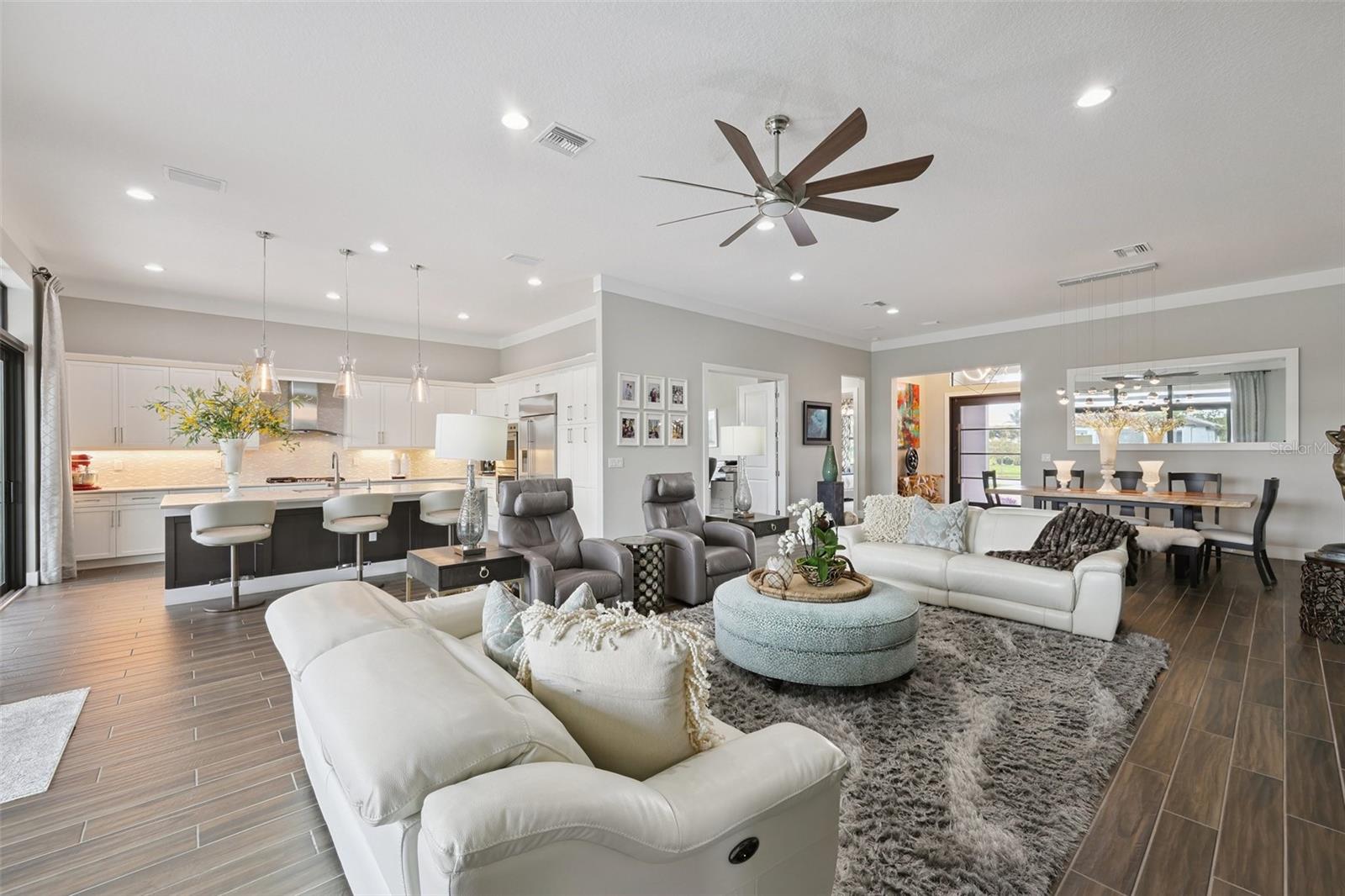 Welcome to one of the most sought-after communities in East Sarasota, where lifestyle, design, and elevated living converge in Artistry. Ideally located with seamless access to Interstate 75, Lakewood Ranch, and the Gulf Coast beaches, this residence offers both convenience and a refined residential experience. Built in 2019 and extensively enhanced beyond builder-grade standards, this home presents a rare opportunity to own a fully upgraded, move-in complete property with thoughtful design and high-end improvements throughout. The floor plan features three full bedrooms, a dedicated office, and a three-car garage, providing both flexibility and functionality. From the moment you arrive, the custom pivot iron front door with electronic privacy glass creates a striking architectural statement and sets the tone for the quality found inside. Soaring ceilings and transom windows fill the home with natural light, creating a bright, open, and expansive feel. Smooth flat-finish walls and clean architectural lines elevate the interior beyond typical construction, delivering a true custom-home aesthetic. The home opens to an exceptional outdoor living environment designed for both entertaining and everyday enjoyment. An oversized lanai with clear view screening captures long lake views and creates a seamless indoor-outdoor experience. The resort-style pool and spa, paired with a fully equipped outdoor kitchen, transform the space into a private retreat rarely found in comparable homes. Significant structural and system upgrades further distinguish this property, including hurricane impact windows, spray foam insulation for enhanced energy efficiency, a whole-house generator, and new insulated flat panel garage doors. These improvements provide not only comfort and performance, but long-term value and peace of mind. Situated on a premium lakefront homesite, this home stands apart as a fully realized residence where design, function, and lifestyle have already been completed for the next owner. Select furnishings may be purchased separately, offering a potential turnkey opportunity. This is a rare offering in Artistry that combines location, upgrades, and lifestyle into a single, move-in ready opportunity. Listing agents are the sellers of this home.