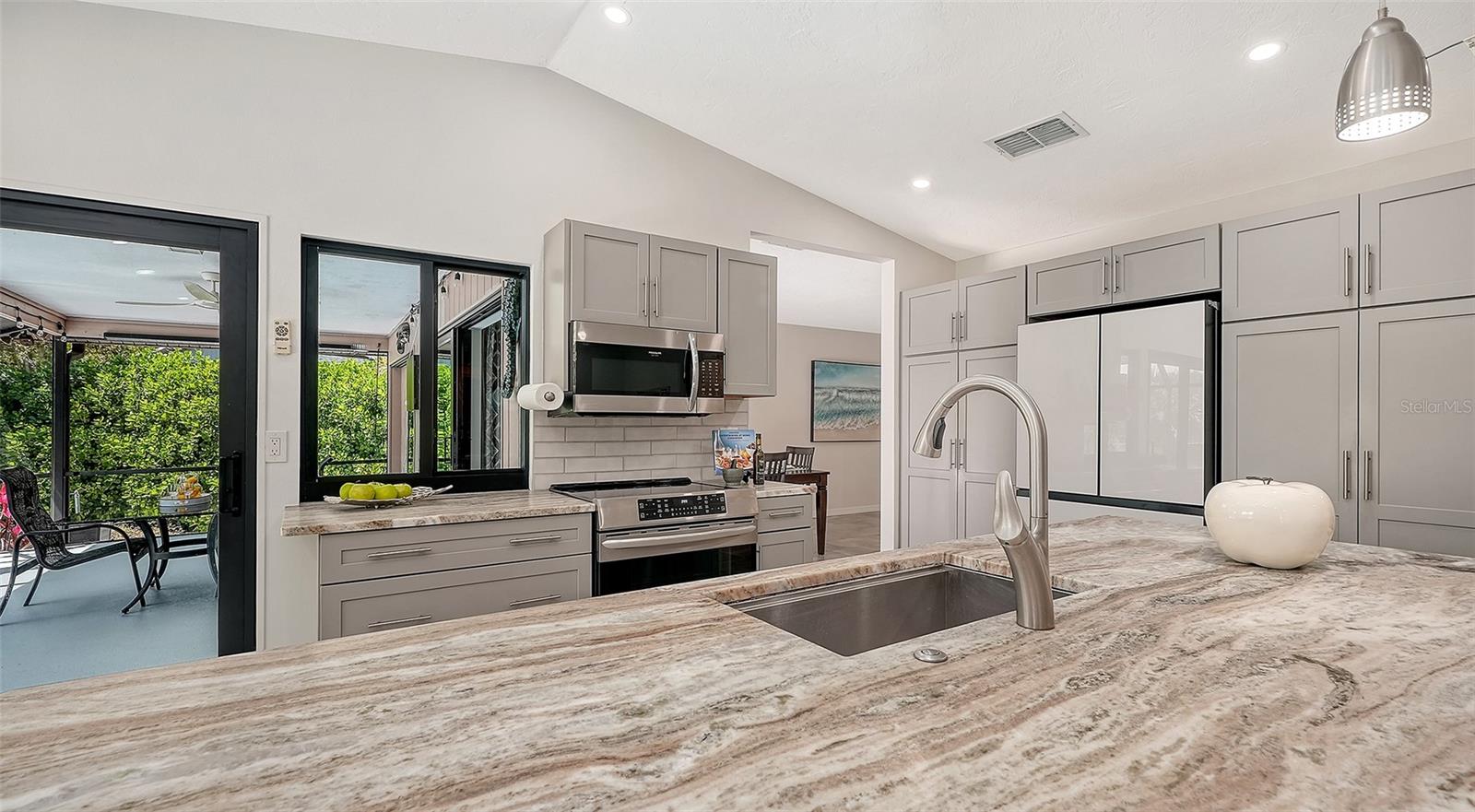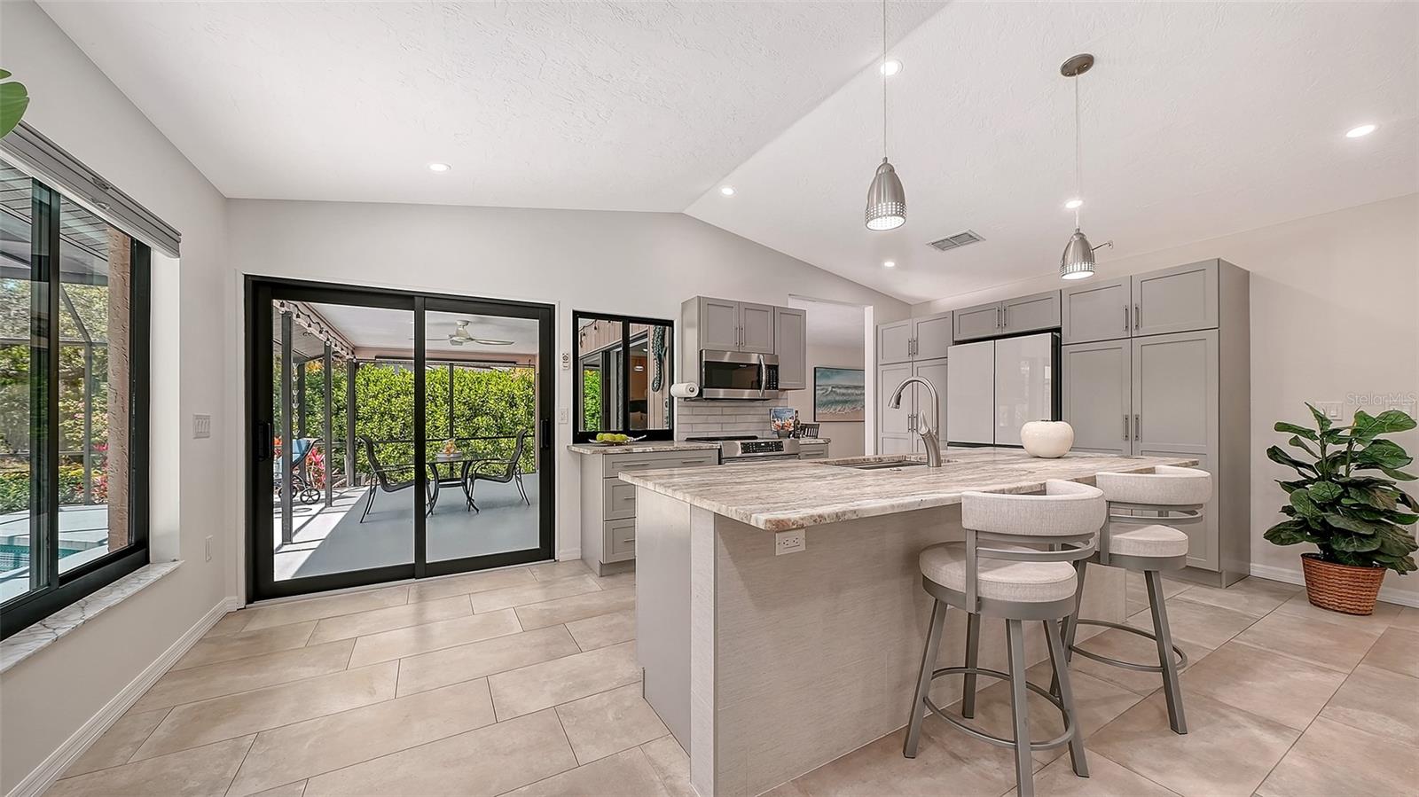 It’s always about the view and outdoor living from this stunning residence on a 139-foot-wide lake view with sparkling 16x29 heated pool set in preferred southern exposure. Luxury and tranquility in the desirable and popular Colonial Oaks neighborhood. Minutes to Siesta Key Beach, downtown Sarasota, top rated schools, parks and Legacy Trail. The home features a modern design with meticulous attention to detail, highlighted by rich landscaping, for exceptional curb appeal. The oversized garage has additional storage, an EV plug receptacle, newly finished epoxy floor coating, 200 amp electrical panel in 2024. A double-door entry welcomes you inside to a newly painted neutral palette, tile flooring and with views to the lake from nearly every room; so the interior and exterior blend delicately as one. An impressive layout includes three spacious bedrooms two full baths, all designed with an open concept in mind. The chef-inspired kitchen is a culinary dream, featuring Cambria quartz countertops, a single-level island with large breakfast bar, stainless steel appliances, induction range, pull-outs in 2 pantry cabinets. There is a pass thru window and bar to the outside lanai to enjoy al fresco dining, surrounded in a serene view with spectacular sunsets. Morning coffee or evening beverages are enhanced by the environment. Spacious laundry room with new washer and dryer in 2025. The owner’s suite is a retreat, boasting large walk-in closet & updated bath. Split plan with guest bedrooms on opposite side of residence. The home is equipped with PGT hurricane impact door, sliders and windows installed in 2023. On a practical note: new roof in 2021, hot water heater in 2025 and numerous other recent upgrades and improvements. This residence exemplifies outdoor living making it ideal for entertaining or enjoying quiet moments in a fabulous setting. Lush palms, a pergola with multicolored bougainvillea, paver walkways, an additional patio; all while enhancing the terrain. Low HOA fee's without a CDD fee.