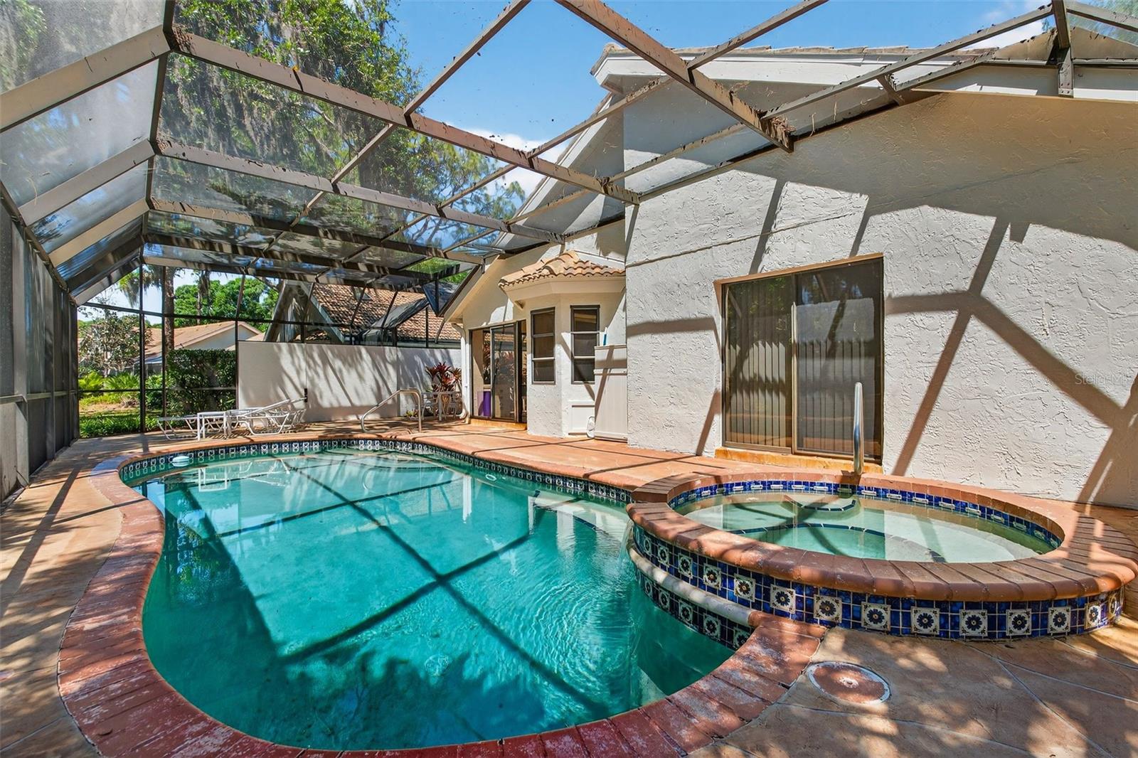 Tucked away in the quiet back section of the maintenance-free community of Tivoli Village in Longwood Run, this beautifully updated 3-bedroom, 2-bath home offers the perfect blend of comfort, style, and serene Florida living. From the moment you arrive, you’ll be captivated by the fresh, light exterior paint, lush tropical landscaping, and a stately oak tree that sets the tone for the tranquil setting. Step inside to a warm, inviting entry that opens into a bright, airy open-concept floor plan. Stunning Spanish-inspired tile flooring flows throughout most of the home, creating a cohesive and elegant feel. The recently updated kitchen is a true centerpiece, featuring sleek modern cabinetry, matching appliances, unique concrete countertops, a chic tile backsplash, and a stainless refrigerator—perfect for both everyday living and entertaining. A top of the line reverse osmosis in the kitchen, adds an extra layer of comfort and quality. The thoughtfully designed split floor plan offers privacy for guests, with two guest bedrooms and a conveniently located bathroom. One bedroom features French doors, making it ideal as a home office, den, or art studio. Most furnishings convey, making this home a fantastic turnkey option for a snowbird retreat or investment property. The spacious primary suite is a true sanctuary, complete with laminate flooring, a large walk-in closet, and sliding glass doors that lead directly to the pool patio. The en suite bathroom offers dual sinks, solid surface countertops, and a large soaking tub perfectly positioned to take in peaceful lake views. Indoor-outdoor living is seamless, with multiple sliding doors from the main living area opening to the expansive screened pool patio. This inviting space is ideal for relaxing, entertaining, or working from home in a tranquil setting. Enjoy the sparkling pool, shaded awnings for cool comfort, and picturesque surroundings that make alfresco dining a daily pleasure. The highlight of this exceptional property is the breathtaking lake view framed by majestic oak trees—creating a private, peaceful backdrop that truly sets this home apart. Ideally located near UTC shopping and dining, with easy access to Lakewood Ranch, world-renowned Gulf beaches, and Sarasota-Bradenton International Airport, this home offers both convenience and a coveted Florida lifestyle. Don’t miss the opportunity to own this move-in ready gem in one of the area’s most desirable communities.