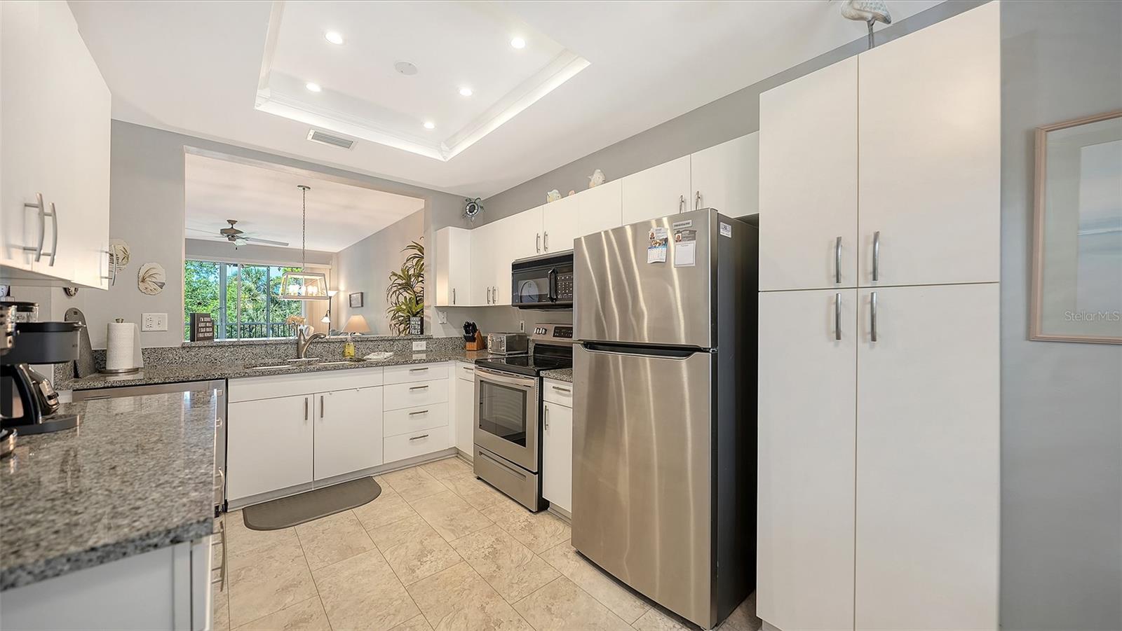 Live the country club lifestyle in this tastefully updated condo at CLUB SOUTH CIR., a popular community within STONEYBROOK GOLF & COUNTRY CLUB. LUXURY VINYL FLOORING flows throughout the main living area with plush carpeting in both bedrooms. An UPDATED KITCHEN featuring newer cabinets, stainless steel appliances, STONE countertops, and a charming cafe table for two in front of the large kitchen window completes the picture. The primary bedroom comfortably accommodates a king bed and features an UPDATED BATHROOM with a higher vanity, a granite countertop, and a tiled walk-in shower. The dining area is open to the living room and is tastefully decorated and the home is being sold TURN-KEY FURNISHED. The GLASS-ENCLOSED lanai with sliders allows year-round enjoyment and relaxation while offering a spectacular view of the golf course on one side and the lake on the other. For added security for years to came A NEW AIR CONDITIONER was installed in March of 2026. This exceptional condo has a washer and dryer, is located in an elevator building, has one covered parking space, and a storage shed. Club South amenities include a heated pool, a screened eating area, a grilling area, plus tennis and pickleball courts. Stoneybrook is an amenity-rich community, including a newly modernized 18-hole golf course, lighted Har-'tru tennis courts, a pro shop, fitness center, bocce ball court, a driving range, and much more. The clubhouse features fine and casual dining, a full bar, outdoor dining patio, a large heated pool and spa, all the social activities you would expect from a country club, like yoga, mahjong, trivia, water aerobics, and much more. The gated community is centrally located on Palmer Ranch, close to shopping, the YMCA, Costco, and borders the access to the Legacy walking and biking trail, and is less than 15 minutes from the sugar sandy beaches of Siesta Key. This home offers so much more than a condo to live in, but a lifestyle to enjoy.