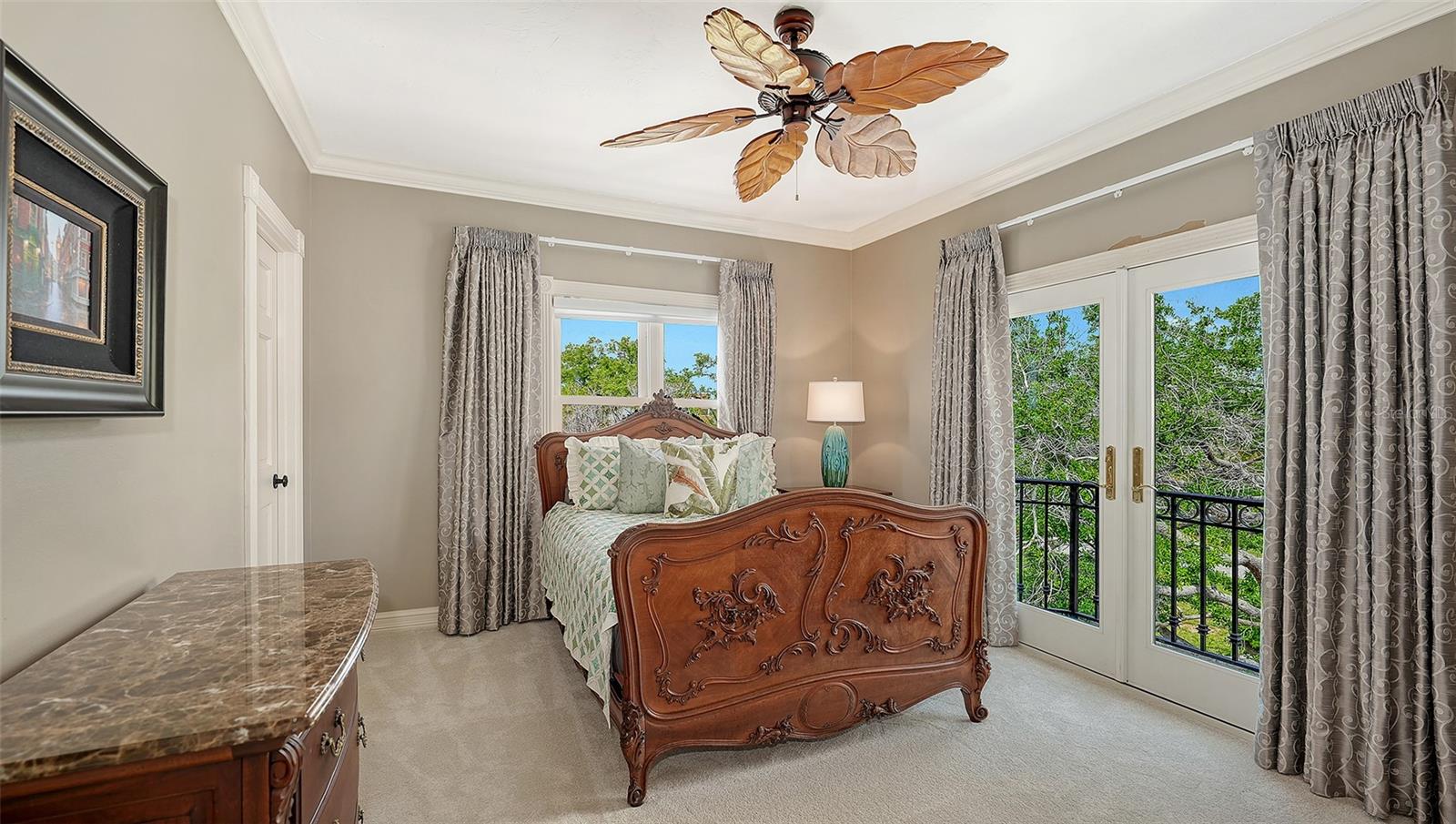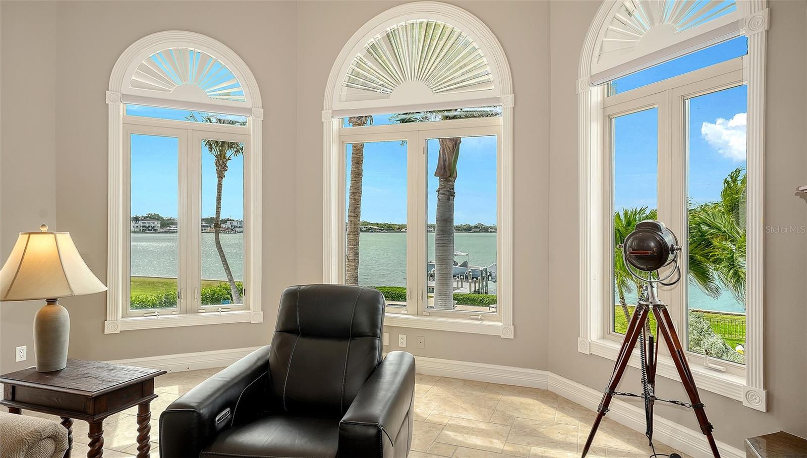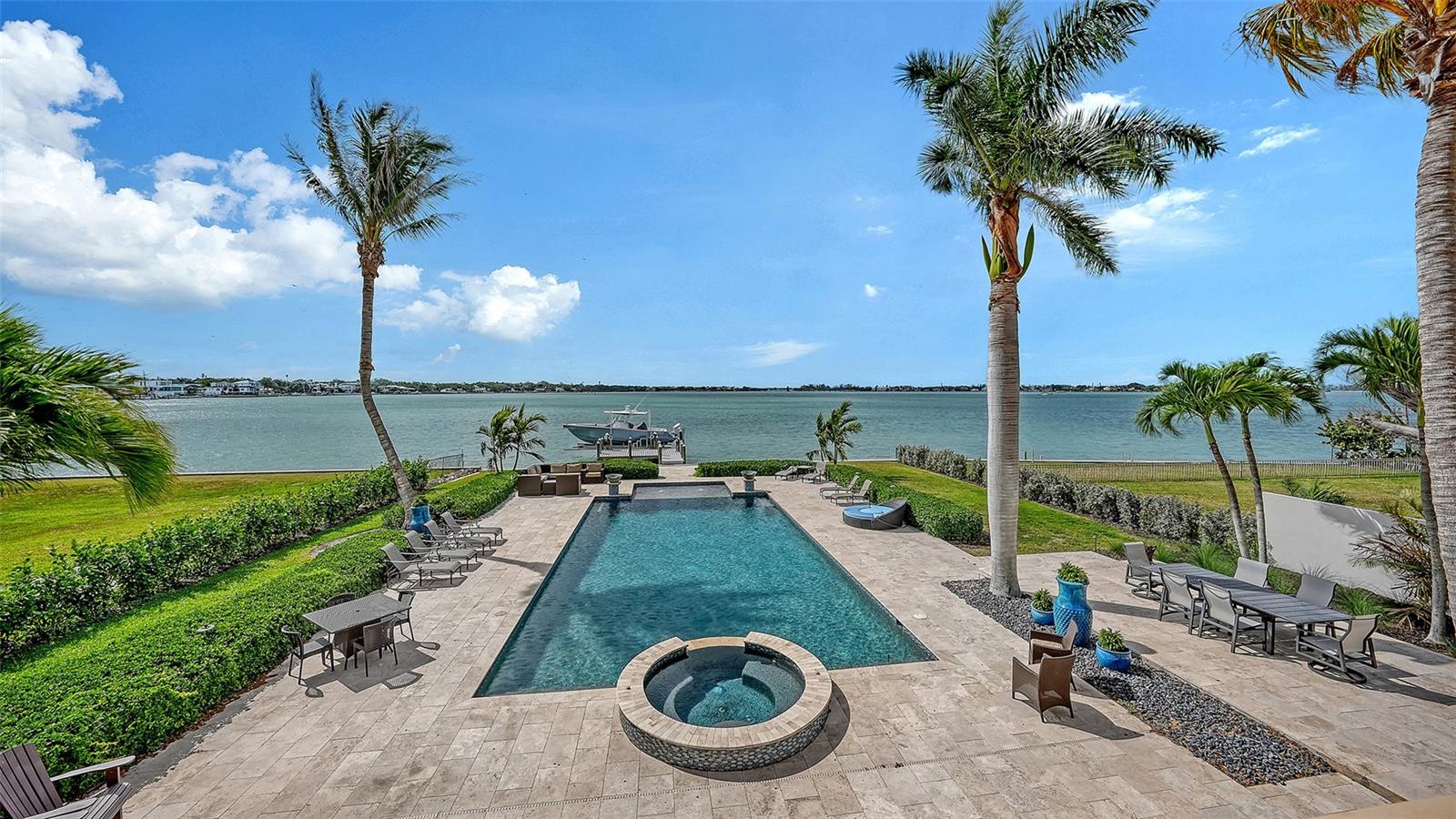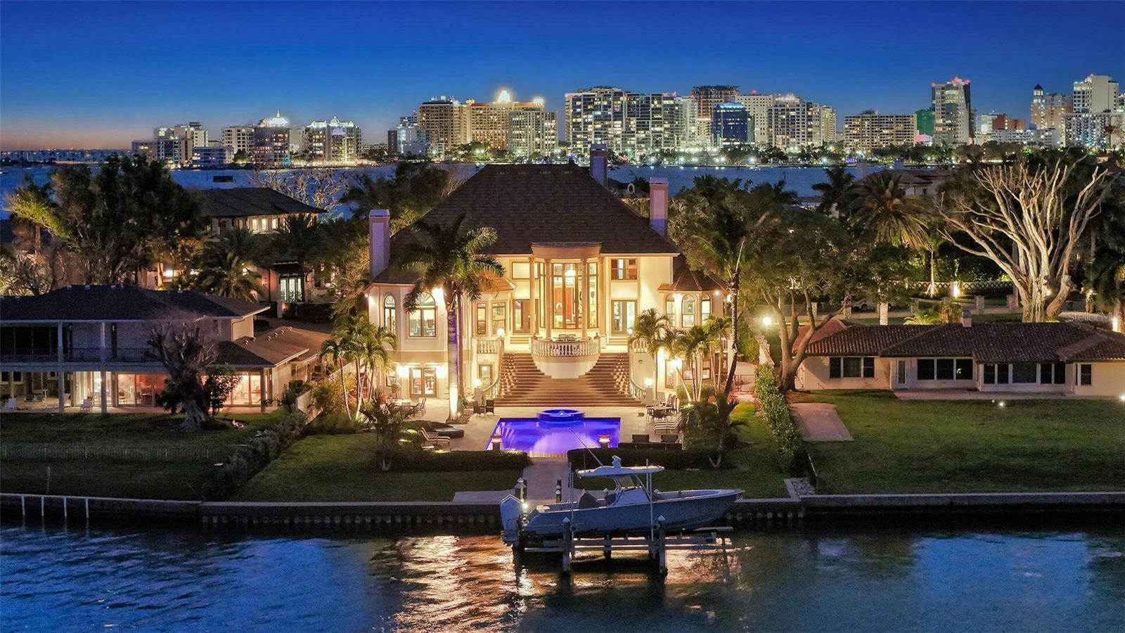 Introducing “Gatsby Manor,” set along Hillview Drive, one of Sarasota’s most coveted bayfront addresses, often compared to Port Royal for its exclusivity and waterfront lifestyle, this rare Harbor Acres estate property spans nearly three-quarters of an acre on deep, boatable water with sweeping, unobstructed Sarasota Bay views stretching south toward Siesta Key and the Gulf of Mexico, representing one of the neighborhood’s most distinguished open-bay offerings where only a select few residences achieve true estate scale. Encompassing more than 8,000 square feet of air-conditioned space with four bedrooms and three-and-a-half baths. The residence is complemented by a grand motor court accommodating 15+ vehicles beneath a canopy of majestic grand oaks. Privately approached through wrought-iron gates and a sweeping circular drive anchored by a multi-tiered fountain, the home opens to a dramatic two-story foyer framing the water beyond. Interiors are defined by soaring ceilings up to 22 ft. in height, exceptional millwork, multiple fireplaces, a striking two-story wood-paneled library, formal dining with 12-foot ceilings, and a wetbar—perfectly blending elegant entertaining with comfortable daily living. The chef’s kitchen is designed to support both everyday living and large-scale gatherings, featuring double 36-inch Sub-Zero refrigerators with dual freezer drawers, two dishwashers, and a 60-inch Wolf gas range with six burners and infrared dual griddle. The owner’s suite occupies the entire east wing of the main living level, creating a private waterfront retreat complete with a gas fireplace, sitting area overlooking the pool and bay, dual walk-in closets, and a spa-inspired bath highlighted by a sculptural copper soaking tub, dual vanities, and a dedicated luxury makeup area. Upstairs, a second primary-style suite and two additional guest bedrooms are accessed via the grand staircase or three-stop elevator, offering privacy and flexibility for family and guests. The 3,800+ square-foot ground-level bonus area serves as the home’s ultimate entertaining environment, featuring a remarkable speakeasy lounge and an impressive 700+ bottle wine room. This expansive space functions as a true extension of the residence’s living experience—ideal for hosting gatherings, intimate evenings, or celebrations on a grand scale. Outdoor living is equally exceptional, centered around an expansive marble terrace surrounding the 25’ × 60’ heated saltwater pool with integrated sun shelf and spa. A brand new deep-water dock with a 20,000 lb. boat lift and seawall replaced in 2017 further enhance the property’s boating capabilities and long-term value. Additional highlights include hurricane-rated garage doors, elevator access to all three levels, a drive-through three-car garage, and extensive storage throughout. Perfectly positioned just a short stroll to Southside Village’s restaurants and boutiques, minutes from downtown Sarasota’s celebrated arts and cultural district, and only four blocks from Sarasota Memorial Hospital. Gatsby Manor offers a truly rare opportunity to enjoy estate-scale open-bay living with deep water, privacy, and exceptional walkability in one of Sarasota’s most prestigious waterfront neighborhoods.