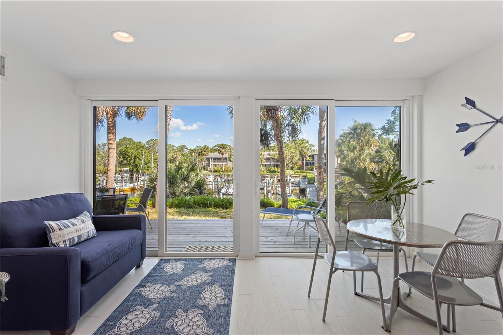You will fall in love the moment you enter this rarely available FIRST FLOOR WATERFRONT condominium located in award-winning community Pelican Cove in beautiful Sarasota, Florida! Lovely fully renovated 2 bedroom, 2 bathroom, with a study/office just off the master bedroom with breathtaking water views of the harbor basin. You will enjoy entertaining in this open floor plan that is light and bright. The stunning kitchen boasts shaker cabinetry with lots of drawers and pull outs, attractive Corian countertops, stainless appliances, built in wine rack, and three refrigerators. Master bedroom en suite features two custom closets, one which is a large walk-in, and tastefully renovated bathroom with exquisite finishes includes an enclosed shower. This impressive condo has plantation shutters, sliding impact resistant glass doors, large wood deck overlooking the harbor, tile and laminate floors throughout, brand new water heater, and is offered furnished. Pelican Cove has a 24-hour gated and staffed entrance, renowned for it's resort-like amenities including an 87-slip boat harbor with over 130 kayak/canoe storage rack & launch docks, fishing docks, 6 heated swimming pools, hot tub, fitness center, four lighted tennis and pickleball courts (8 pickleball courts in all), basketball, 5.5 miles of nature trails and boardwalks, and dog walk areas. The community offers loads of social activities including several yearly jazz and cultural concerts plus a few harborside concerts, clubs and classes featuring an art studio, pottery, huge wood working studio, sculpting, and classes at Pelican Cove University. There are 37 plus clubs including culinary arts, active yacht club, Tai Chi, yoga, water exercise, biking, photography, fiber art, tennis, and card playing clubs. Conveniently located to Siesta Key Beach, downtown Sarasota, restaurants, shopping, cultural attractions, hospitals, airports, and so much more.