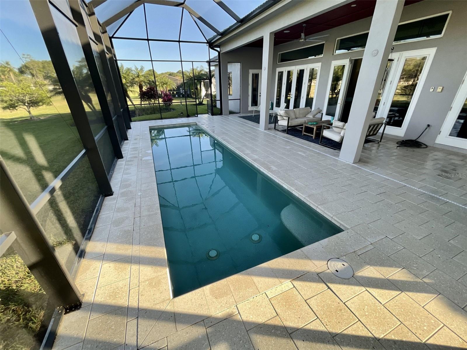 Chlorine Free, Deck, Fiber Optic Lighting, Gunite, Heated, In Ground, Lap, Lighting, Salt Water, Screen Enclosure