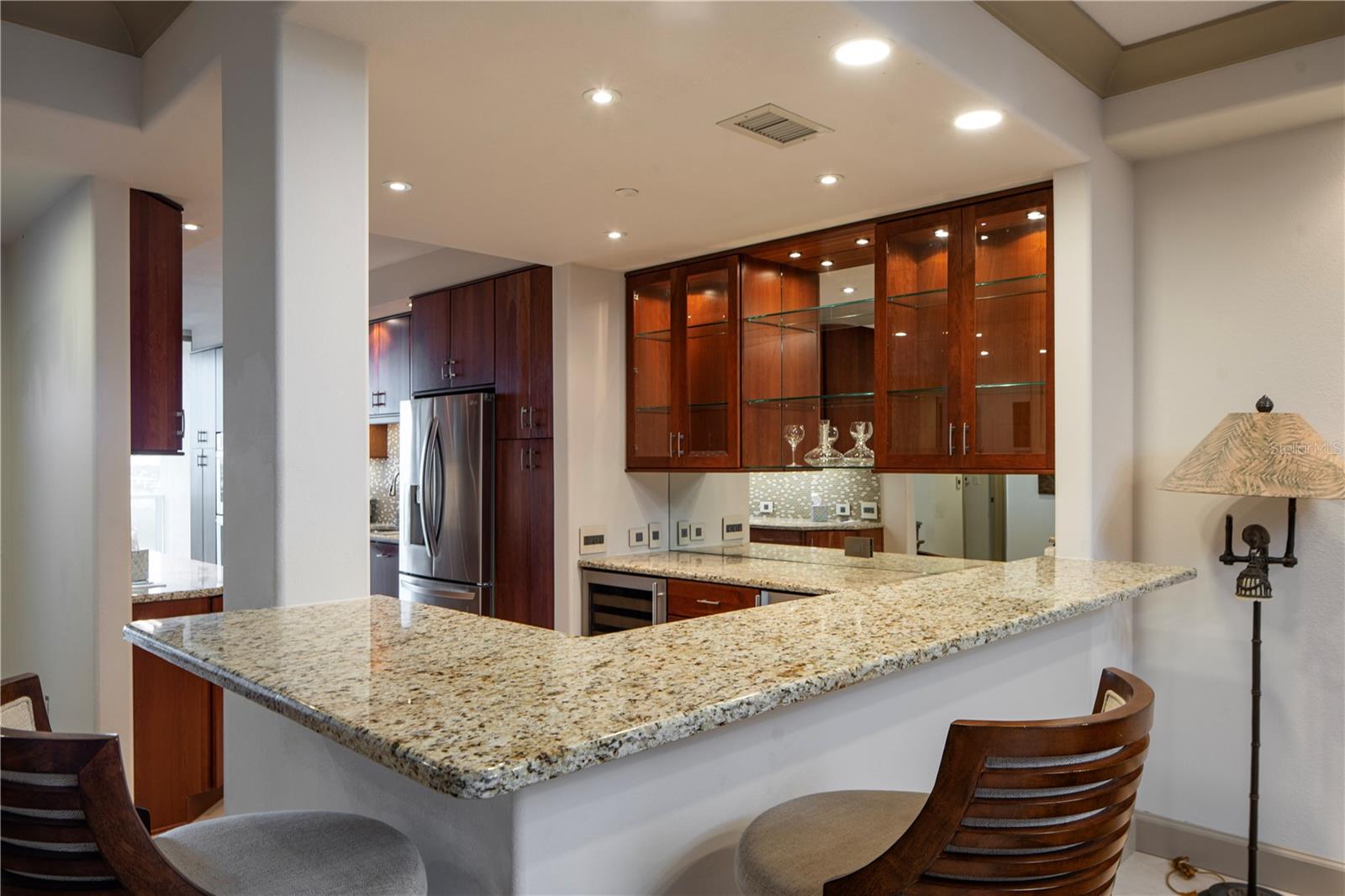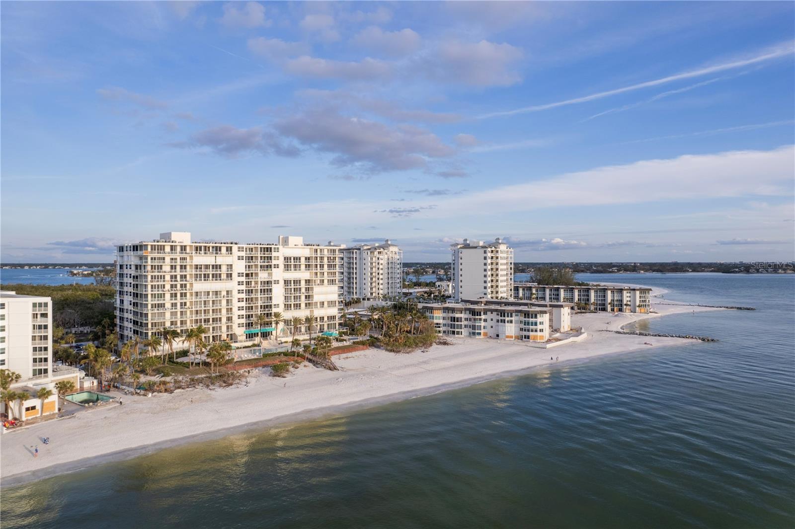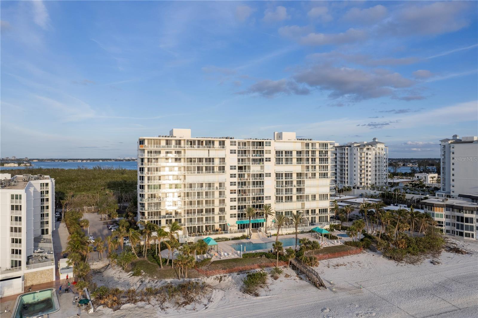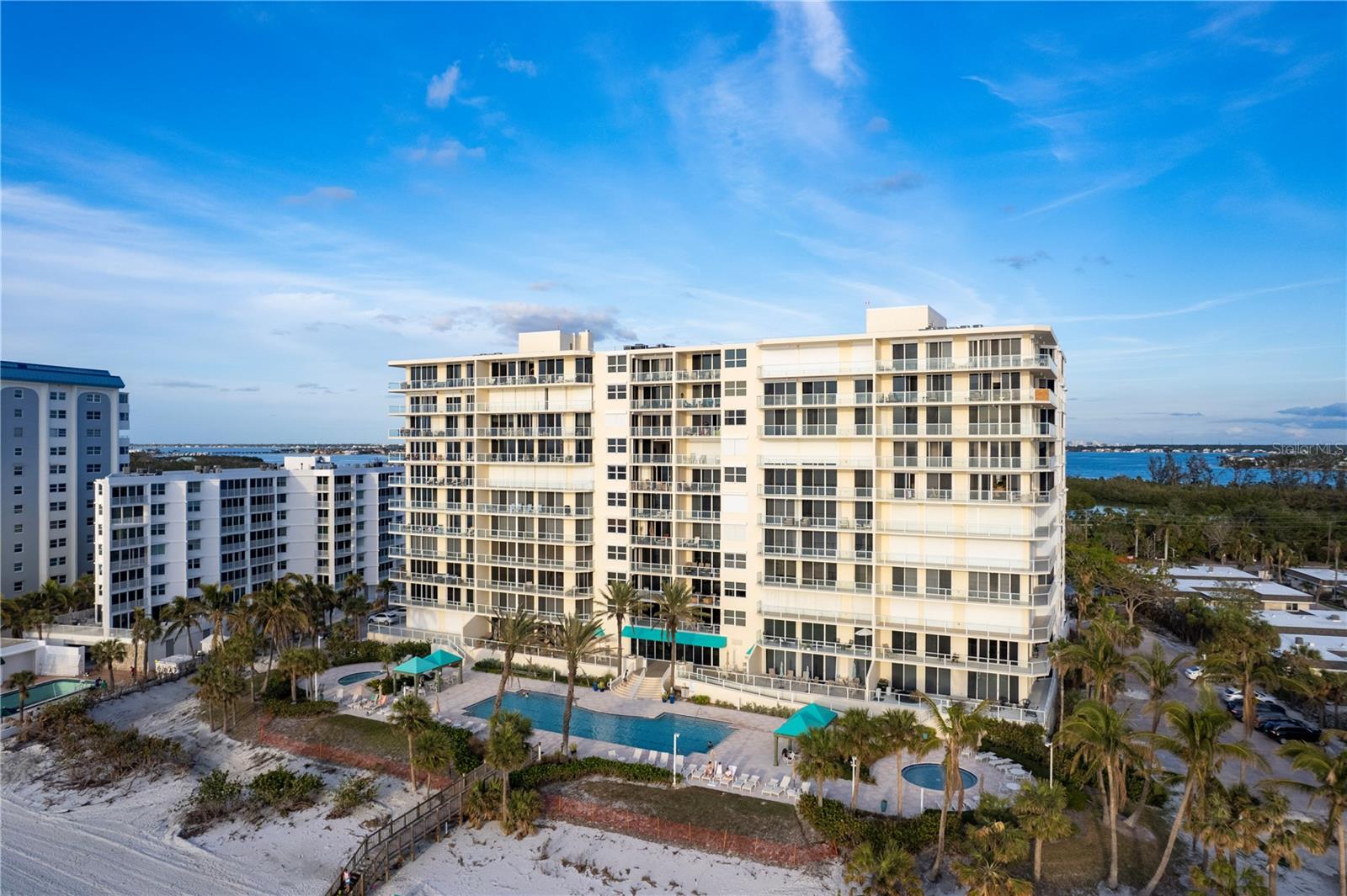 L’Elegance is a beautiful, gated community located directly ON THE GULF OF MEXICO specifically on Lido Key a barrier island, in Sarasota, FL. Lido Key is viewed as a more private beach that is more relaxing from tourists who come from around the world to visit. 1800 Ben Franklin Drive, B809. 2,230 (+/-) sq ft plus 340 sq ft of outdoor space. Expansive and unobstructed views of the Gulf of Mexico, downtown Sarasota, and Sarasota Bay. 2 bedrooms & den, 2. 5 bathrooms. This floor plan is the largest plan in the building. An open living/dining area with high ceilings, and floor-to-ceiling glass sliders with direct water views. The immense cook’s kitchen with a wrap-around bar area has a wine refrigerator, beverage cooler, stainless steel appliances, double ovens, plenty of counter space, an abundance of storage, and a breakfast nook. The preferred split floor plan with en-suites for everyone to have privacy and access to the balcony from your room. Enjoy sunrises from your east facing balcony overlooking Sarasota Bay and the city. Delight in the ever changing sunsets from the west facing gulf balcony. The main suite has an enormous wrap-around walk-in closet, it is a must-see! The renovated main bathroom includes double sinks and a huge linen closet. The flex space next to the kitchen is perfect for a den or home office. A separate laundry room with a full-size stackable washer & dryer, storage, and counter space. L’Elegance offers resort amenities including an 85’ lap pool which is heated year-round, a spa with Gulf views, a wading pool, two Har-Tru tennis courts, and a gym with dry saunas in both men’s and women’s locker rooms. Other amenities include underground assigned parking, a security guard at the gate, onsite maintenance staff, and wireless internet access throughout the common area. Storm shutters included.