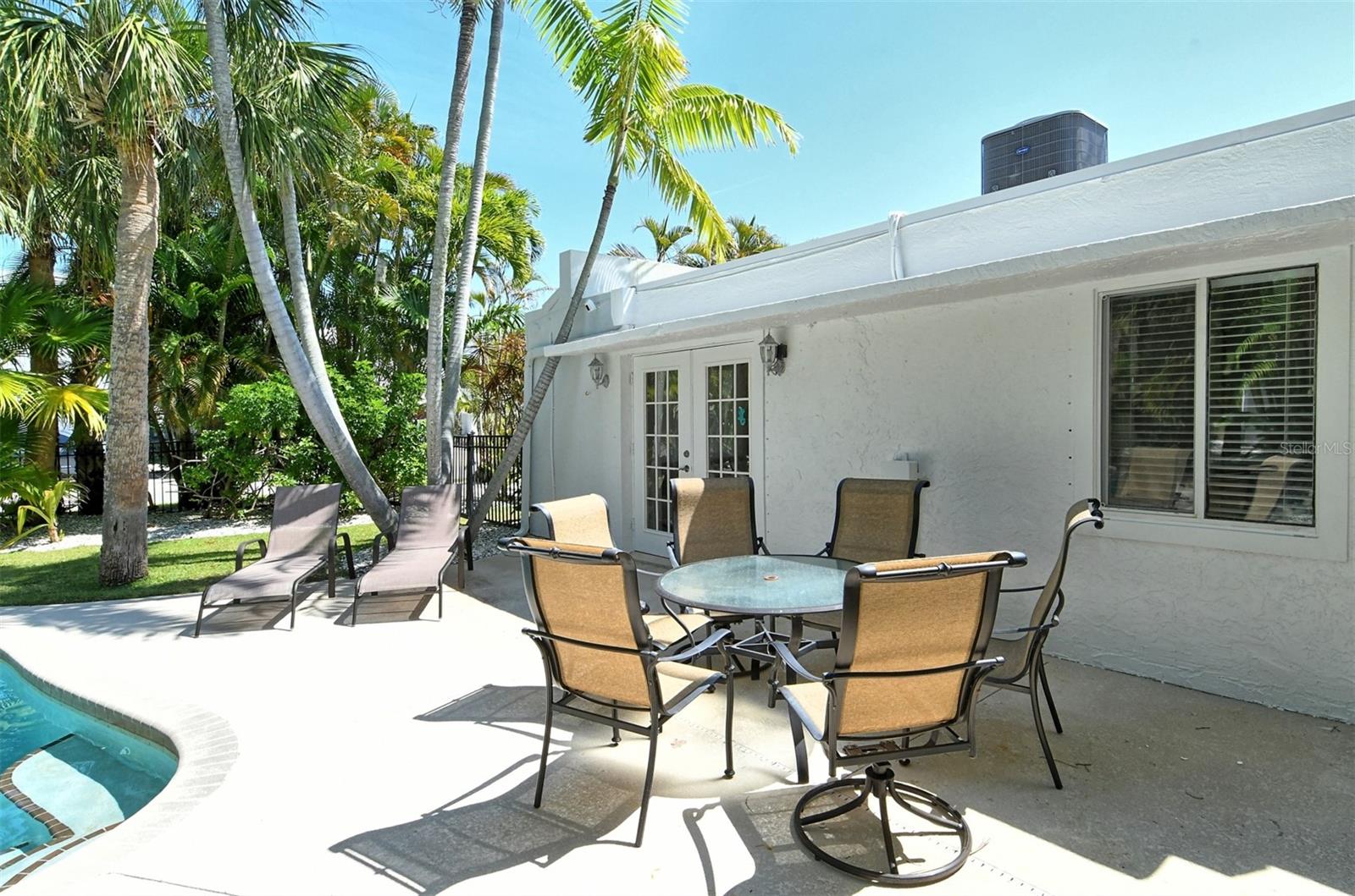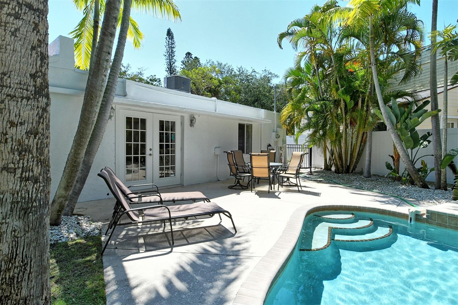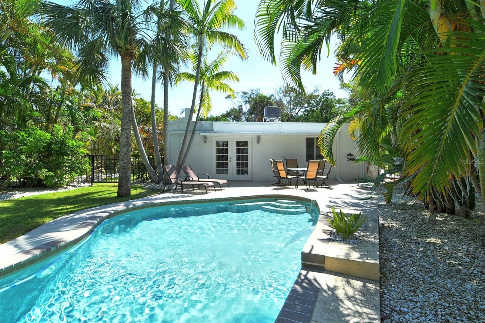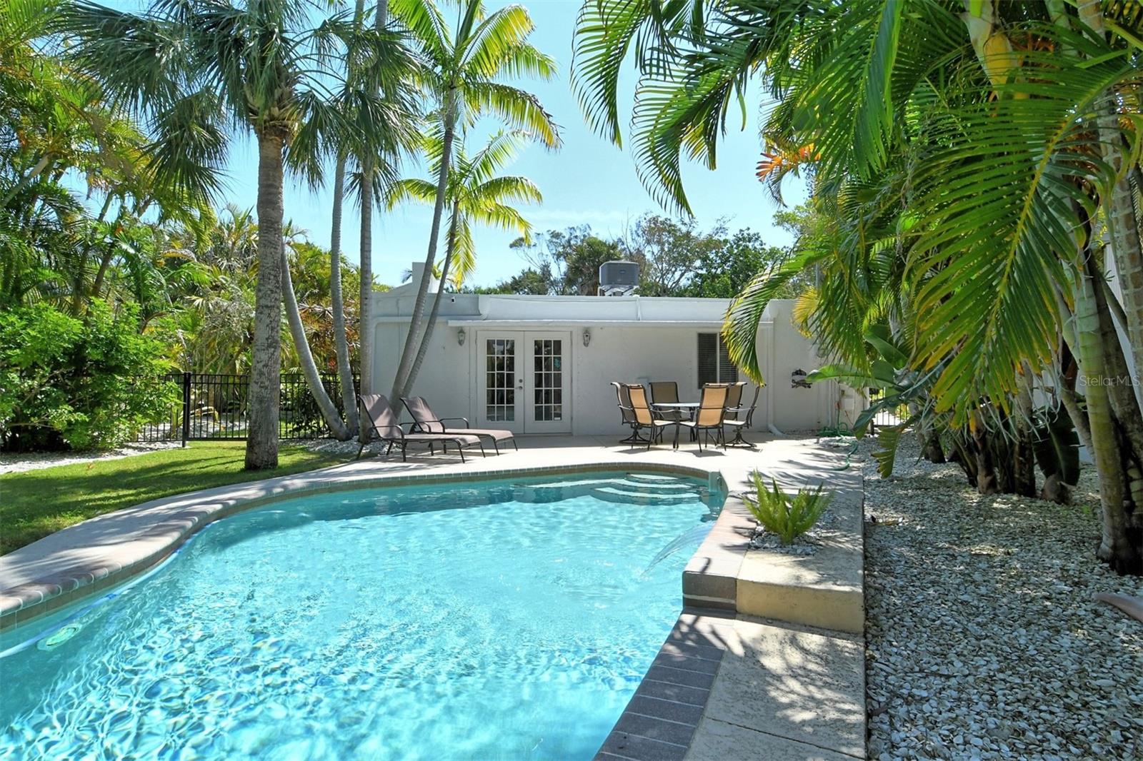 Introducing "Casa del Sol," a captivating Spanish-style beachside residence in the heart of Siesta Key’s coastal paradise. This remarkable 3 bedroom/2 bath home offers an elegant and timeless coastal charm. The home is richly detailed with beamed ceilings, and numerous porches, patios, and picturesque settings for outdoor entertaining. This oversized corner lot boasting approximately 200ft of frontage provides lush, mature tropical landscaping with numerous stunning specimen palms creating the ultimate in privacy. Once inside you are greeted by an abundance of natural light from the expansive great room which opens to the heart of the home, the chefs kitchen featuring high-end appliances, Granite countertops providing ample prep space, additional seating and custom built-in cabinetry. The spacious primary suite features French doors which lead to a private patio for that resort style relaxation anytime of day. The dining room also features French doors which leads outside, where paradise awaits with a large swimming pool & waterfall for refreshing dips on sunny days. This exceptional property’s location not only provides unparalleled access to the coastline but is just footsteps to Siesta Key’s most celebrated restaurants, shops, and beaches. Embrace Casa Del Sol’s coastal allure and make it yours!