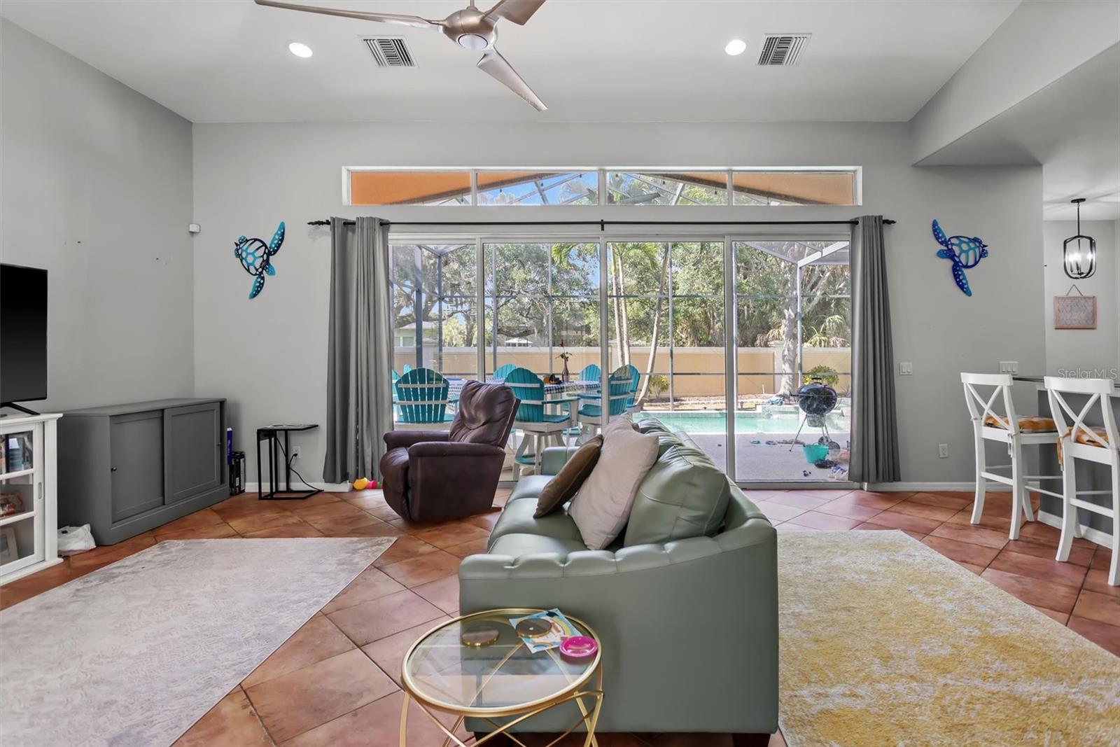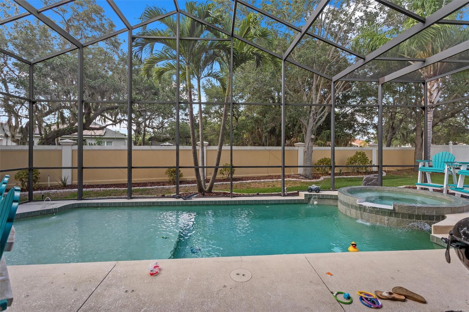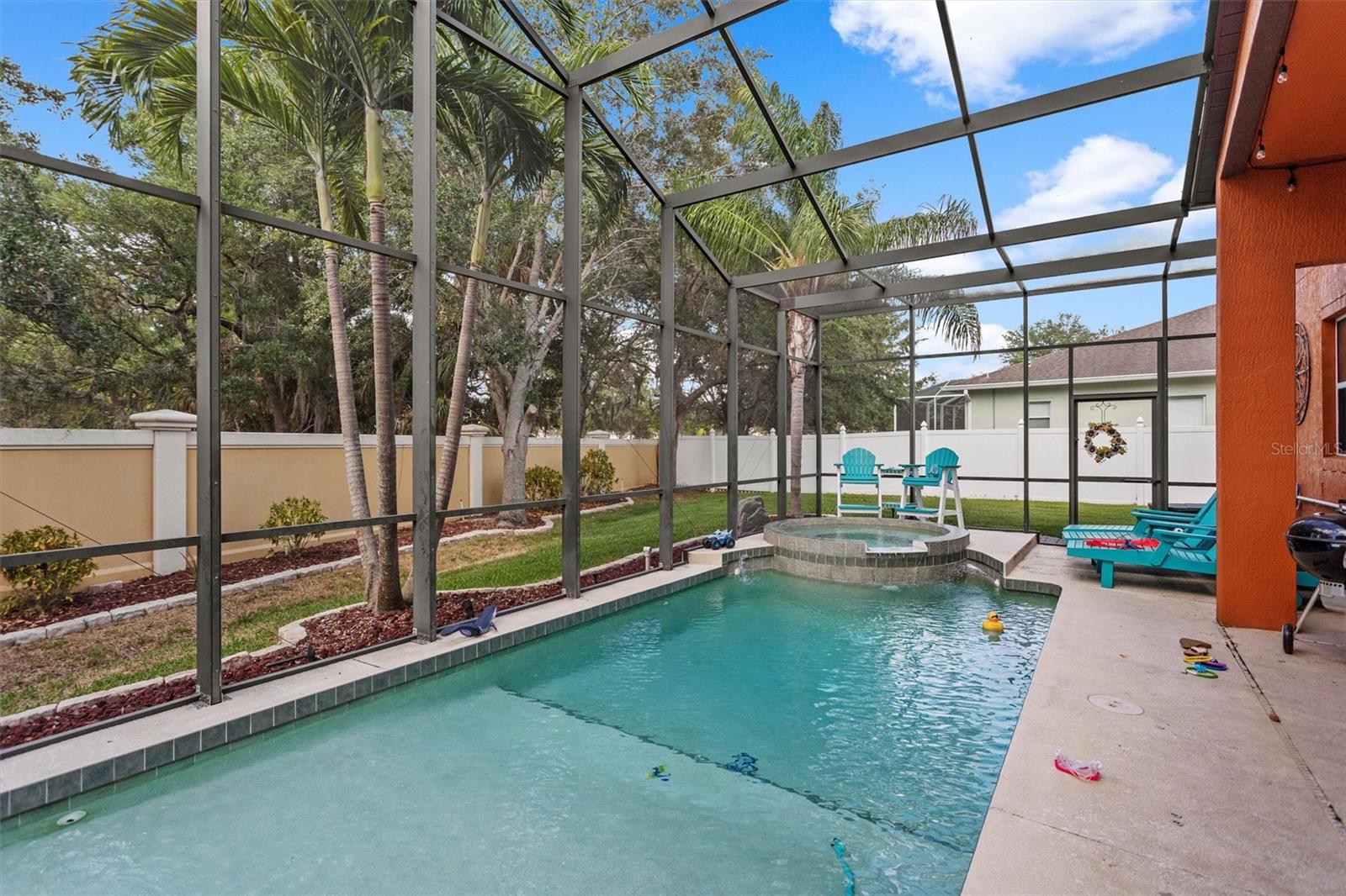 The perfect combo of size, location, elevation, and layout this 5 bed, 4 bath, 3 car garage with pool home is move in ready and waiting for you! You'll love the high ceilings, lots of natural light and incredible amounts of storage. When entering the home, the open floor plan, soaring high ceilings, sparkling pool, and lush backyard greet you and your guests. The living room is spacious and when the sliders are opened up it is even more spacious! The pool deck becomes almost an extension of the living room, bringing the outdoors in! The kitchen is the central gathering space, with a large functional island, smaller staging island, and a built in breakfast nook bench with even more storage underneath! Off the kitchen is an office/ den space that used to be used as a formal dining room. There is one full bedroom on the ground floor with a full bathroom as well. Upstairs, the owners suite is large and in charge! The en-suite bath features a soaking tub and walk in shower, his/hers vanities, and even a bidet! You'll struggle to fill the walk in closet, the size of another bedroom! The 2nd and 3rd bedrooms are connected through a Jack and Jill bath, and the 4th bedroom comes with a private en-suite bath. The interior laundry room has extensive storage. Sellers willing to give repair and painting credits. Roof replaced in 2022. No damage from the storms! Flood Zone X !