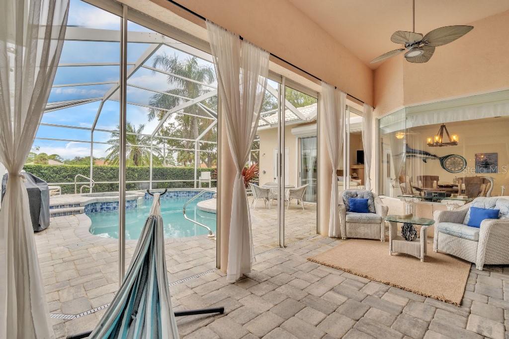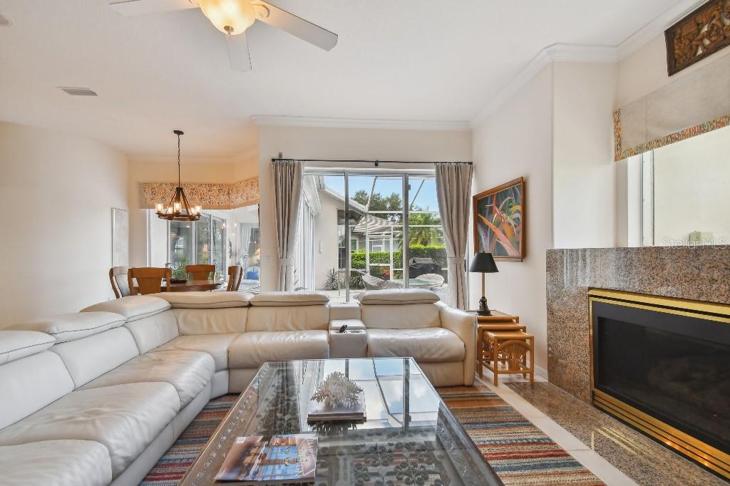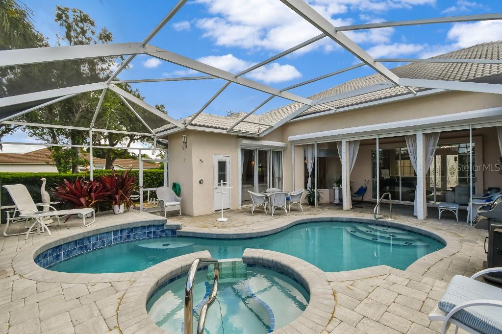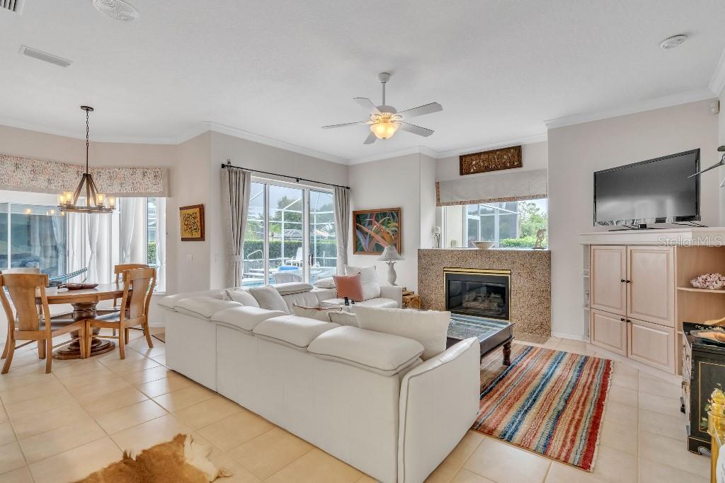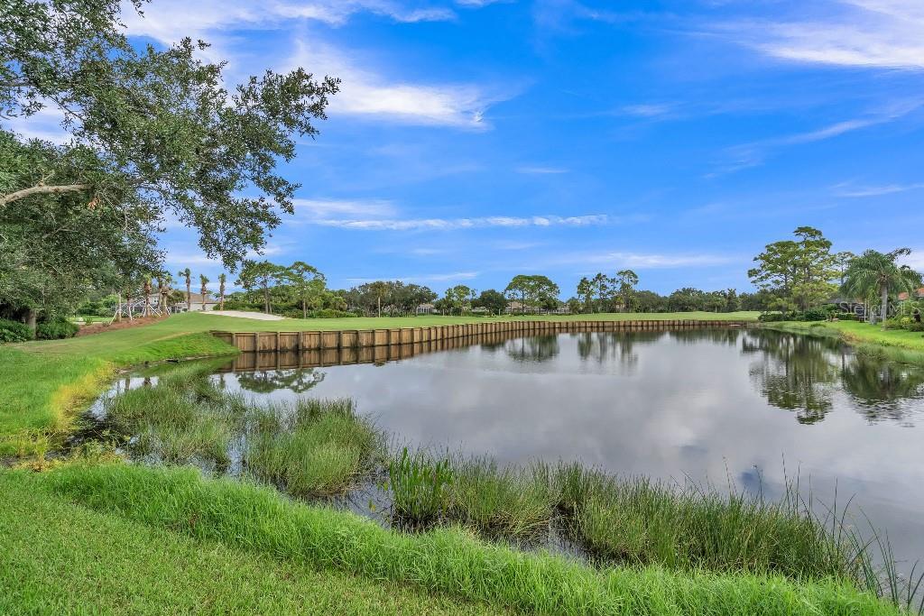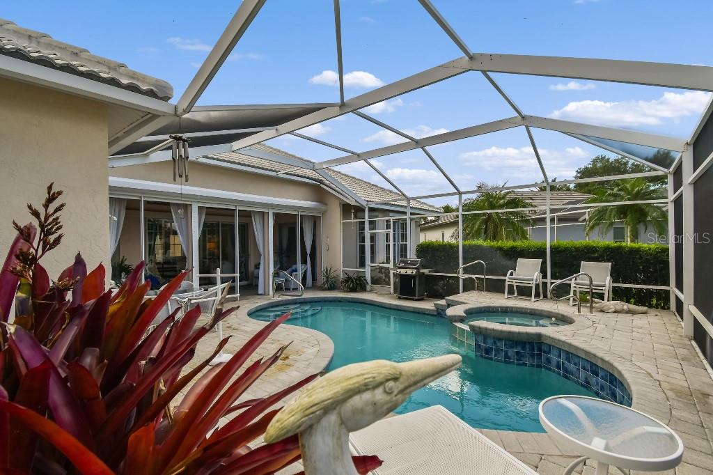 ACCEPTING BACK UP OFFERS!! Welcome to Stoneybrook Golf & Country Club-a true southwest Florida lifestyle community offering the best combination of location and conveniences. Community amenities include the new Kipp Schultes designed 18-hole golf course and pro shop, four lighted Har Tru tennis courts, fitness center, Bocce ball courts, walking trails, a full-service restaurant, award-winning community ponds. The community is also a five-minute drive to Costco, Publix and shopping and less than 8 miles from Nokomis and Siesta Key beaches. This special home is one of the largest in the entire community and is located on the corner lot in the highly desired area of Stoneybrook called Grey Oaks Estates, where life is easy and you can just walk to the Clubhouse. The tile roof was replaced in 2017 with wind mitigation report to reduce insurance cost. For added security, the home has combination electric and accordion hurricane shutters throughout. The hot water tank was replaced in 2021 and home has a 250-gallon underground propane tank. The special assessment on the new golf course is paid in full! As the model home, all of the rooms are big! Big living room, big kitchen, big family room, big bedrooms!! Boasting 3,031 sf, this one-story home has 3 bedrooms, plus den with 2 full baths, 2 half-baths and a two-car garage. As you enter, you are greeted with expansive floor-to-ceiling sliding glass doors that open to private pool views with low maintenance landscaping with pond views beyond. The formal living/dining room with hardwood floors and 16-foot ceiling is ideal for entertaining, while the large family room off the kitchen is perfect for casual gatherings. The large kitchen includes granite countertops, new LG stainless steel appliances and pull-out cabinet drawers; aquarium glass surrounds the dinette area, and the fireplace is perfect for those few chilly days in winter. The split floor plan maximizes privacy. On one side, retreat to the spacious main bedroom, with dual walk-in closets and bay windows that look out onto a private garden. The en suite has dual sinks, soaking tub and a separate shower and vanity. The light and bright den offers coffered ceiling and built-ins that can accommodate a 70” tv and separate library-style bookcase; it makes for a great executive office or 4 th bedroom. The two guest bedrooms are spacious & have delightful views of mature foliage with their own full bath. Each side of the home has an independent A/C system; new A/C replaced in 2022. There is a separate laundry room with sink and cabinets. For a quick suit change after a day by the sparkling pool with waterfall hot tub, you can use the outdoor shower and half bath. The pool pump and heater were replaced in 2021. The covered lanai, with dual ceiling fans, can be accessed from sliding glass doors from the living room, the kitchen/family room, and main bedroom. The west coast of Florida is known for offering the best of indoor/outdoor living and this home has it all.