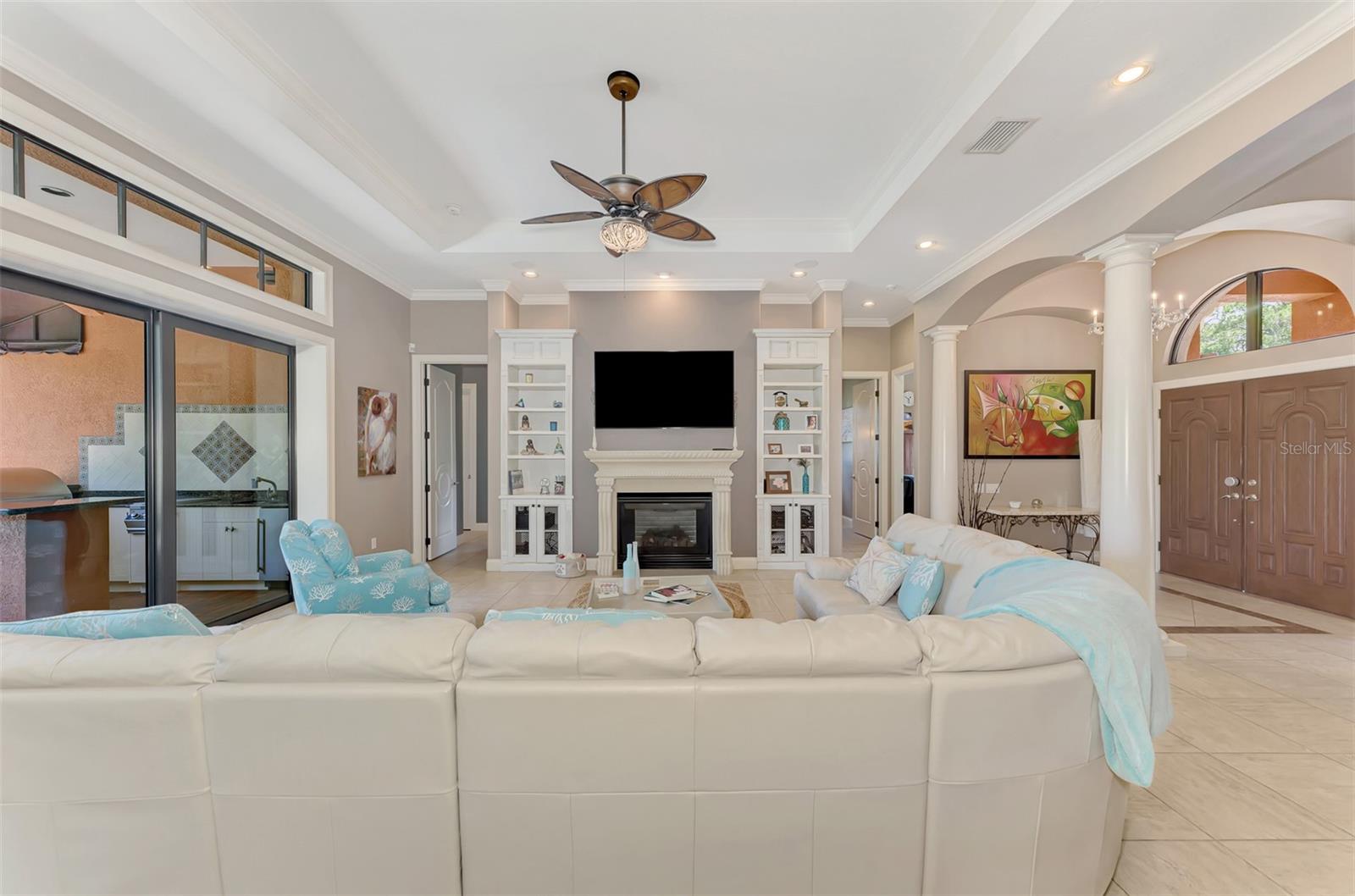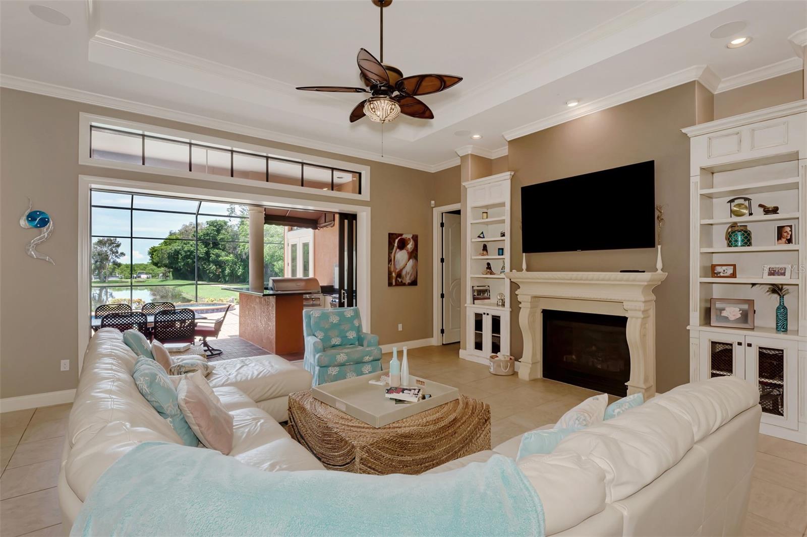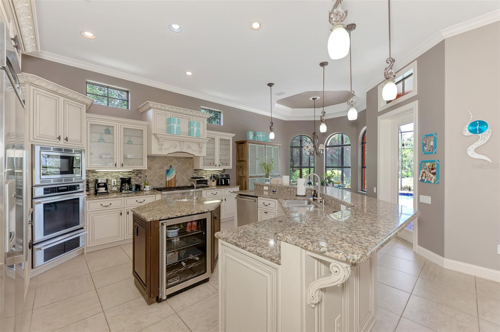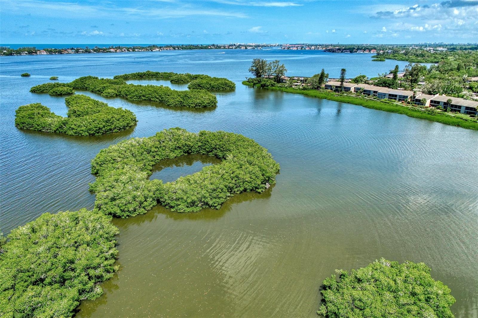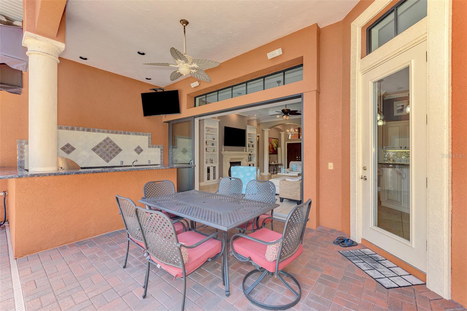 Beautiful Mediterranean style luxury home built in 2010 by Todd Johnston, who is one of Sarasota's most respected high end builders. Incredible sunset views await from the first floor that overlooks the pond and boat docks. Amazing views from the 2nd story balcony/sun deck that overlooks the pond, boat docks and Intracoastal waterway. This 4 bed, 3.5 bath open layout home includes large pocket sliders to the pool area, stainless appliances, inside kitchen with large bar seating, granite countertops, an island with a sink, gas cooktop, gas fireplace, outdoor kitchen with bar, heated pool with spa, air conditioned oversized garage and driveway. Master bedroom and bath are on the first floor with 2 sets of French doors leading to the pool area. Upstairs boasts 3 bedrooms, one with a full bath and another shared full bath. Central air throughout with upstairs and downstairs on 2 separate zones/thermostats. Both air conditioners replaced in 2022 and 2023. The Portofino on the Bay gated community has a kayak launch and boat day dock for all residents to use and there are kayak racks for rent for a minimal fee per year. There may be boat slips available for purchase with lifts from other owners, but you should check with the HOA manager for availability. Come live the Florida waterfront lifestyle in a peaceful setting close to beaches, shopping, restaurants and medical facilities. Air compressor, Tesla EV Charger do not convey with sale.
