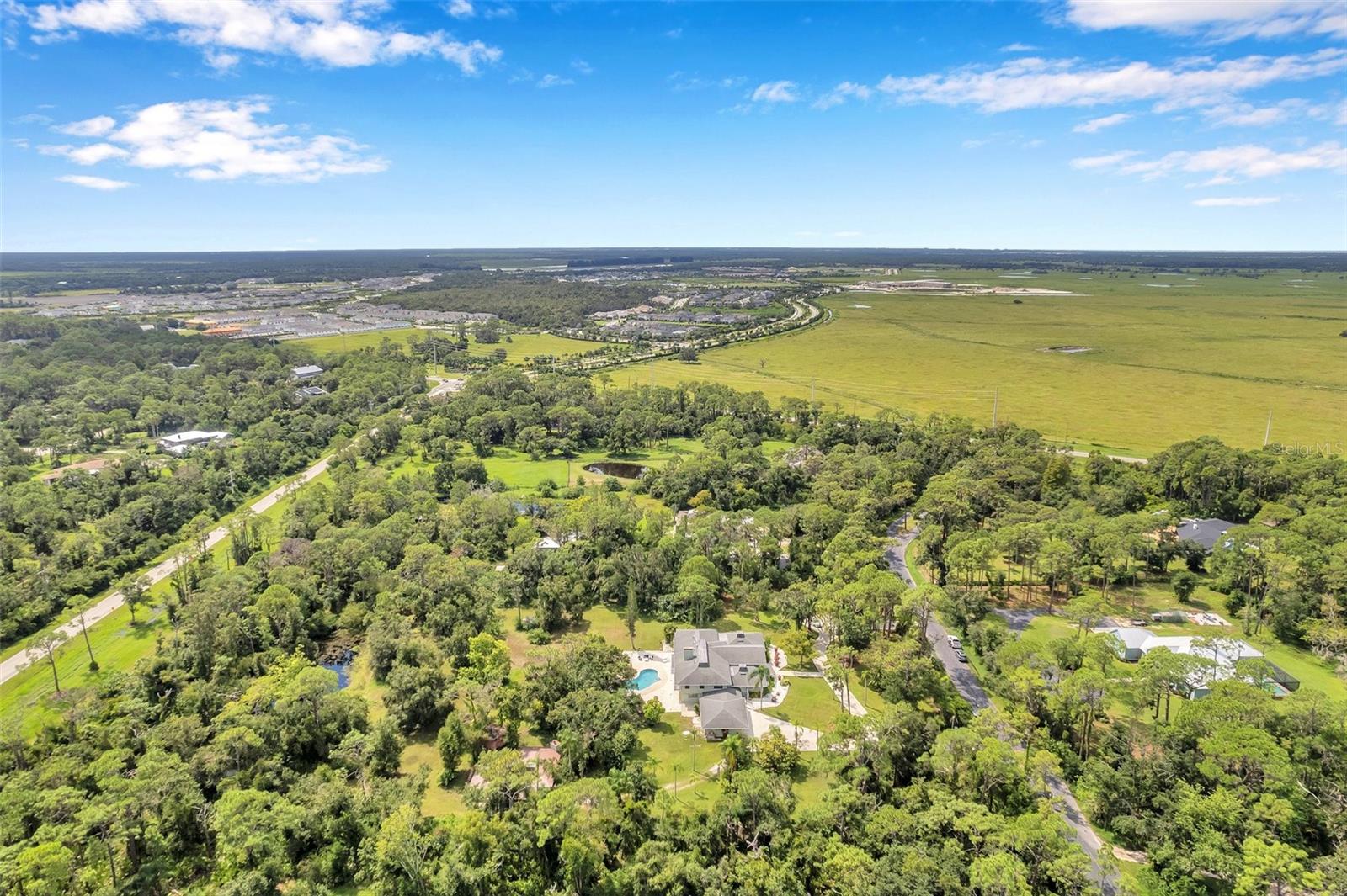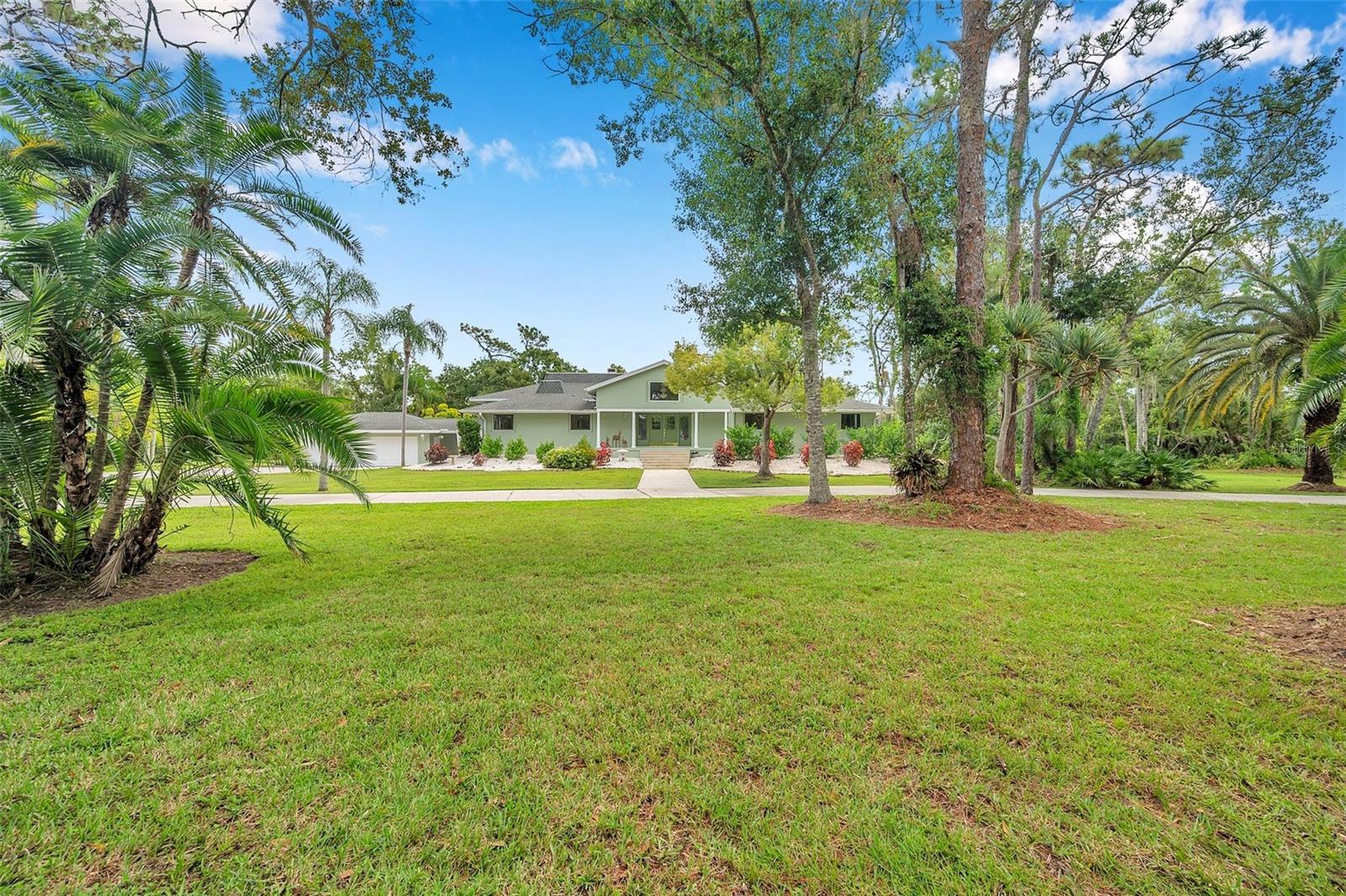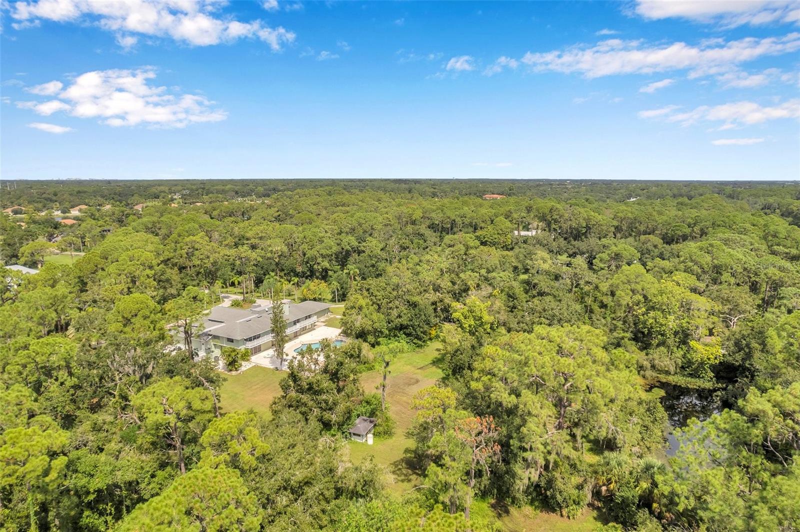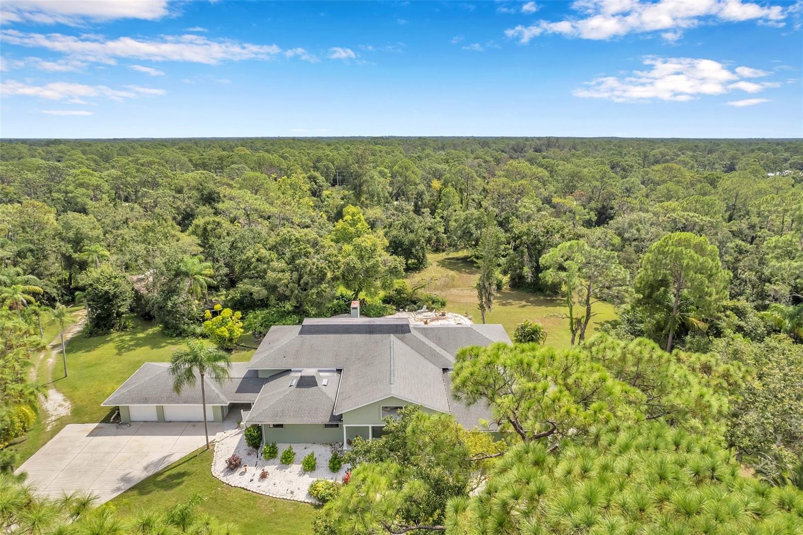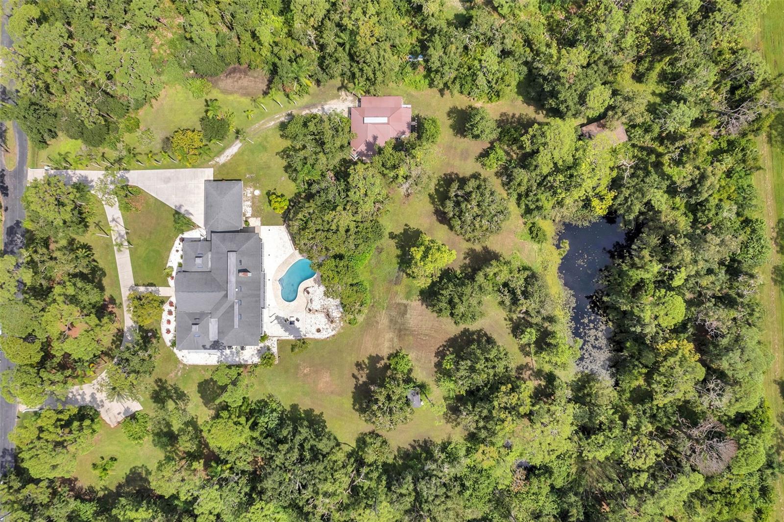 One or more photo(s) has been virtually staged. This rare estate size mid-century modern split level home on 5 wooded acres seamlessly blends minimalist elegance with natural surroundings offering a peaceful private retreat. The main house is approx. 7,000 sqft of expansive living space with 5 bedrooms/5 baths that includes 4 en suites, each over 500 sqft. The front doors open to the 2d level living room with a view through the center of the home to the pool and backyard blurring the lines between indoor and outdoor living, reminiscent of the Sarasota School of Modern Architect embracing natural elements with old Florida charm. The back of the house has over 50 feet of ceiling to floor glass doors and windows filling the house with light. The 1st and 3rd levels open directly onto the large pool deck. The 1st level kitchen/dining room is approx 840 sqft and opens to the 810 sqft family room with a large wet bar with space for another full refrigerator. Centering the room is a travertine fireplace that warms the heart of the home in the winter. The en suite bedroom on the 1st level can also be used as a home gym. The 3rd level has 2 en suite bedrooms, including the primary, both with access to the balcony that stretches the length of the house, a great spot to enjoy morning coffee while watching the sun rise or for the band, choir, or music ensemble to entertain at your outdoor parties. There is also a built in office on the 3rd level that can easily be converted to a master dressing room or nursery. The 2d level faces the front of the house and has 2 more bedrooms, one an en suite and the other has a bathroom just outside its door to be shared with guests. An additional storage room and large laundry room are also on the 2d level. All of the bedrooms are large enough for king beds, sitting/study areas, with lots of storage. Each of the levels has a living room and library. The large front circular driveway can easily park 20 cars; has a basketball area; and an attached 3 car garage with a covered breezeway to enter the main house kitchen. The property is wrapped in trees offering privacy in a park like setting teeming with Florida wildlife and has several fruit trees and a large pond. Behind the main house is a separate, detached, 1 bedroom/1 bath cottage, approx. 1,000 sqft, with a fireplace/pizza oven and 30ft of glass doors. Further back is a separate detached workshop/storage building that can be converted to a barn. Horses are welcomed! Located in coveted Timberland Ranchettes, a neighborhood of 13 homes just 3 miles east of 75 and only 10 miles to Siesta Key, across from Skye Ranch. This exceptional property is ready for you to add your personal touches and create your own retreat.